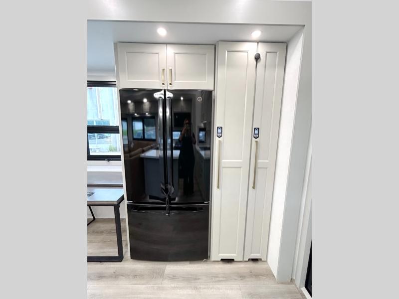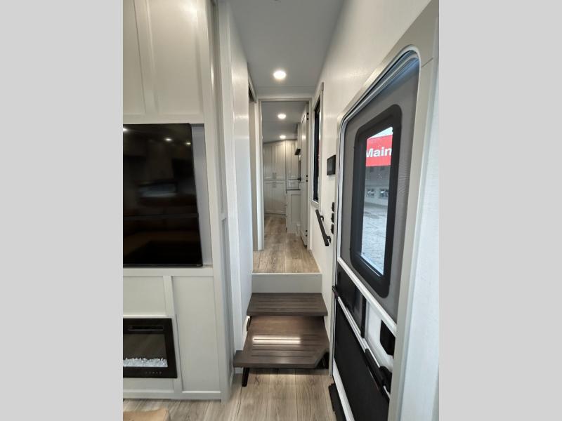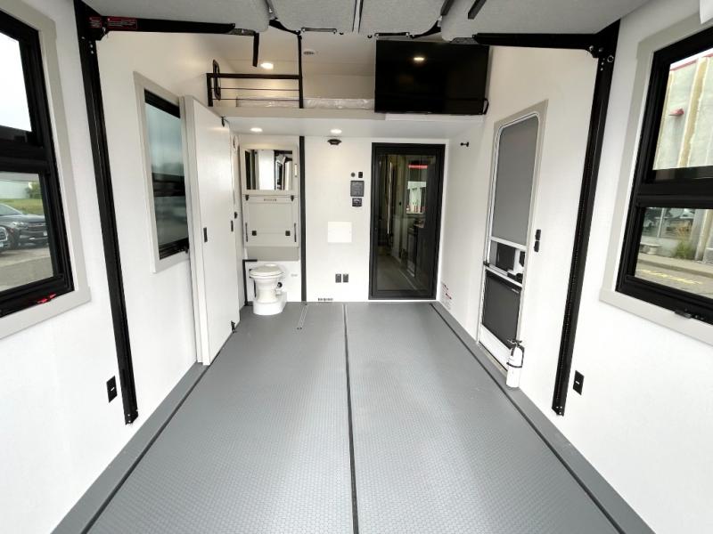 This toy hauler may just be the one you've been looking for! The garage/flex space with fold-away half bath walls will allow you to utilize the garage how you need it, plus there is an adjustable tie-down system, independent dual sofas, plus a loft for storage and a twin bed to sleep more campers! The garage patio with a 1,500 lb. capacity is another feature you are sure to love, especially with its own awning to keep you protected from the elements. Head to the kitchen to prepare meals with a 24" GE oven with a four burner range, a GE microwave with an air fryer, plus a spacious GE Energy Star 19 cu. ft. refrigerator. The island with two stools will let others visit with you while you cook, and there are even hidden dog bowls. You'll find the convertible dining table/L-desk will be accommodating since it can be use to dine at, and to get some work done. You may just find yourselves spending most of your time on the U-sofa in front of the TV and fireplace. A full bath is up front by the bedroom, and here you'll find neon shower lighting, a residential shower system, and pull-out linen storage to keep towels ready to use. After a day outdoors you'll love nothing more than coming back to your own bedroom with a king bed slide out, TV, a walk-in closet, and many more storage spaces. And we haven't even touched on the exterior features, like the 3-way pass-through storage, three power awnings, an air compressor to fill up tires, and the list goes on and on! This is a pre-production preview, all features and layout placement subject to change.