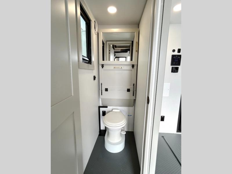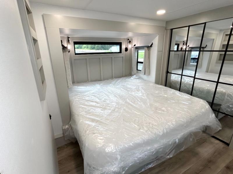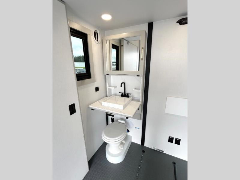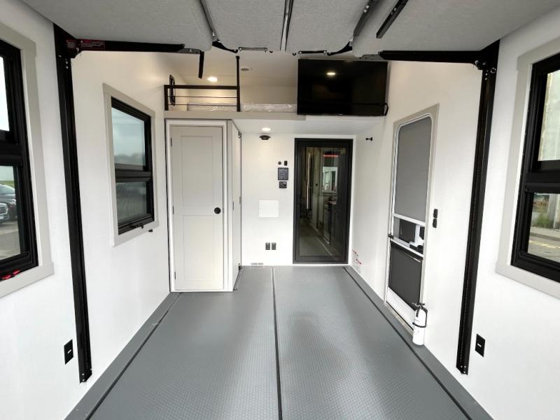 This toy hauler may just be the one you've been looking for! The garage/flex space with fold-away half bath walls will allow you to utilize the garage how you need it, plus there is an adjustable tie-down system, independent dual sofas, plus a loft for storage and a twin bed to sleep more campers! The garage patio with a 1,500 lb. capacity is another feature you are sure to love, especially with its own awning to keep you protected from the elements. Head to the kitchen to prepare meals with a 24" GE oven with a four burner range, a GE microwave with an air fryer, plus a spacious GE Energy Star 19 cu. ft. refrigerator. The island with two stools will let others visit with you while you cook, and there are even hidden dog bowls. You'll find the convertible dining table/L-desk will be accommodating since it can be use to dine at, and to get some work done. You may just find yourselves spending most of your time on the U-sofa in front of the TV and fireplace. A full bath is up front by the bedroom, and here you'll find neon shower lighting, a residential shower system, and pull-out linen storage to keep towels ready to use. After a day outdoors you'll love nothing more than coming back to your own bedroom with a king bed slide out, TV, a walk-in closet, and many more storage spaces. And we haven't even touched on the exterior features, like the 3-way pass-through storage, three power awnings, an air compressor to fill up tires, and the list goes on and on! This is a pre-production preview, all features and layout placement subject to change.