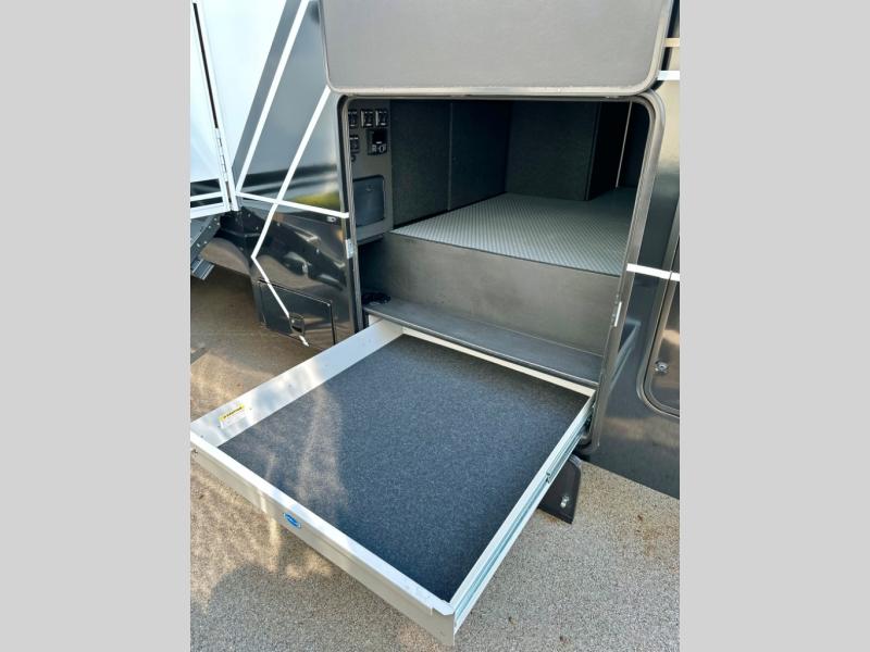 With any Model G toy hauler fifth wheel by Brinkley you will enjoy luxurious amenities, tons of storage space, and innovative features that have been developed and tested in the real world. Durable construction includes an industry leading PDI process, an industry best insulation package, and reinforced and walkable slide roofs. Some of the exterior features you'll find are a 3-way pass-through with a multi-functional flip-up bulkhead wall, under I-beam storage, a MAX-Vision reverse lighting system, and a low-maintenance roof to name a few. A Rockford Fosgate audio system comes standard, along with a OneControl app system that lets you control your fifth wheel's functions right from your mobile device. You will find the solar system with a designated storage area to be ultra convenient, plus there is a FlexPower 5500 with a dual fuel inverter generator for all your power needs. Head inside to find a residential interior with Brinkley's CraftSense wood trim construction, floating entrance steps, integrated window screens and insulated blackout blinds, and residential solid surface countertops plus backsplash. You will also enjoy the neon shower lighting and recessed medicine cabinets in the bath, plus motion activated LED bed lights and dual bedside outlets in the bedroom. Choose a Model G toy hauler fifth wheel to experience all the luxury it has to offer!