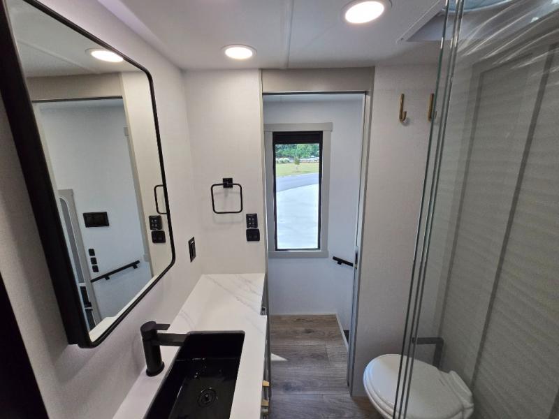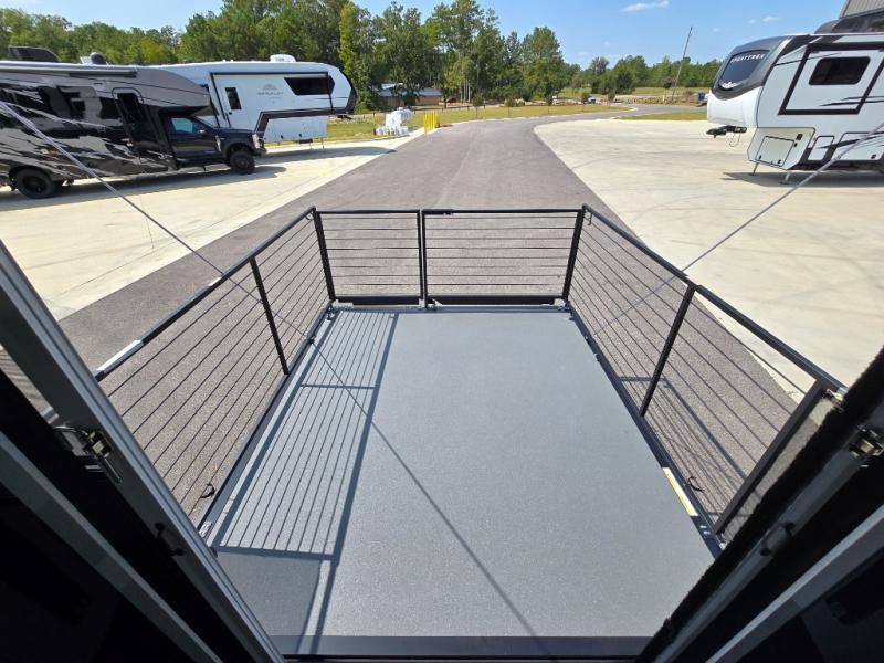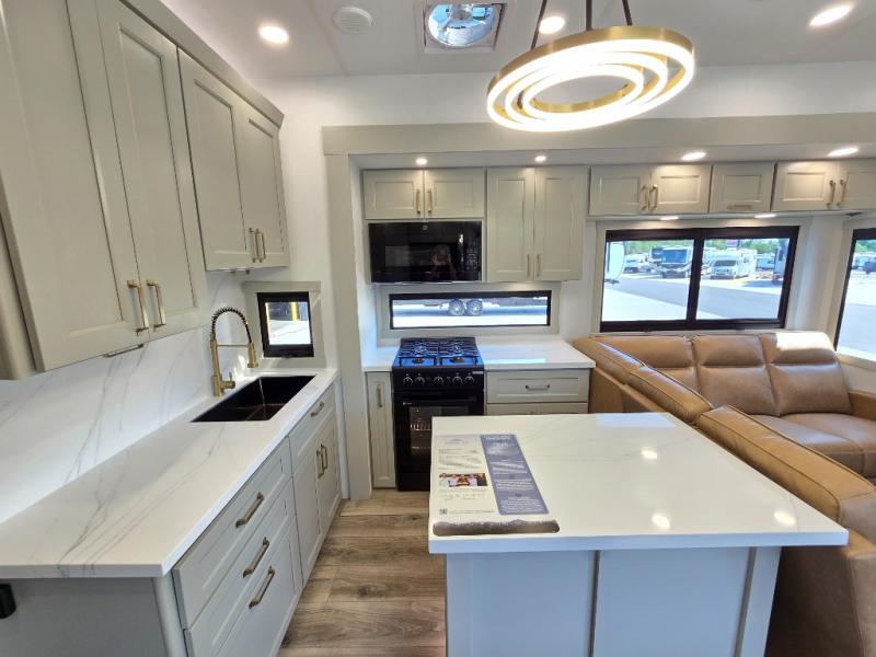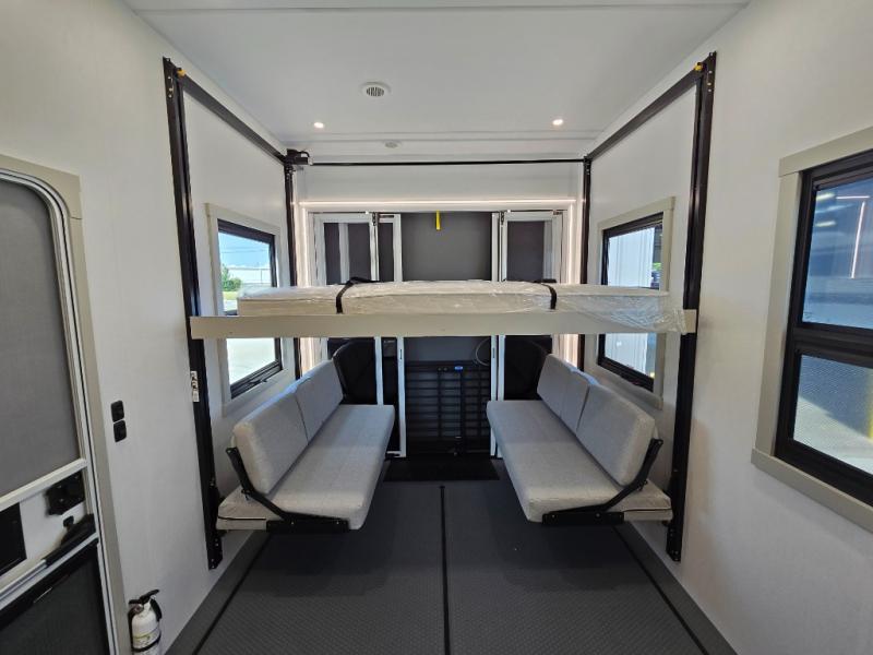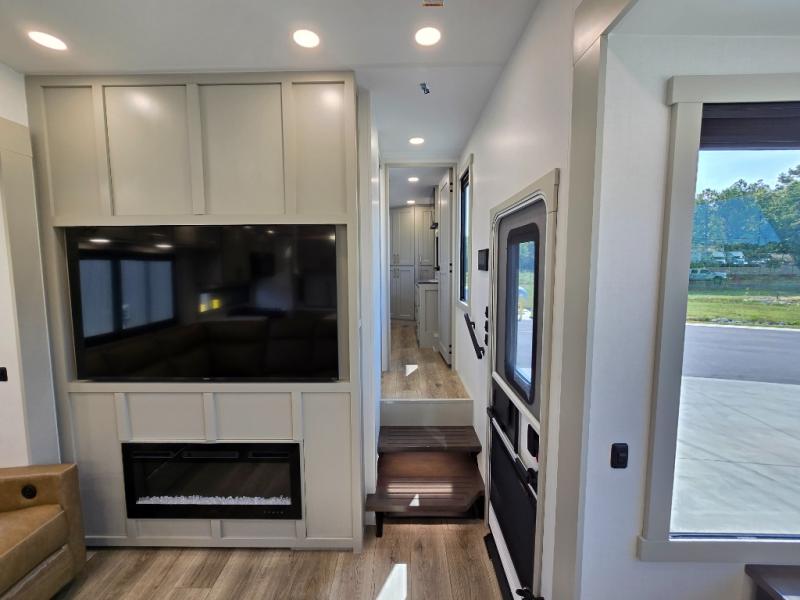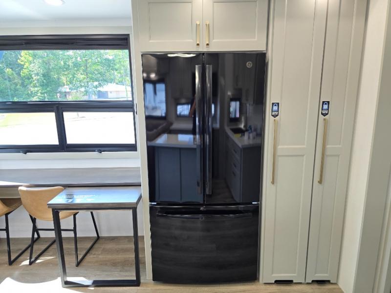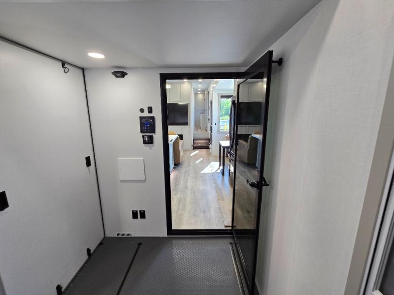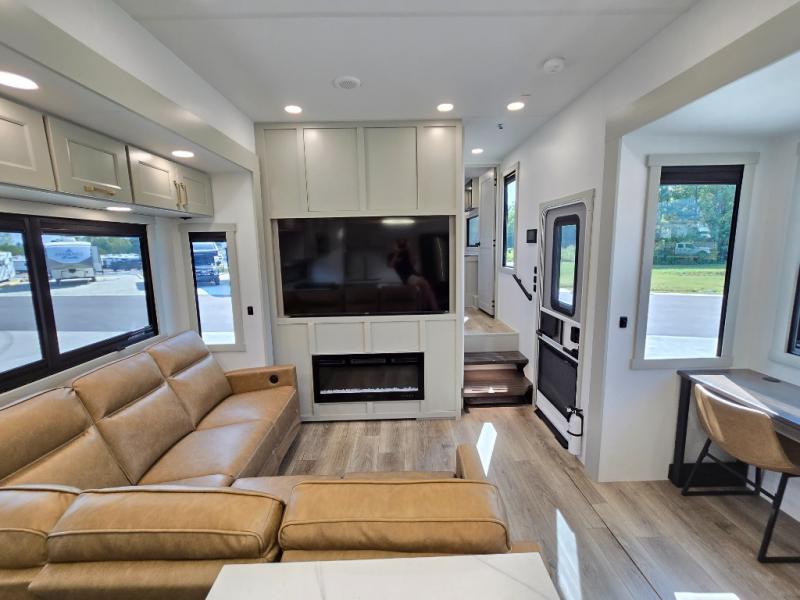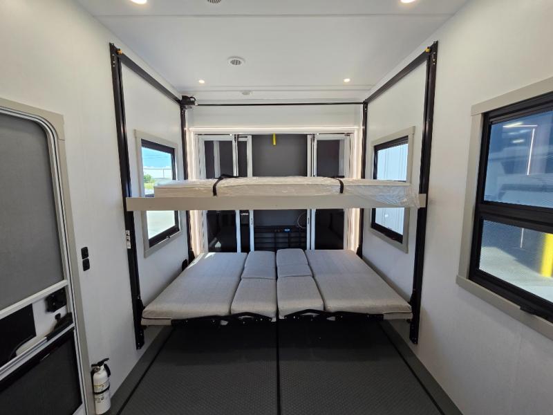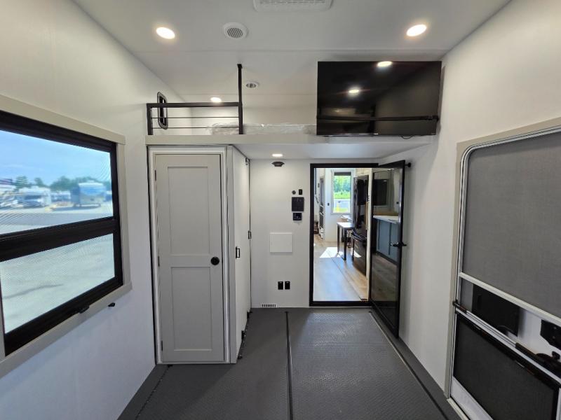 This toy hauler may just be the one you've been looking for! The garage/flex space with fold-away half bath walls will allow you to utilize the garage how you need it, plus there is an adjustable tie-down system, independent dual sofas, plus a loft for storage and a twin bed to sleep more campers! The garage patio with a 1,500 lb. capacity is another feature you are sure to love, especially with its own awning to keep you protected from the elements. Head to the kitchen to prepare meals with a 24" GE oven with a four burner range, a GE microwave with an air fryer, plus a spacious GE Energy Star 19 cu. ft. refrigerator. The island with two stools will let others visit with you while you cook, and there are even hidden dog bowls. You'll find the convertible dining table/L-desk will be accommodating since it can be use to dine at, and to get some work done. You may just find yourselves spending most of your time on the U-sofa in front of the TV and fireplace. A full bath is up front by the bedroom, and here you'll find neon shower lighting, a residential shower system, and pull-out linen storage to keep towels ready to use. After a day outdoors you'll love nothing more than coming back to your own bedroom with a king bed slide out, TV, a walk-in closet, and many more storage spaces. And we haven't even touched on the exterior features, like the 3-way pass-through storage, three power awnings, an air compressor to fill up tires, and the list goes on and on! This is a pre-production preview, all features and layout placement subject to change.