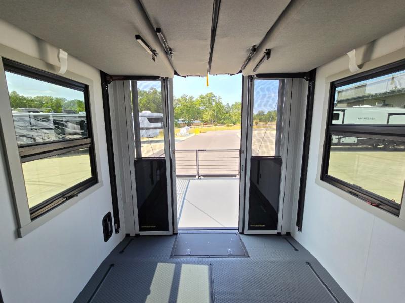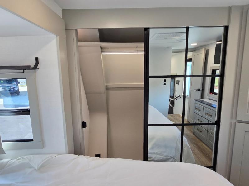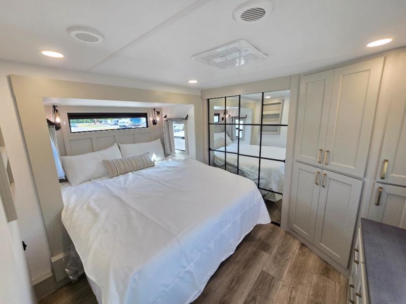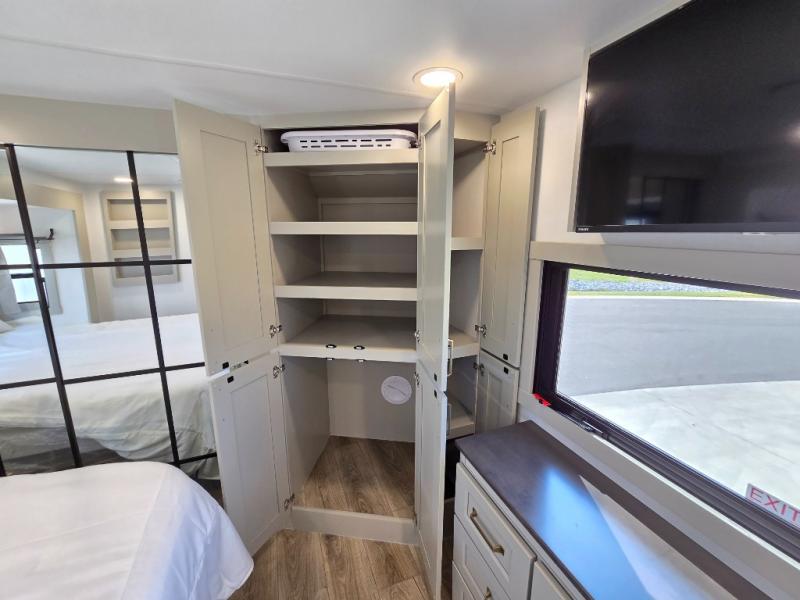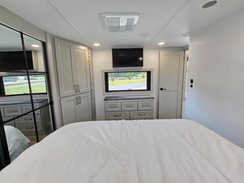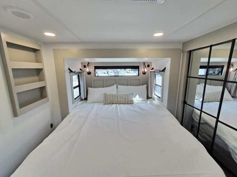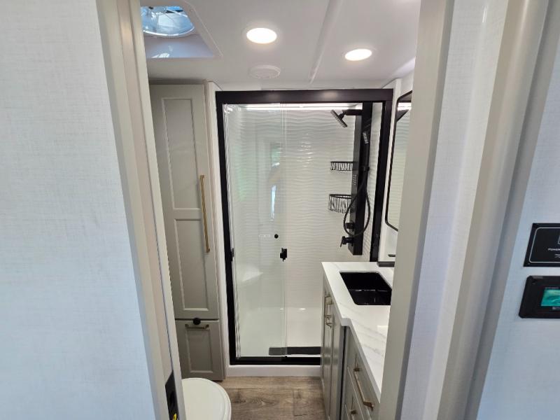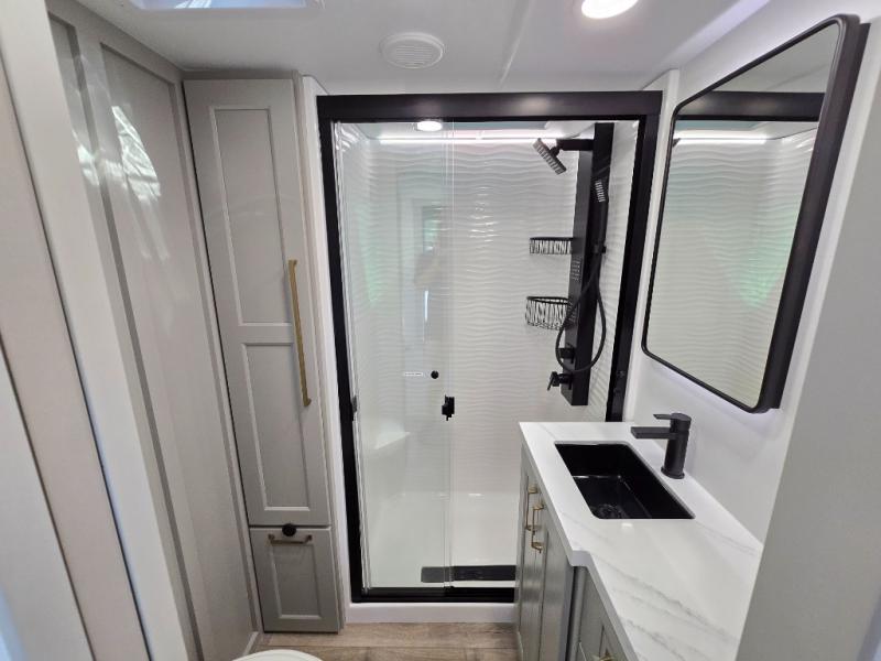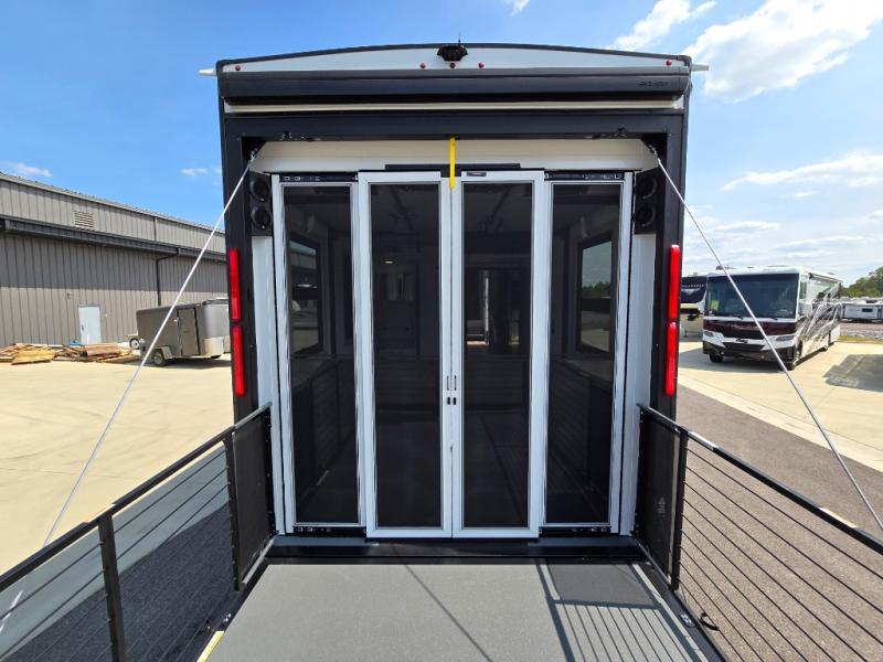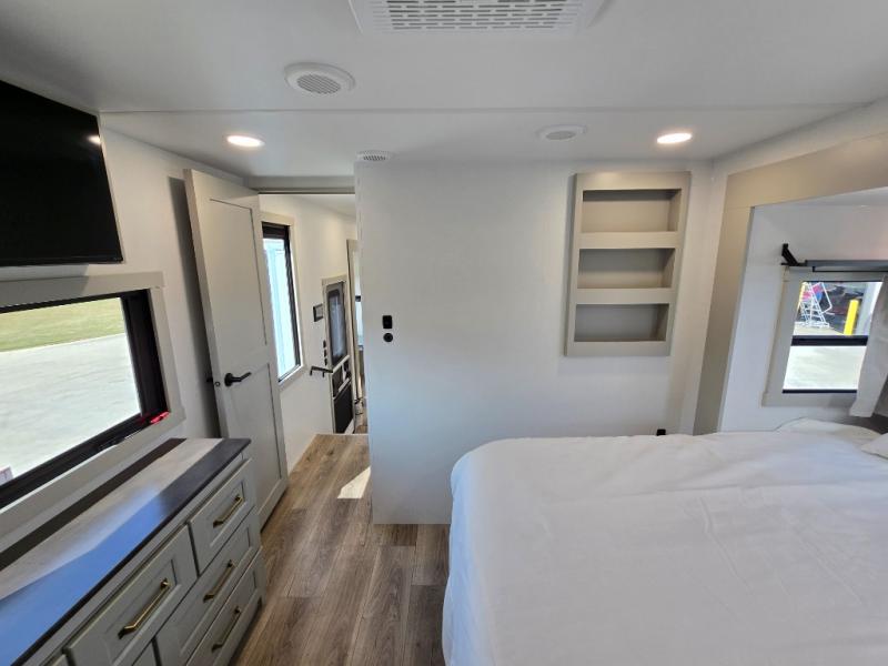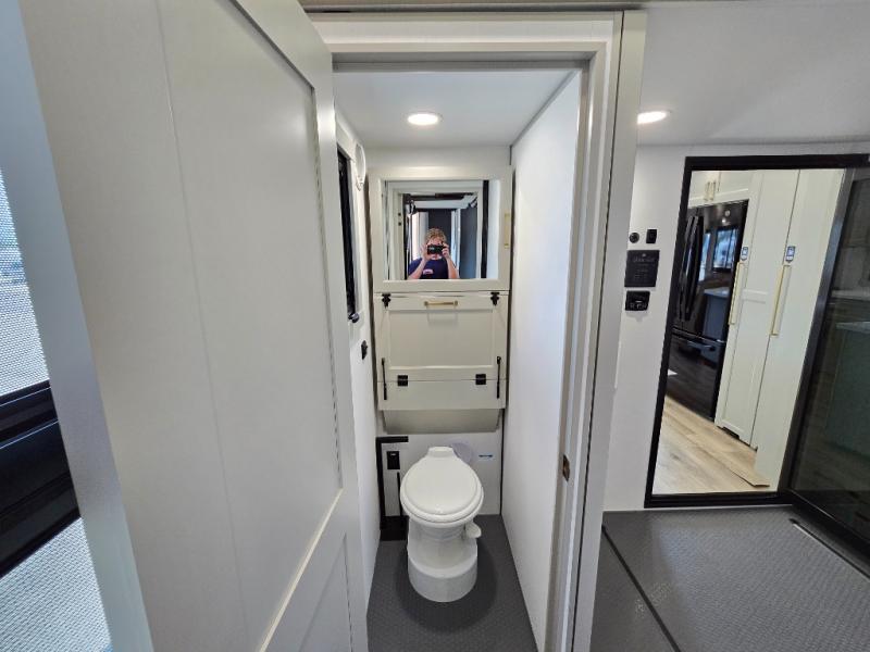 This toy hauler may just be the one you've been looking for! The garage/flex space with fold-away half bath walls will allow you to utilize the garage how you need it, plus there is an adjustable tie-down system, independent dual sofas, plus a loft for storage and a twin bed to sleep more campers! The garage patio with a 1,500 lb. capacity is another feature you are sure to love, especially with its own awning to keep you protected from the elements. Head to the kitchen to prepare meals with a 24" GE oven with a four burner range, a GE microwave with an air fryer, plus a spacious GE Energy Star 19 cu. ft. refrigerator. The island with two stools will let others visit with you while you cook, and there are even hidden dog bowls. You'll find the convertible dining table/L-desk will be accommodating since it can be use to dine at, and to get some work done. You may just find yourselves spending most of your time on the U-sofa in front of the TV and fireplace. A full bath is up front by the bedroom, and here you'll find neon shower lighting, a residential shower system, and pull-out linen storage to keep towels ready to use. After a day outdoors you'll love nothing more than coming back to your own bedroom with a king bed slide out, TV, a walk-in closet, and many more storage spaces. And we haven't even touched on the exterior features, like the 3-way pass-through storage, three power awnings, an air compressor to fill up tires, and the list goes on and on! This is a pre-production preview, all features and layout placement subject to change.