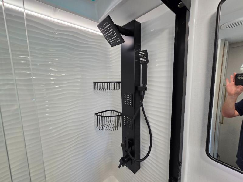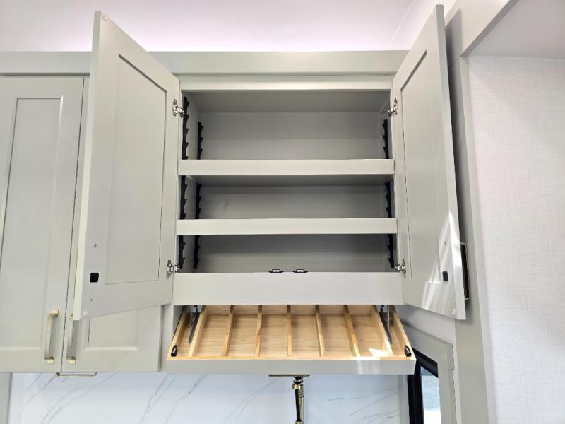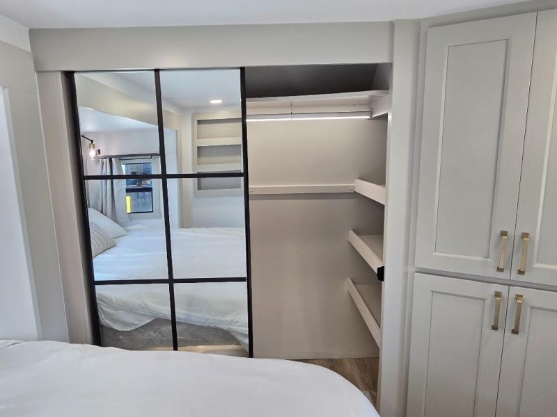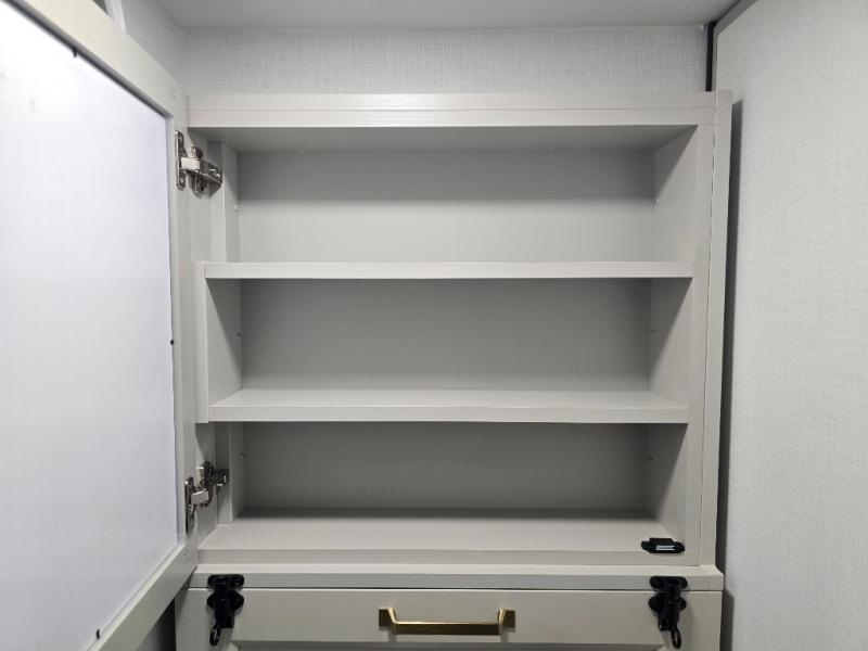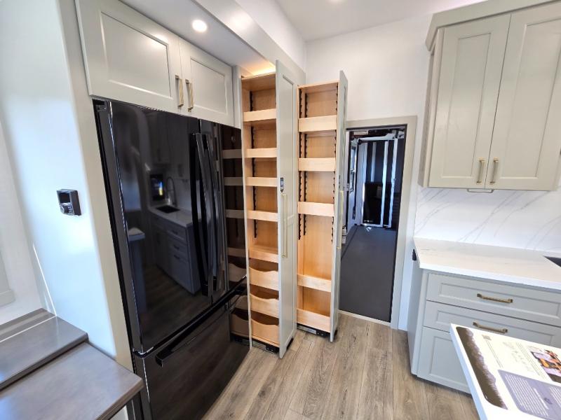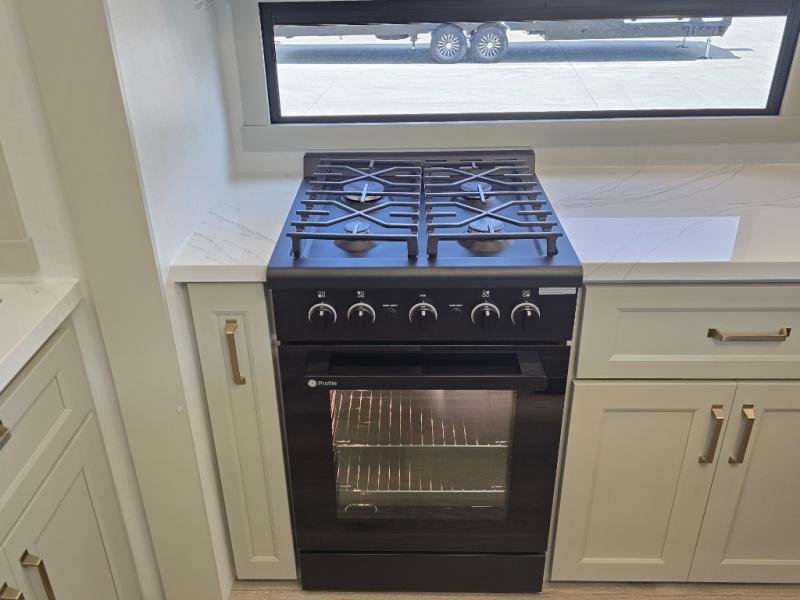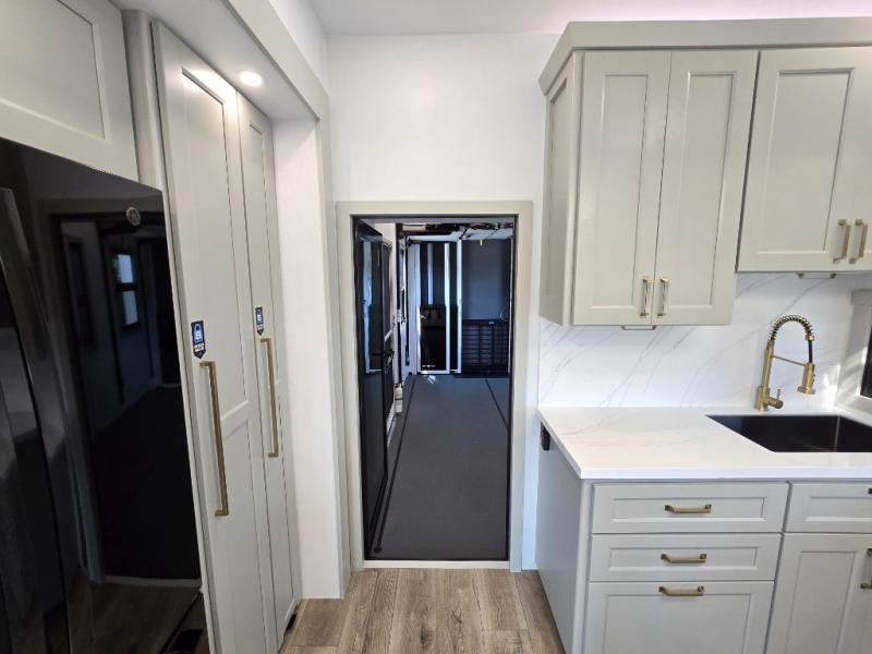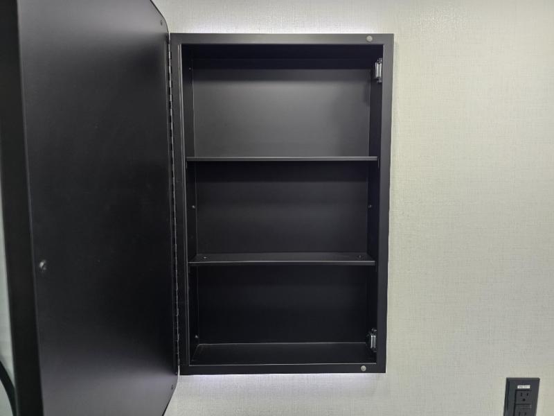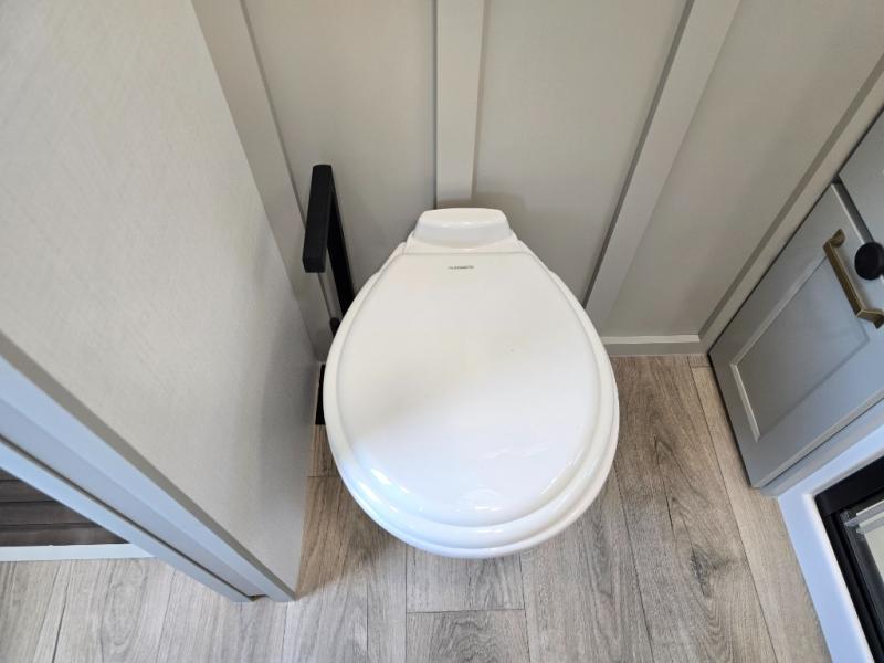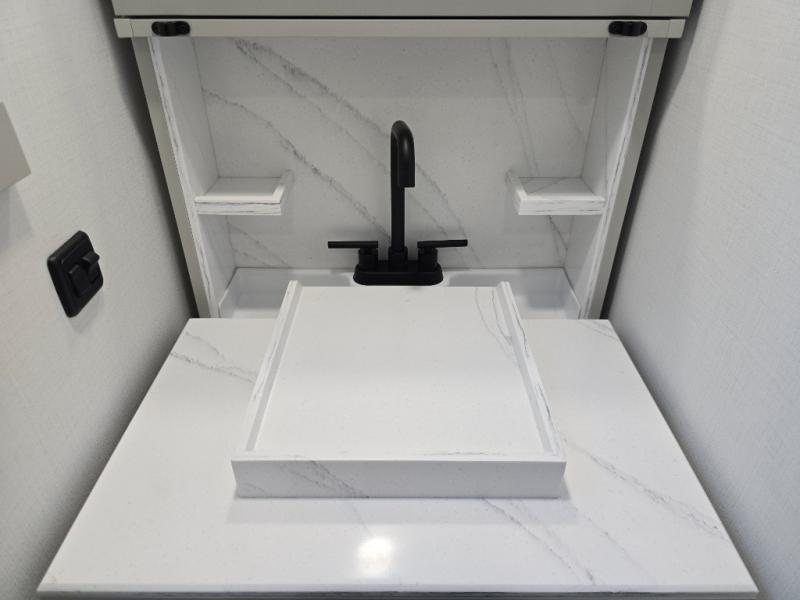 This toy hauler may just be the one you've been looking for! The garage/flex space with fold-away half bath walls will allow you to utilize the garage how you need it, plus there is an adjustable tie-down system, independent dual sofas, plus a loft for storage and a twin bed to sleep more campers! The garage patio with a 1,500 lb. capacity is another feature you are sure to love, especially with its own awning to keep you protected from the elements. Head to the kitchen to prepare meals with a 24" GE oven with a four burner range, a GE microwave with an air fryer, plus a spacious GE Energy Star 19 cu. ft. refrigerator. The island with two stools will let others visit with you while you cook, and there are even hidden dog bowls. You'll find the convertible dining table/L-desk will be accommodating since it can be use to dine at, and to get some work done. You may just find yourselves spending most of your time on the U-sofa in front of the TV and fireplace. A full bath is up front by the bedroom, and here you'll find neon shower lighting, a residential shower system, and pull-out linen storage to keep towels ready to use. After a day outdoors you'll love nothing more than coming back to your own bedroom with a king bed slide out, TV, a walk-in closet, and many more storage spaces. And we haven't even touched on the exterior features, like the 3-way pass-through storage, three power awnings, an air compressor to fill up tires, and the list goes on and on! This is a pre-production preview, all features and layout placement subject to change.