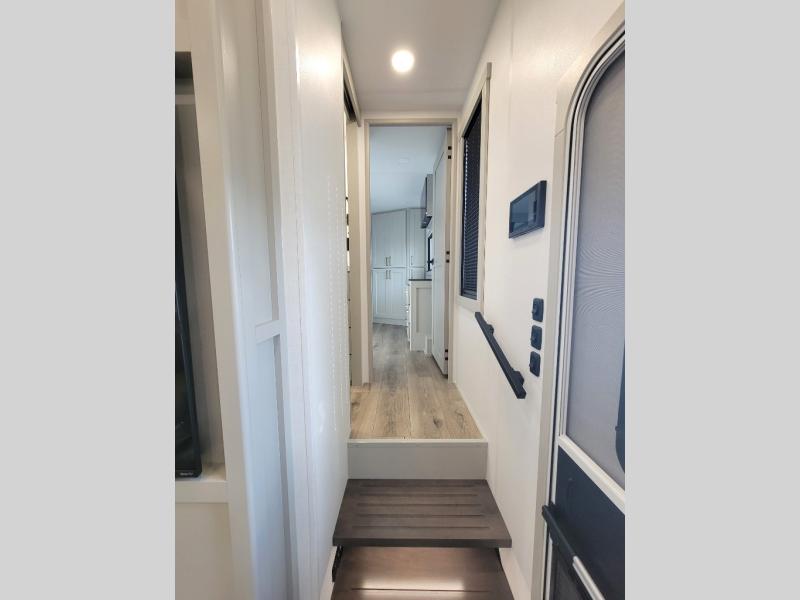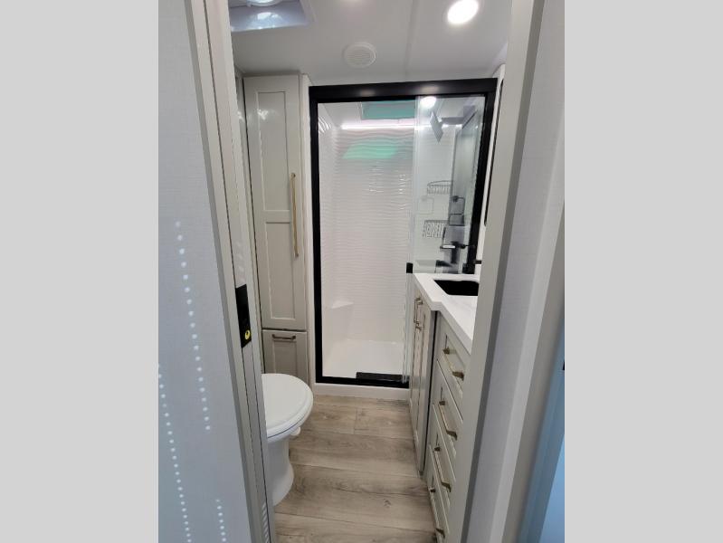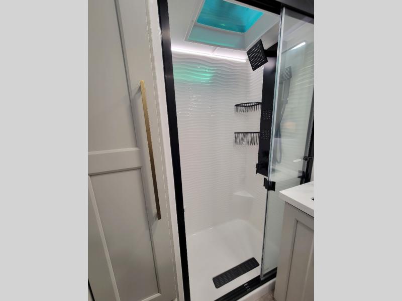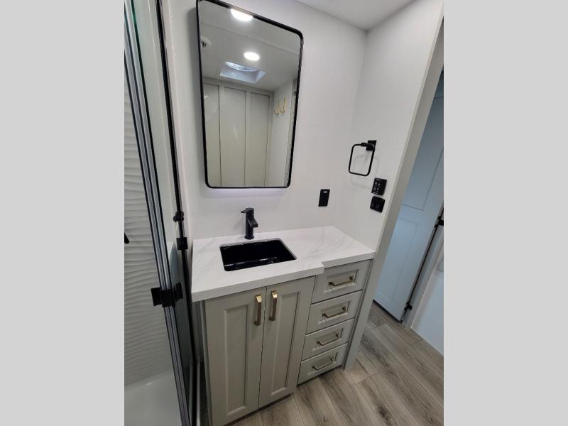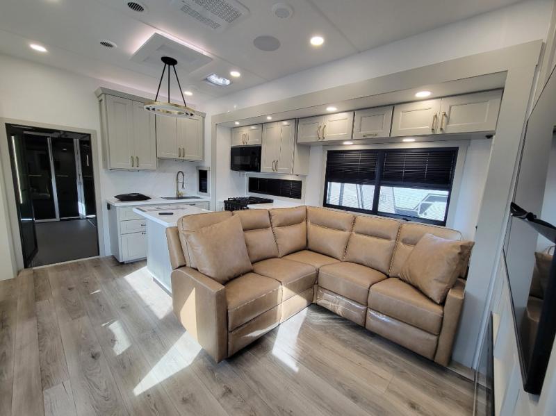 With any Model G toy hauler fifth wheel by Brinkley you will enjoy luxurious amenities, tons of storage space, and innovative features that have been developed and tested in the real world. Durable construction includes an industry leading PDI process, an industry best insulation package, and reinforced and walkable slide roofs. Some of the exterior features you'll find are a 3-way pass-through with a multi-functional flip-up bulkhead wall, under I-beam storage, a MAX-Vision reverse lighting system, and a low-maintenance roof to name a few. A Rockford Fosgate audio system comes standard, along with a OneControl app system that lets you control your fifth wheel's functions right from your mobile device. You will find the solar system with a designated storage area to be ultra convenient, plus there is a FlexPower 5500 with a dual fuel inverter generator for all your power needs. Head inside to find a residential interior with Brinkley's CraftSense wood trim construction, floating entrance steps, integrated window screens and insulated blackout blinds, and residential solid surface countertops plus backsplash. You will also enjoy the neon shower lighting and recessed medicine cabinets in the bath, plus motion activated LED bed lights and dual bedside outlets in the bedroom. Choose a Model G toy hauler fifth wheel to experience all the luxury it has to offer!