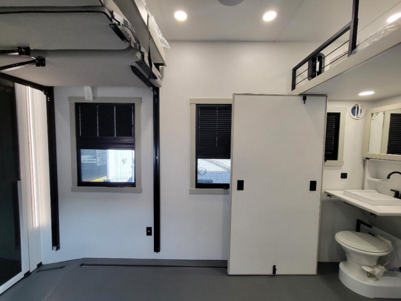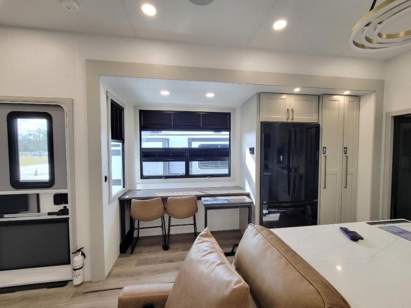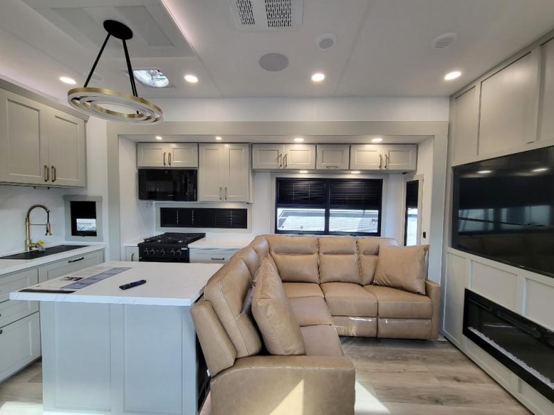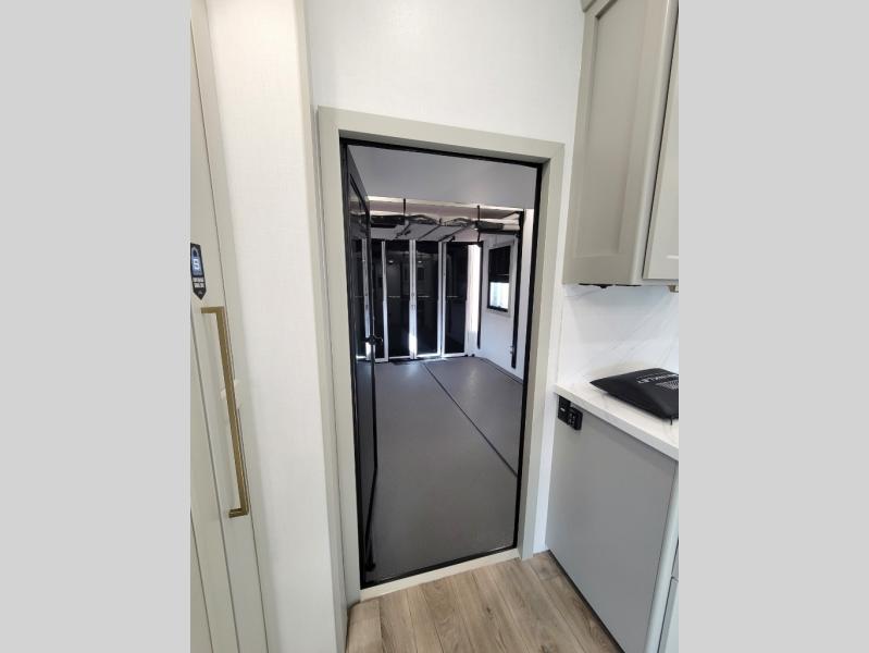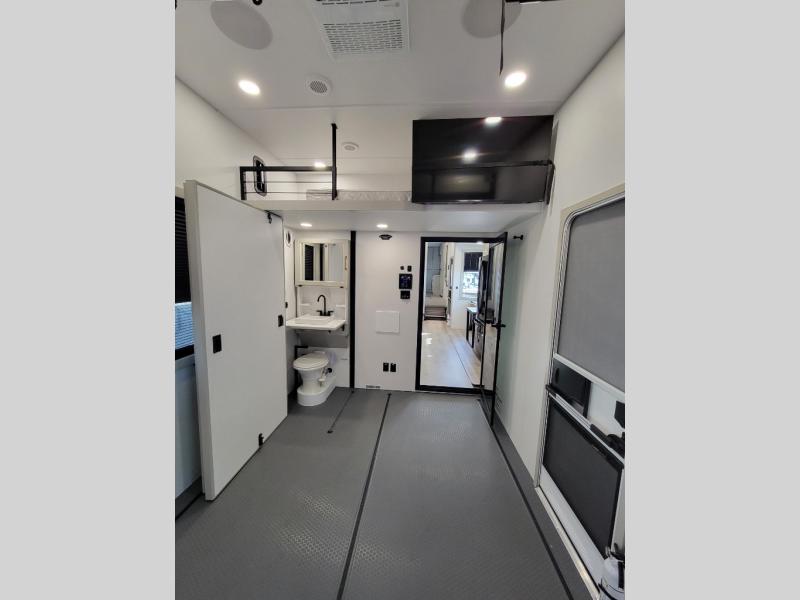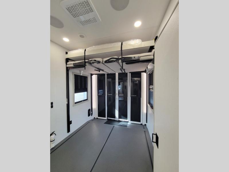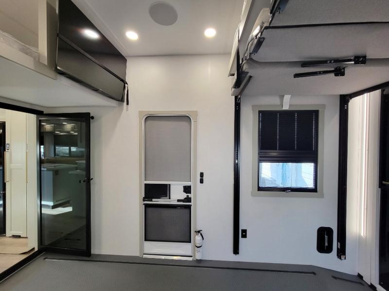 This toy hauler may just be the one you've been looking for! The garage/flex space with fold-away half bath walls will allow you to utilize the garage how you need it, plus there is an adjustable tie-down system, independent dual sofas, plus a loft for storage and a twin bed to sleep more campers! The garage patio with a 1,500 lb. capacity is another feature you are sure to love, especially with its own awning to keep you protected from the elements. Head to the kitchen to prepare meals with a 24" GE oven with a four burner range, a GE microwave with an air fryer, plus a spacious GE Energy Star 19 cu. ft. refrigerator. The island with two stools will let others visit with you while you cook, and there are even hidden dog bowls. You'll find the convertible dining table/L-desk will be accommodating since it can be use to dine at, and to get some work done. You may just find yourselves spending most of your time on the U-sofa in front of the TV and fireplace. A full bath is up front by the bedroom, and here you'll find neon shower lighting, a residential shower system, and pull-out linen storage to keep towels ready to use. After a day outdoors you'll love nothing more than coming back to your own bedroom with a king bed slide out, TV, a walk-in closet, and many more storage spaces. And we haven't even touched on the exterior features, like the 3-way pass-through storage, three power awnings, an air compressor to fill up tires, and the list goes on and on!