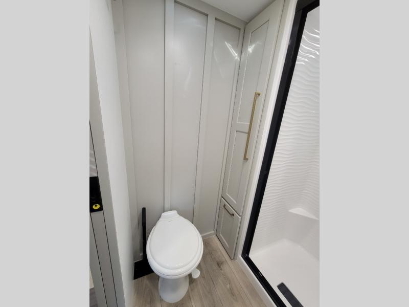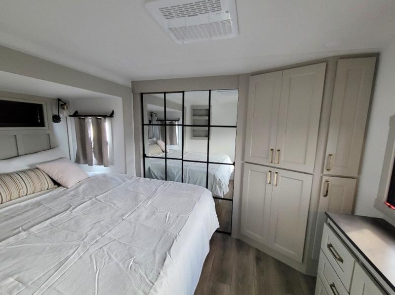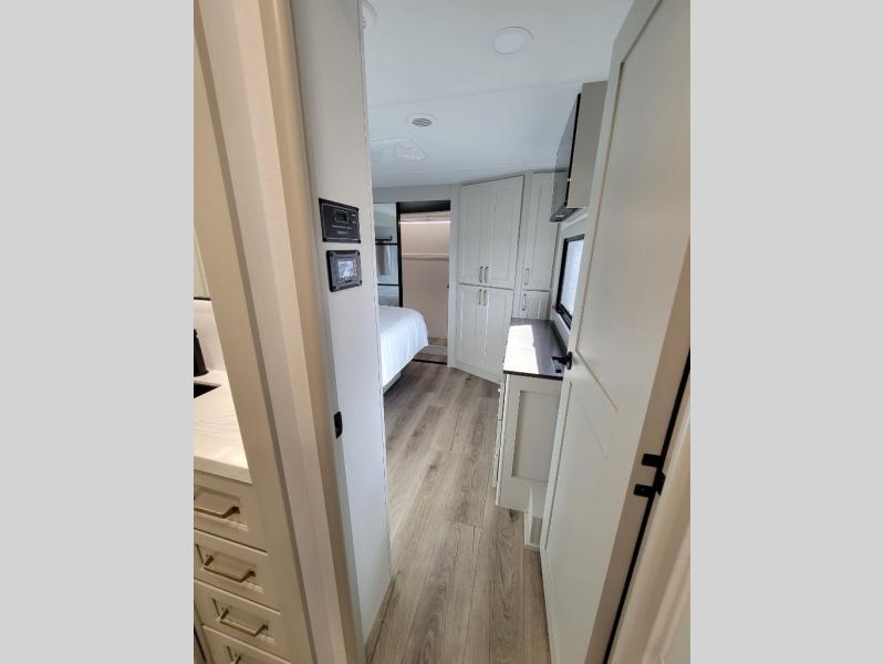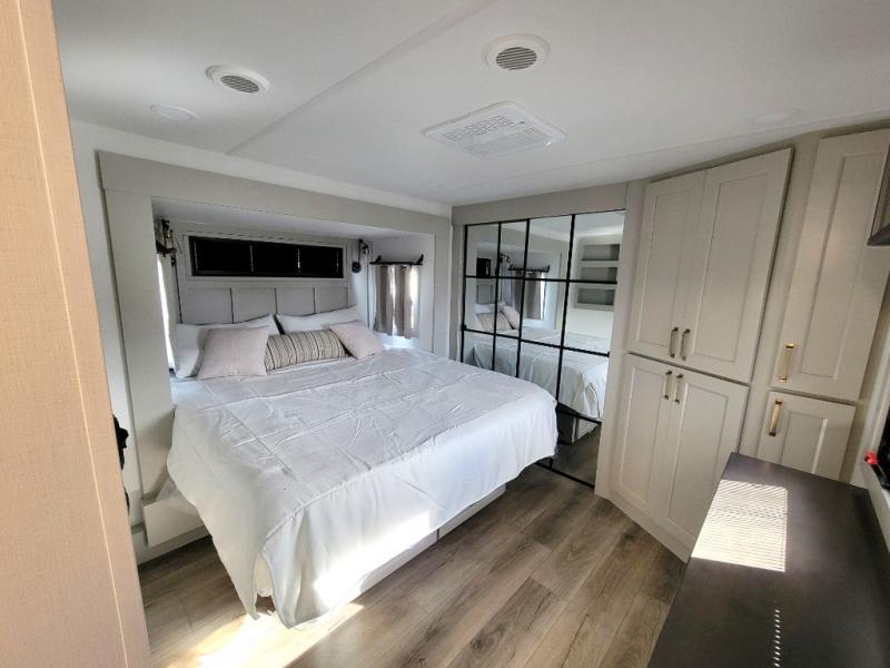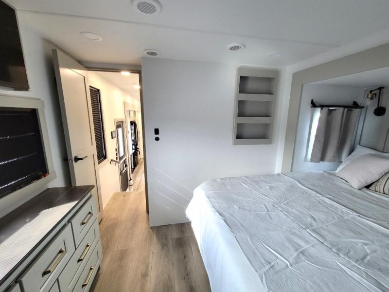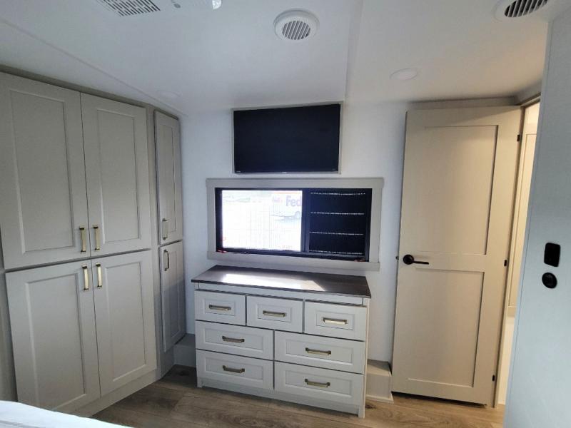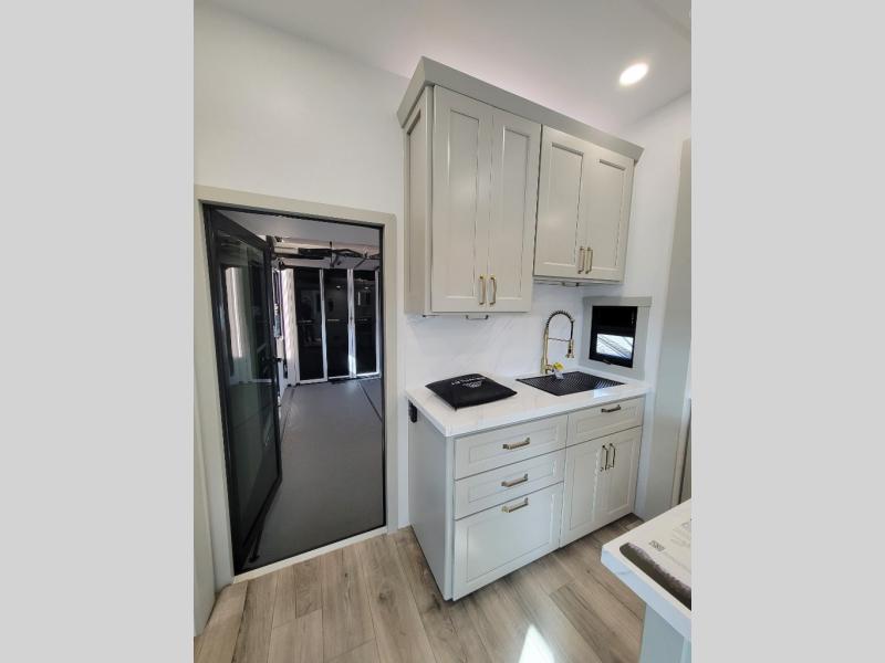 This toy hauler may just be the one you've been looking for! The garage/flex space with fold-away half bath walls will allow you to utilize the garage how you need it, plus there is an adjustable tie-down system, independent dual sofas, plus a loft for storage and a twin bed to sleep more campers! The garage patio with a 1,500 lb. capacity is another feature you are sure to love, especially with its own awning to keep you protected from the elements. Head to the kitchen to prepare meals with a 24" GE oven with a four burner range, a GE microwave with an air fryer, plus a spacious GE Energy Star 19 cu. ft. refrigerator. The island with two stools will let others visit with you while you cook, and there are even hidden dog bowls. You'll find the convertible dining table/L-desk will be accommodating since it can be use to dine at, and to get some work done. You may just find yourselves spending most of your time on the U-sofa in front of the TV and fireplace. A full bath is up front by the bedroom, and here you'll find neon shower lighting, a residential shower system, and pull-out linen storage to keep towels ready to use. After a day outdoors you'll love nothing more than coming back to your own bedroom with a king bed slide out, TV, a walk-in closet, and many more storage spaces. And we haven't even touched on the exterior features, like the 3-way pass-through storage, three power awnings, an air compressor to fill up tires, and the list goes on and on!