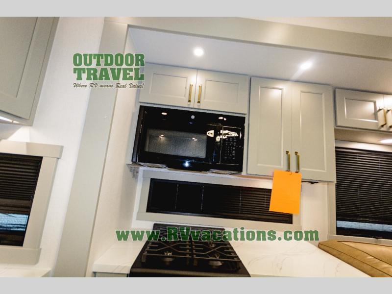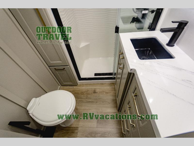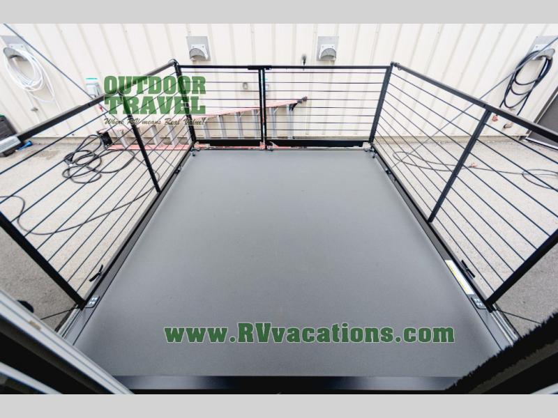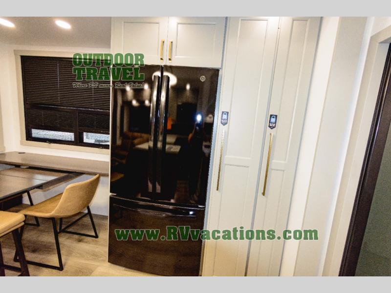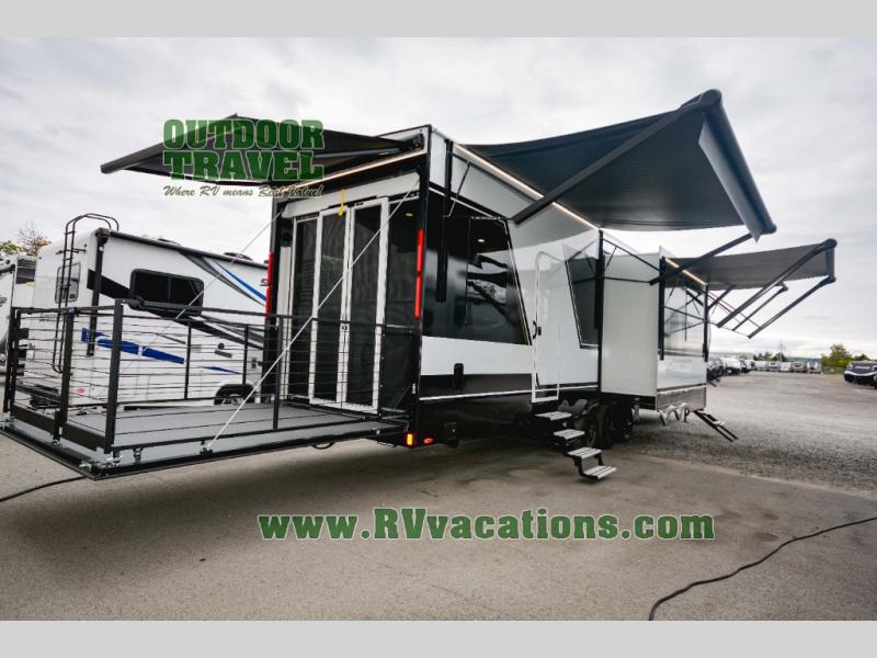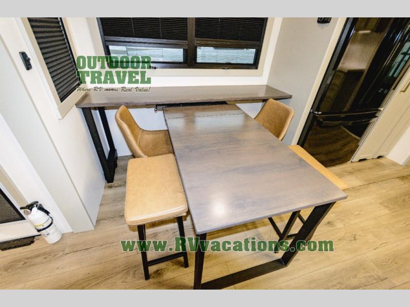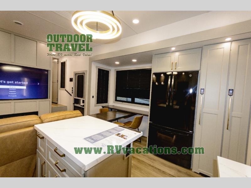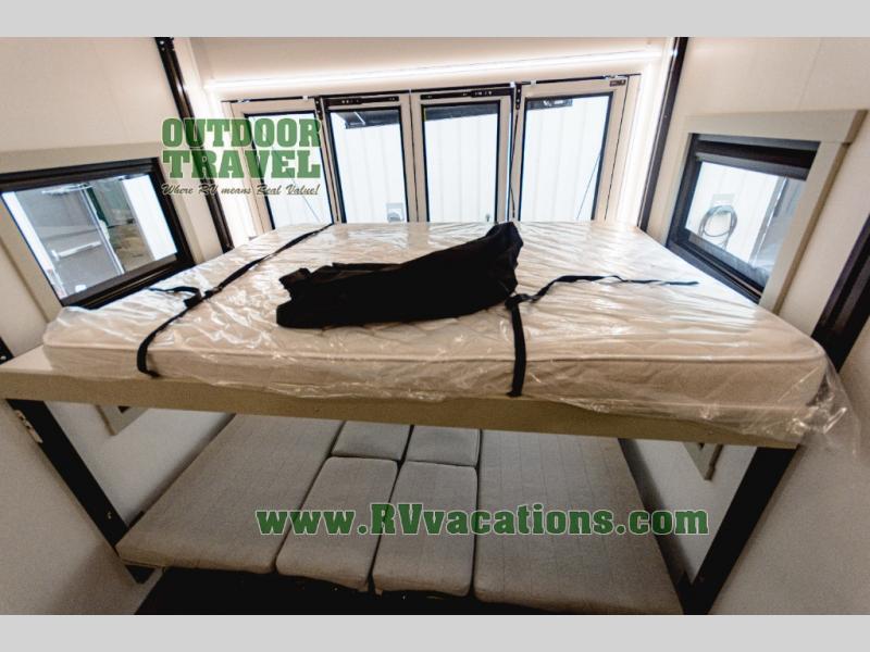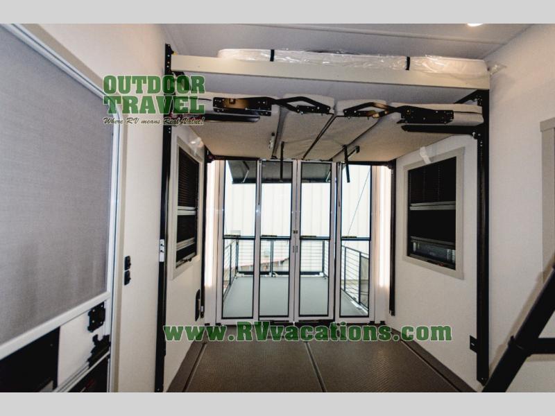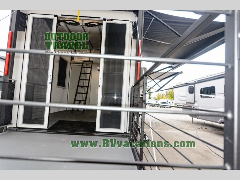 This toy hauler may just be the one you've been looking for! The garage/flex space with fold-away half bath walls will allow you to utilize the garage how you need it, plus there is an adjustable tie-down system, independent dual sofas, plus a loft for storage and a twin bed to sleep more campers! The garage patio with a 1,500 lb. capacity is another feature you are sure to love, especially with its own awning to keep you protected from the elements. Head to the kitchen to prepare meals with a 24" GE oven with a four burner range, a GE microwave with an air fryer, plus a spacious GE Energy Star 19 cu. ft. refrigerator. The island with two stools will let others visit with you while you cook, and there are even hidden dog bowls. You'll find the convertible dining table/L-desk will be accommodating since it can be use to dine at, and to get some work done. You may just find yourselves spending most of your time on the U-sofa in front of the TV and fireplace. A full bath is up front by the bedroom, and here you'll find neon shower lighting, a residential shower system, and pull-out linen storage to keep towels ready to use. After a day outdoors you'll love nothing more than coming back to your own bedroom with a king bed slide out, TV, a walk-in closet, and many more storage spaces. And we haven't even touched on the exterior features, like the 3-way pass-through storage, three power awnings, an air compressor to fill up tires, and the list goes on and on!