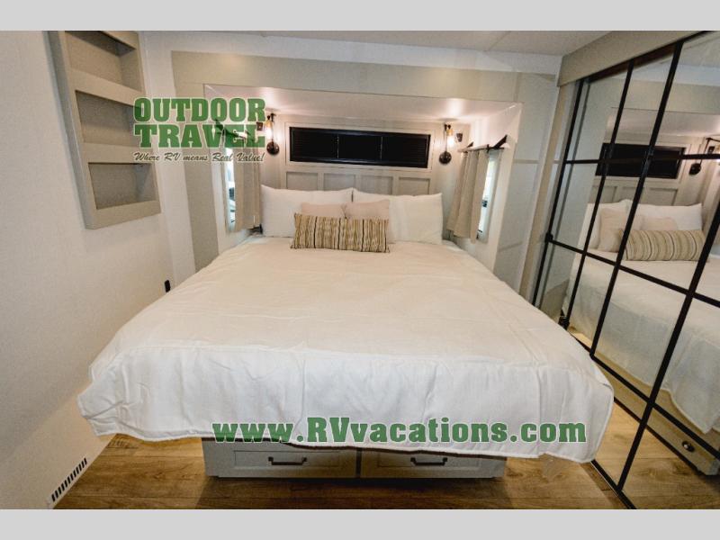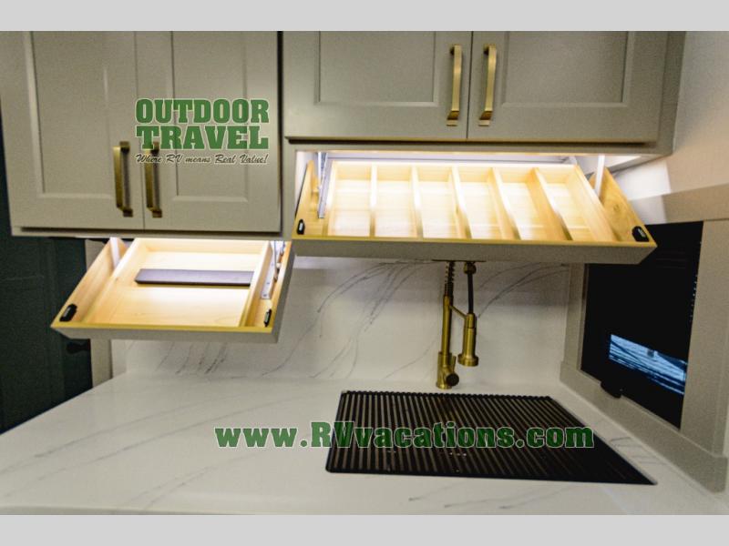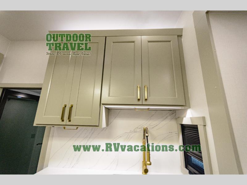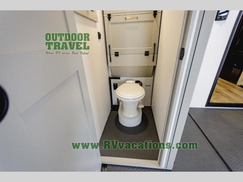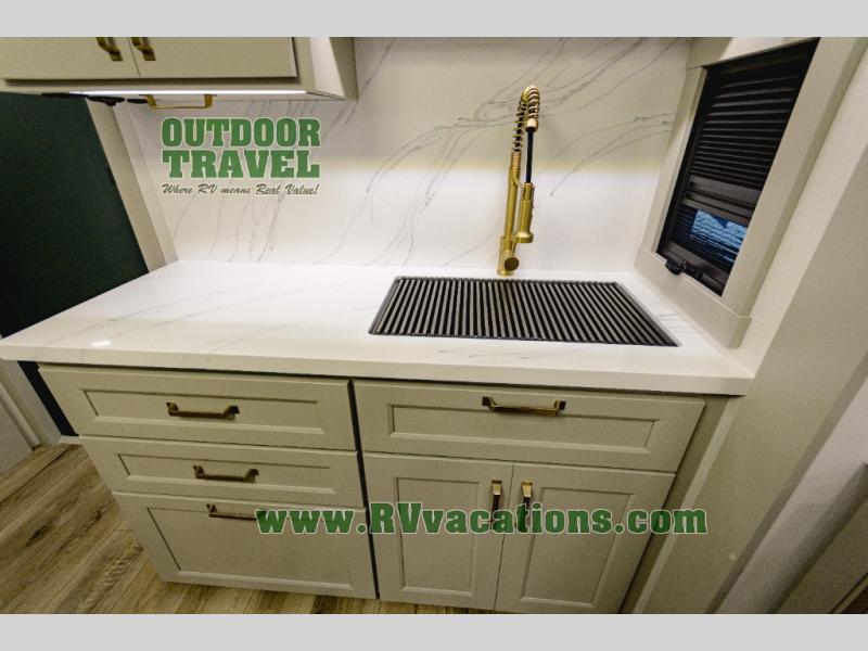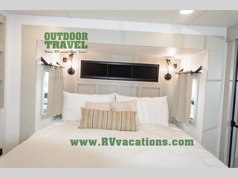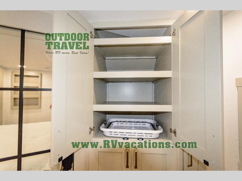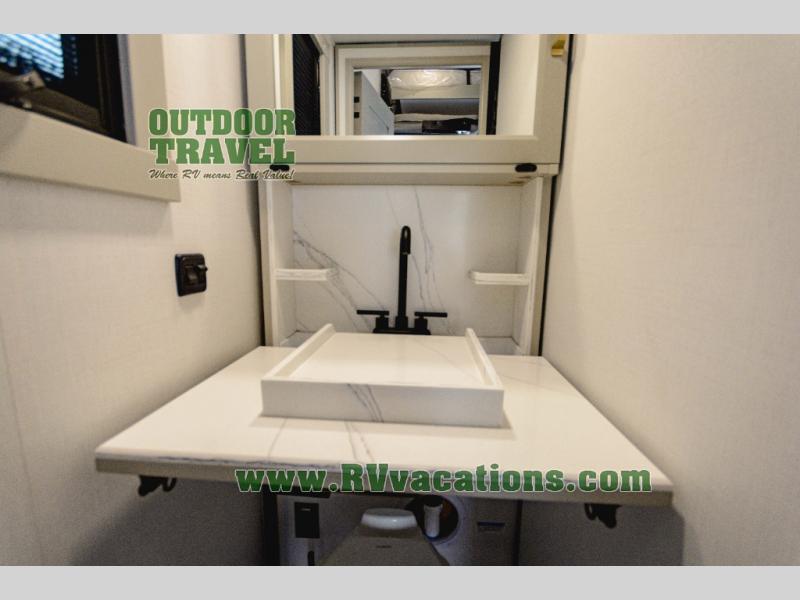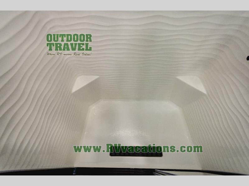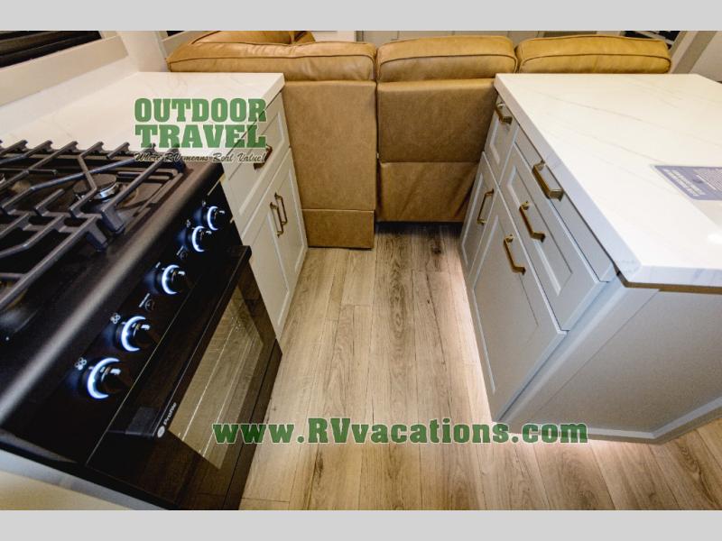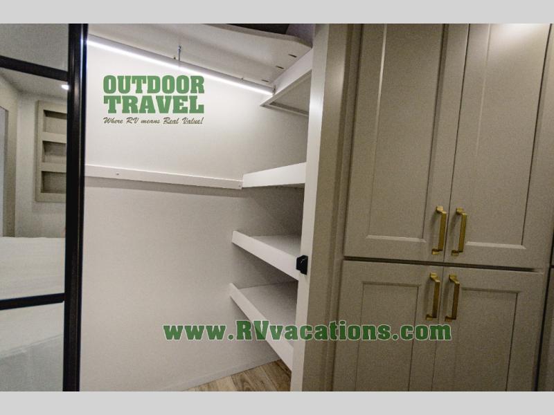 This toy hauler may just be the one you've been looking for! The garage/flex space with fold-away half bath walls will allow you to utilize the garage how you need it, plus there is an adjustable tie-down system, independent dual sofas, plus a loft for storage and a twin bed to sleep more campers! The garage patio with a 1,500 lb. capacity is another feature you are sure to love, especially with its own awning to keep you protected from the elements. Head to the kitchen to prepare meals with a 24" GE oven with a four burner range, a GE microwave with an air fryer, plus a spacious GE Energy Star 19 cu. ft. refrigerator. The island with two stools will let others visit with you while you cook, and there are even hidden dog bowls. You'll find the convertible dining table/L-desk will be accommodating since it can be use to dine at, and to get some work done. You may just find yourselves spending most of your time on the U-sofa in front of the TV and fireplace. A full bath is up front by the bedroom, and here you'll find neon shower lighting, a residential shower system, and pull-out linen storage to keep towels ready to use. After a day outdoors you'll love nothing more than coming back to your own bedroom with a king bed slide out, TV, a walk-in closet, and many more storage spaces. And we haven't even touched on the exterior features, like the 3-way pass-through storage, three power awnings, an air compressor to fill up tires, and the list goes on and on!