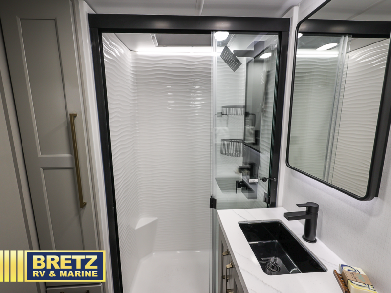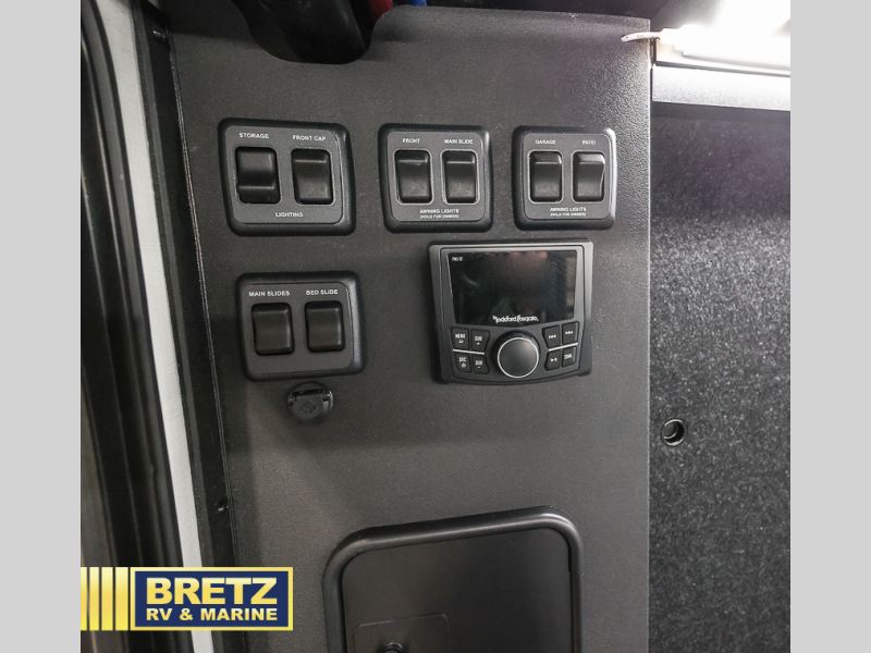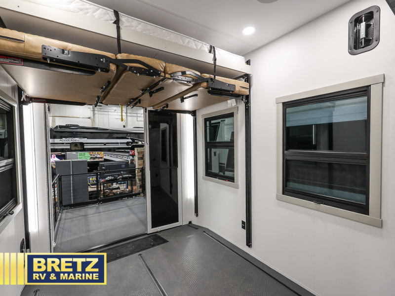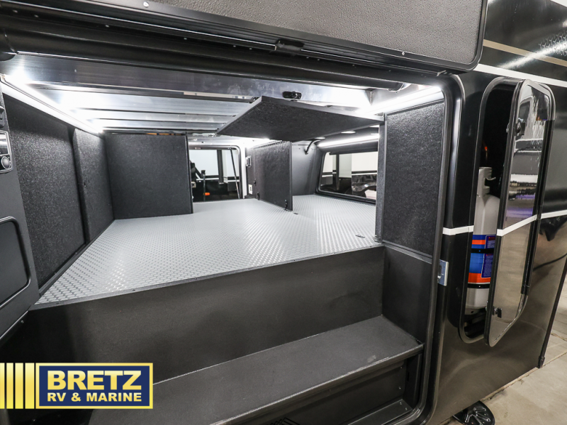 With any Model G toy hauler fifth wheel by Brinkley you will enjoy luxurious amenities, tons of storage space, and innovative features that have been developed and tested in the real world. Durable construction includes an industry leading PDI process, an industry best insulation package, and reinforced and walkable slide roofs. Some of the exterior features you'll find are a 3-way pass-through with a multi-functional flip-up bulkhead wall, under I-beam storage, a MAX-Vision reverse lighting system, and a low-maintenance roof to name a few. A Rockford Fosgate audio system comes standard, along with a OneControl app system that lets you control your fifth wheel's functions right from your mobile device. You will find the solar system with a designated storage area to be ultra convenient, plus there is a FlexPower 5500 with a dual fuel inverter generator for all your power needs. Head inside to find a residential interior with Brinkley's CraftSense wood trim construction, floating entrance steps, integrated window screens and insulated blackout blinds, and residential solid surface countertops plus backsplash. You will also enjoy the neon shower lighting and recessed medicine cabinets in the bath, plus motion activated LED bed lights and dual bedside outlets in the bedroom. Choose a Model G toy hauler fifth wheel to experience all the luxury it has to offer!