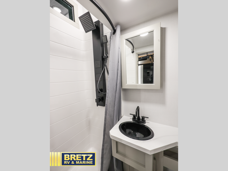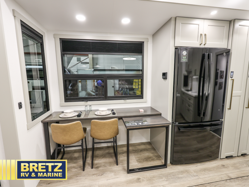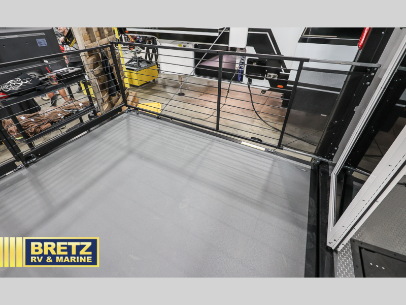Whether you use this toy hauler to haul your favorite ride-on toys or as a mobile office, you're sure to love every inch of it! The 14' separate garage includes a Fold-N-Stow table and independent dual sofas, along with a full bath and a loft/storage with a twin bed for more sleeping space. The middle kitchen is every chef's dream with its GE appliances, kitchen island, and convenient features, such as pull-out trash bins and a cutting board, a pull-down knife rack and utensil tray, and a pull-out pantry/utility closet! Right next to the kitchen is the living room with a L-sofa with four modes, a 65" Phillips Smart TV and a fireplace, plus a convertible dining table/L-desk where you can dine or get some work done. You'll love the second full bath up front close to the private bedroom, and here, you'll find a king bed slide out, under-bed storage drawers and motion lights, a walk-in closet with cordless vacuum prep, and a sliding dresser top with hidden storage for valuables. There is also washer and dryer prep in the bedroom and garage, making this toy hauler full-time capable!