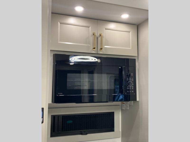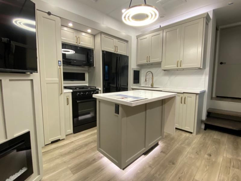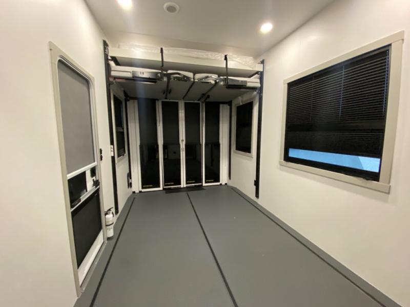 Prepare to be amazed by all the features packed into this toy hauler! There are triple slides that will provide your crew with more space, a 16' separate garage flex area that can sleep five with the loft included, plus a bath and a half for added convenience. The chef in your group will love the middle kitchen with a waterfall island that converts to a counter peninsula, a pull-out pantry, a GE Energy Star 19 cu. ft. refrigerator with ice and filtered water, and much more. In the combined kitchen and living area you'll find a spacious sofa with heat and massage, a fireplace, a TV, plus convenient dog bowls and shoe storage. After your toys are unloaded from the garage, you can relax on the independent dual couches with a Fold-N-Stow table in between, and your guests can sleep on the Happijac® Sofa and Bed Lift system. You will find the front private bedroom with a king bed slide out will provide a great night's rest, and you'll also find a walk-in closet, under-bed storage, and a sliding dresser top with hidden storage for special belongings.