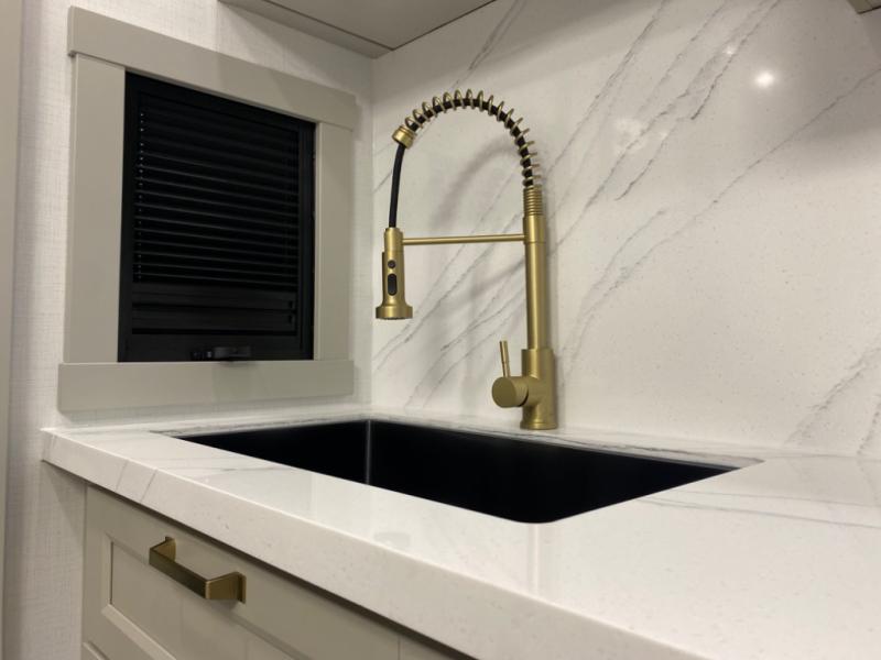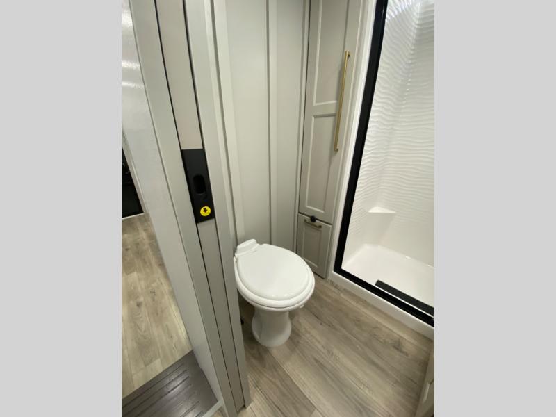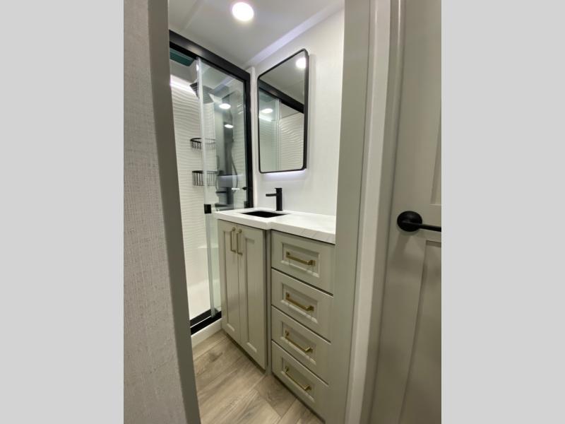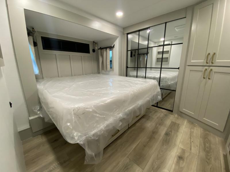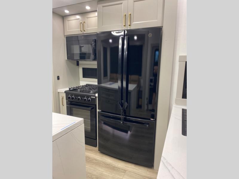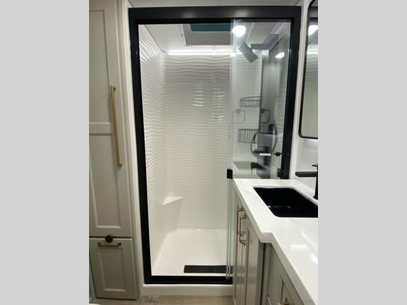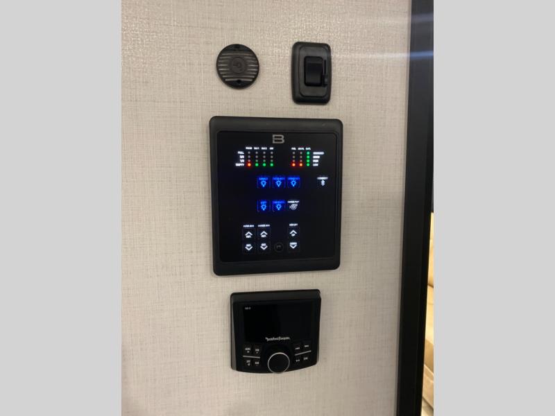 With any Model G toy hauler fifth wheel by Brinkley you will enjoy luxurious amenities, tons of storage space, and innovative features that have been developed and tested in the real world. Durable construction includes an industry leading PDI process, an industry best insulation package, and reinforced and walkable slide roofs. Some of the exterior features you'll find are a 3-way pass-through with a multi-functional flip-up bulkhead wall, under I-beam storage, a MAX-Vision reverse lighting system, and a low-maintenance roof to name a few. A Rockford Fosgate audio system comes standard, along with a OneControl app system that lets you control your fifth wheel's functions right from your mobile device. You will find the solar system with a designated storage area to be ultra convenient, plus there is a FlexPower 5500 with a dual fuel inverter generator for all your power needs. Head inside to find a residential interior with Brinkley's CraftSense wood trim construction, floating entrance steps, integrated window screens and insulated blackout blinds, and residential solid surface countertops plus backsplash. You will also enjoy the neon shower lighting and recessed medicine cabinets in the bath, plus motion activated LED bed lights and dual bedside outlets in the bedroom. Choose a Model G toy hauler fifth wheel to experience all the luxury it has to offer!