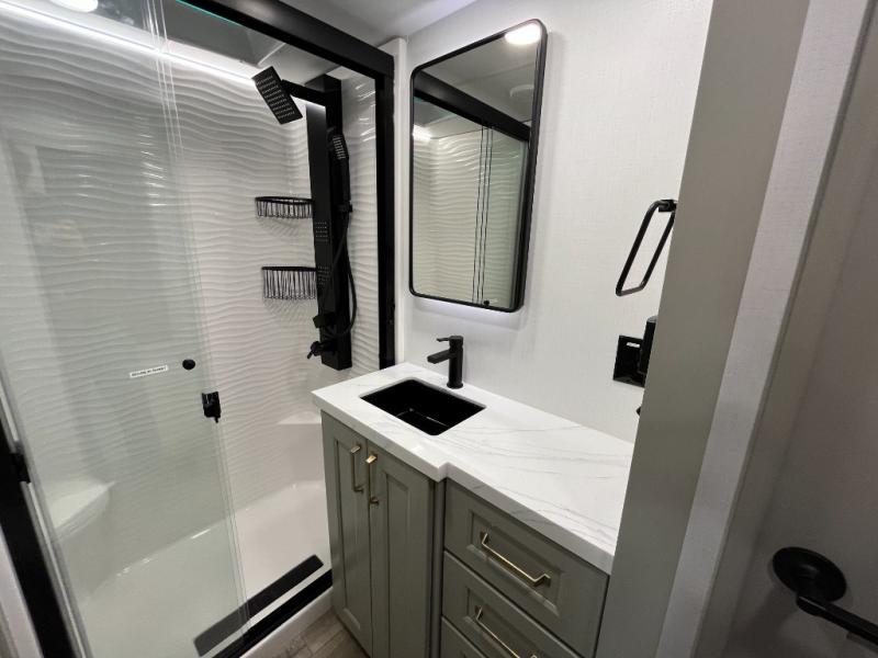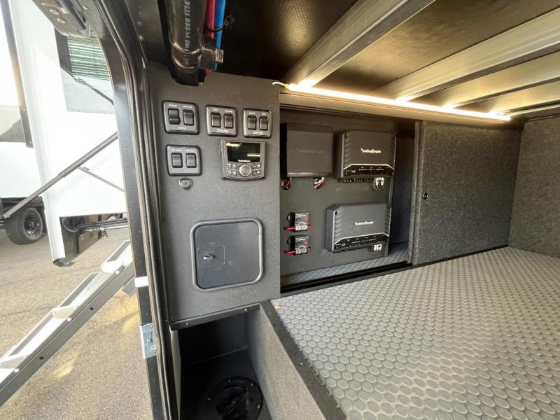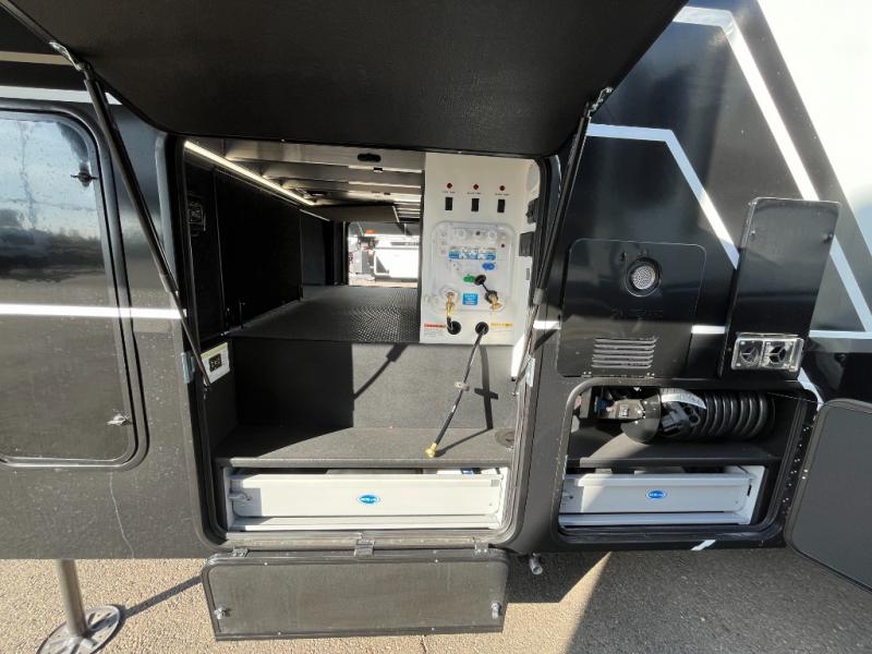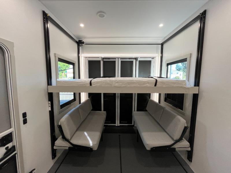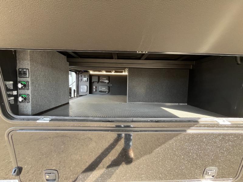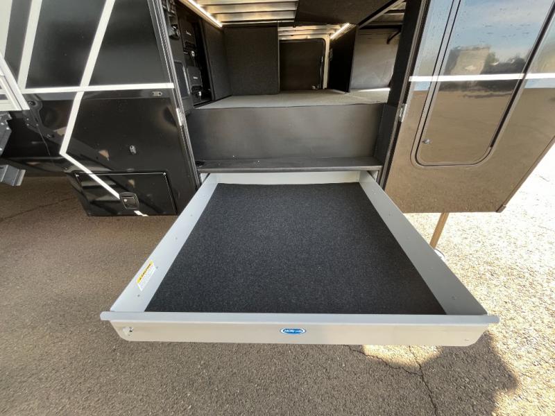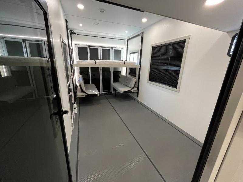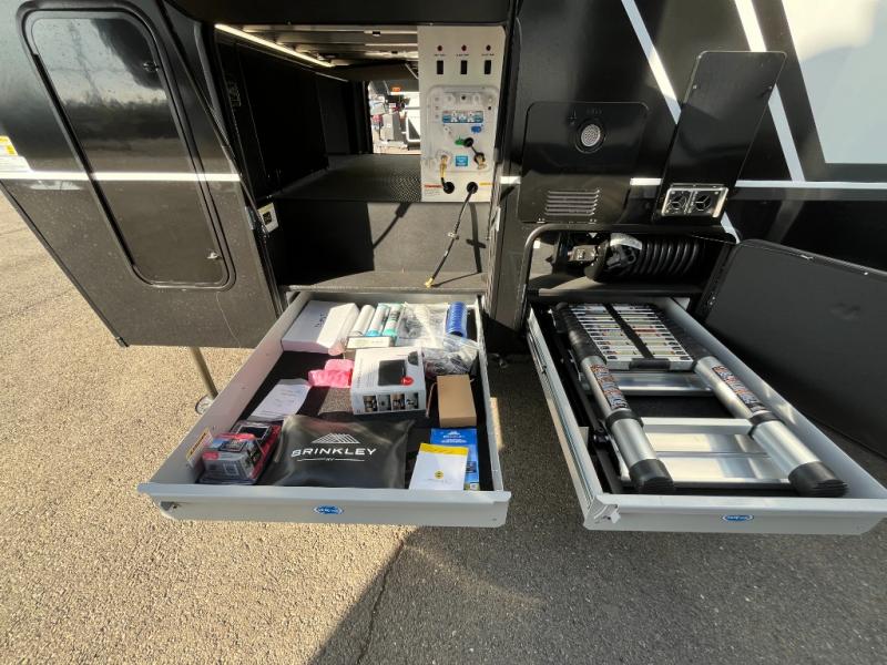 With any Model G toy hauler fifth wheel by Brinkley you will enjoy luxurious amenities, tons of storage space, and innovative features that have been developed and tested in the real world. Durable construction includes an industry leading PDI process, an industry best insulation package, and reinforced and walkable slide roofs. Some of the exterior features you'll find are a 3-way pass-through with a multi-functional flip-up bulkhead wall, under I-beam storage, a MAX-Vision reverse lighting system, and a low-maintenance roof to name a few. A Rockford Fosgate audio system comes standard, along with a OneControl app system that lets you control your fifth wheel's functions right from your mobile device. You will find the solar system with a designated storage area to be ultra convenient, plus there is a FlexPower 5500 with a dual fuel inverter generator for all your power needs. Head inside to find a residential interior with Brinkley's CraftSense wood trim construction, floating entrance steps, integrated window screens and insulated blackout blinds, and residential solid surface countertops plus backsplash. You will also enjoy the neon shower lighting and recessed medicine cabinets in the bath, plus motion activated LED bed lights and dual bedside outlets in the bedroom. Choose a Model G toy hauler fifth wheel to experience all the luxury it has to offer!