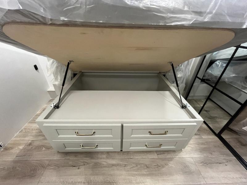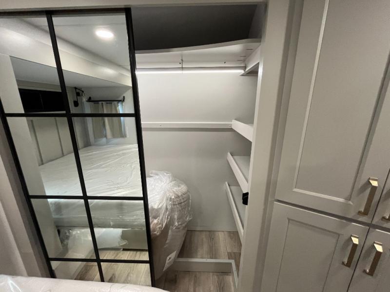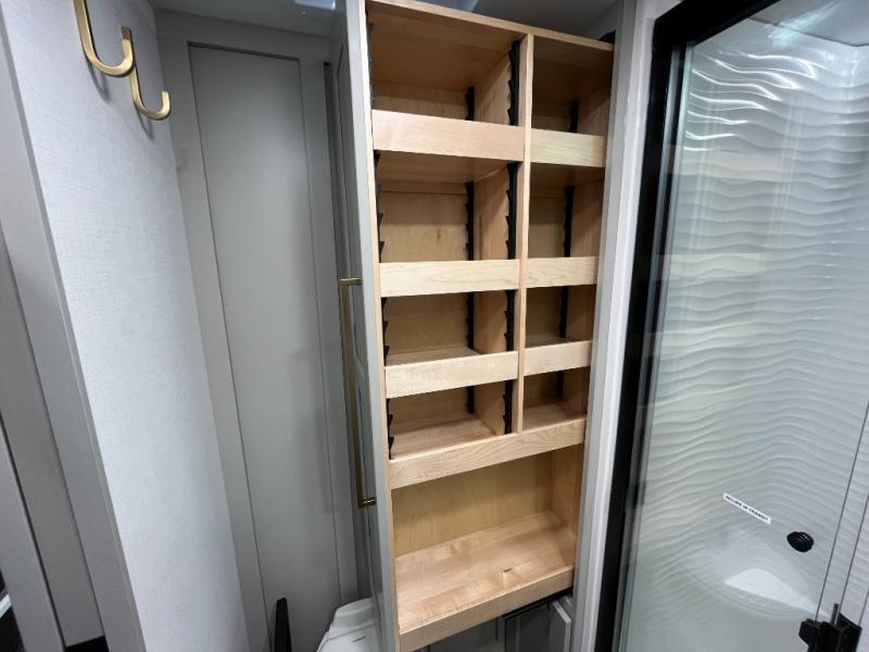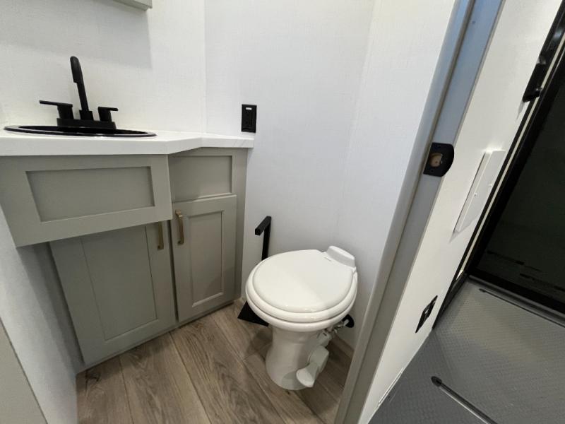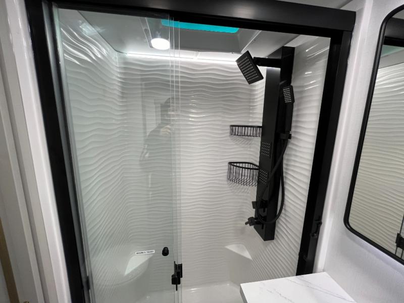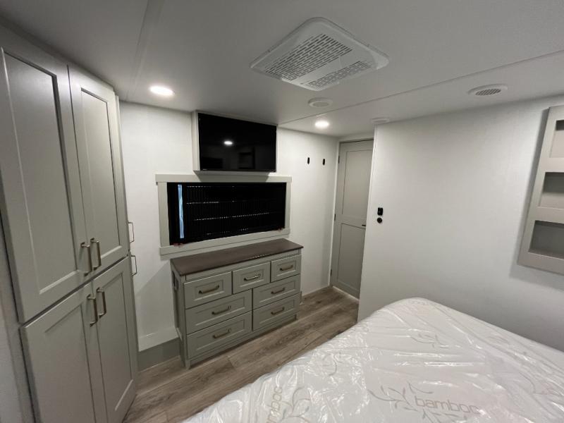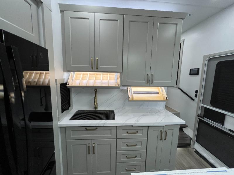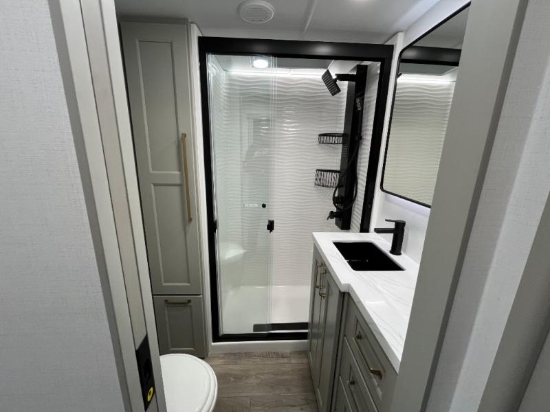 With any Model G toy hauler fifth wheel by Brinkley you will enjoy luxurious amenities, tons of storage space, and innovative features that have been developed and tested in the real world. Durable construction includes an industry leading PDI process, an industry best insulation package, and reinforced and walkable slide roofs. Some of the exterior features you'll find are a 3-way pass-through with a multi-functional flip-up bulkhead wall, under I-beam storage, a MAX-Vision reverse lighting system, and a low-maintenance roof to name a few. A Rockford Fosgate audio system comes standard, along with a OneControl app system that lets you control your fifth wheel's functions right from your mobile device. You will find the solar system with a designated storage area to be ultra convenient, plus there is a FlexPower 5500 with a dual fuel inverter generator for all your power needs. Head inside to find a residential interior with Brinkley's CraftSense wood trim construction, floating entrance steps, integrated window screens and insulated blackout blinds, and residential solid surface countertops plus backsplash. You will also enjoy the neon shower lighting and recessed medicine cabinets in the bath, plus motion activated LED bed lights and dual bedside outlets in the bedroom. Choose a Model G toy hauler fifth wheel to experience all the luxury it has to offer!