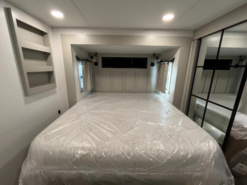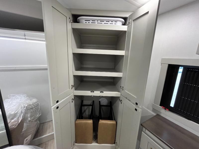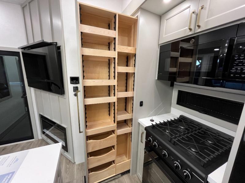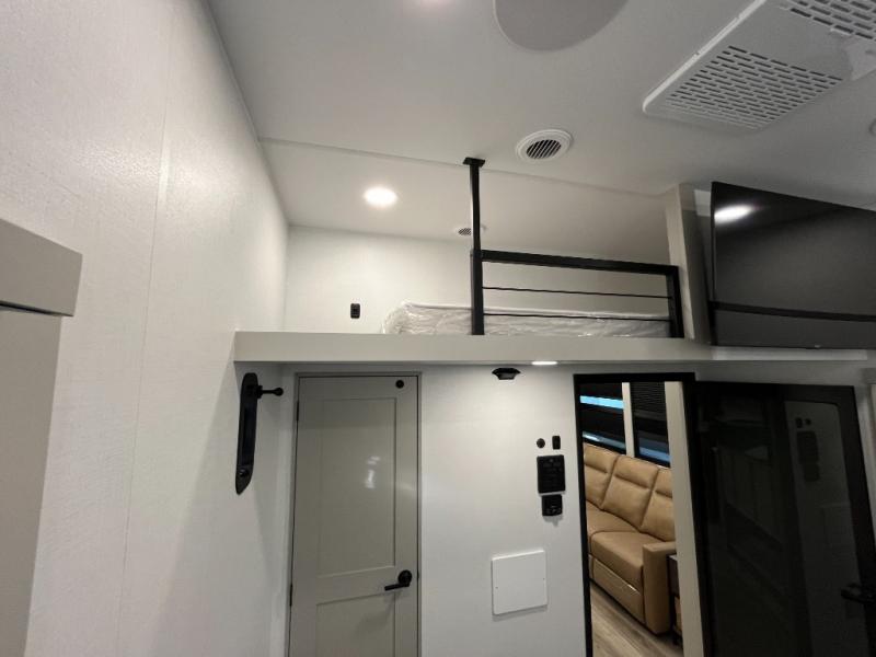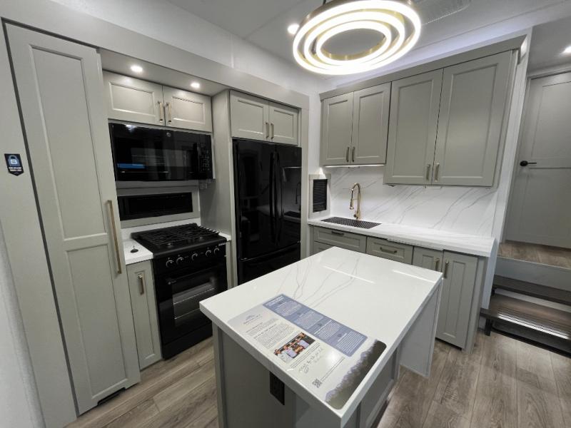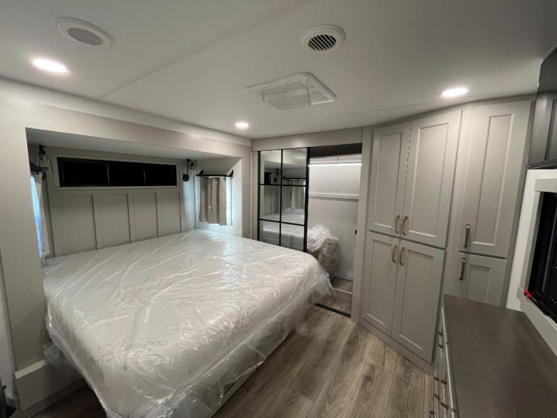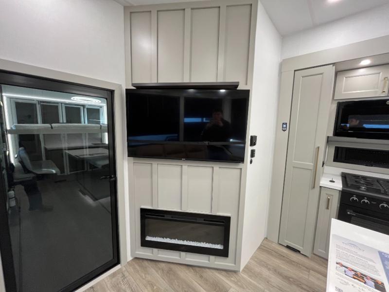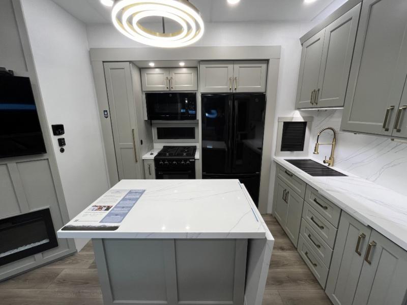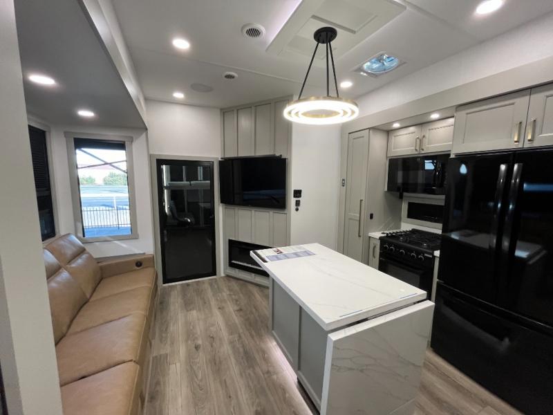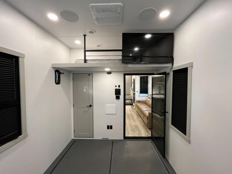 Prepare to be amazed by all the features packed into this toy hauler! There are triple slides that will provide your crew with more space, a 16' separate garage flex area that can sleep five with the loft included, plus a bath and a half for added convenience. The chef in your group will love the middle kitchen with a waterfall island that converts to a counter peninsula, a pull-out pantry, a GE Energy Star 19 cu. ft. refrigerator with ice and filtered water, and much more. In the combined kitchen and living area you'll find a spacious sofa with heat and massage, a fireplace, a TV, plus convenient dog bowls and shoe storage. After your toys are unloaded from the garage, you can relax on the independent dual couches with a Fold-N-Stow table in between. You will find the front private bedroom with a king bed slide out will provide a great night's rest, and you'll also find a walk-in closet, under-bed storage, and a sliding dresser top with hidden storage for special belongings.