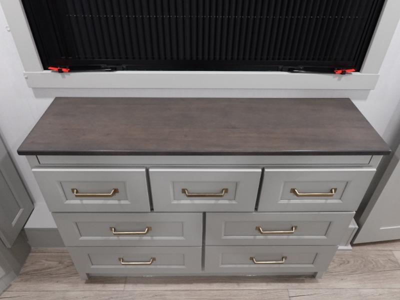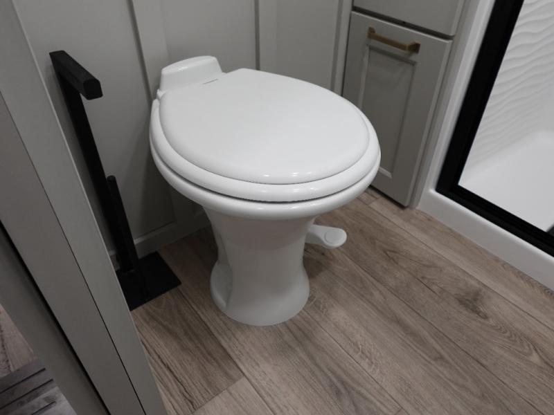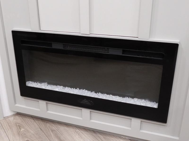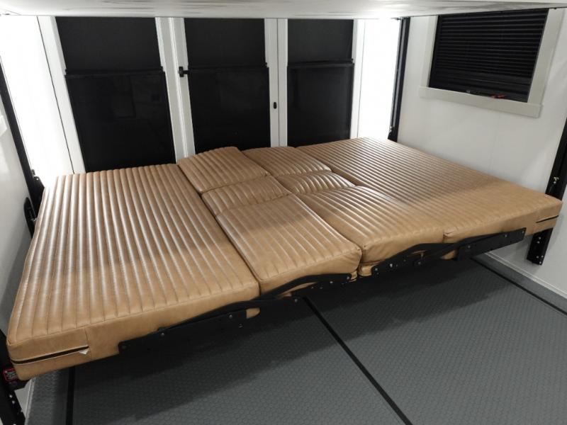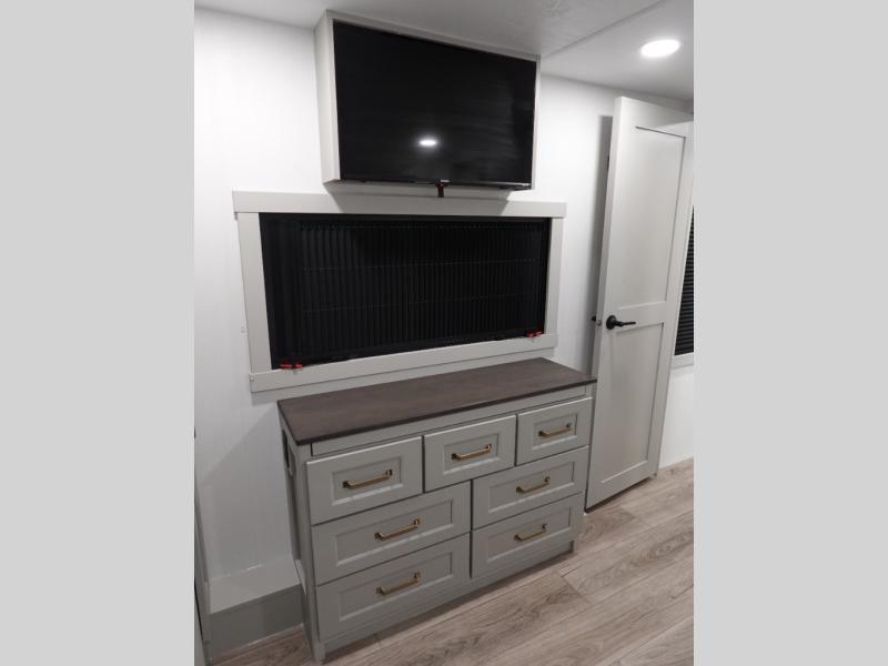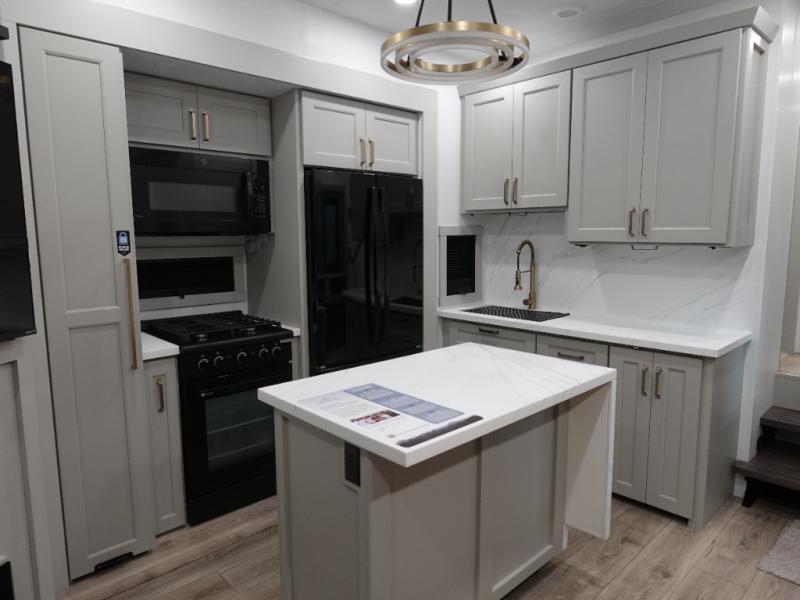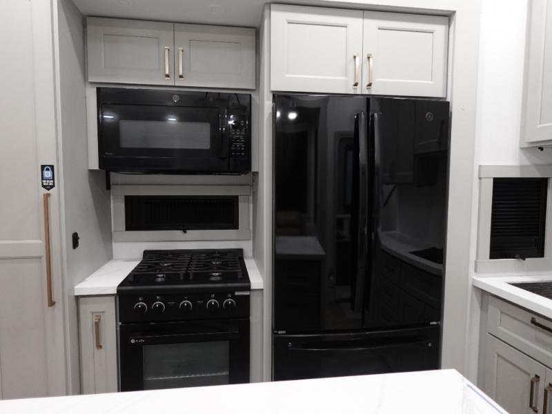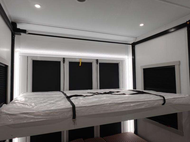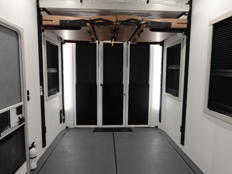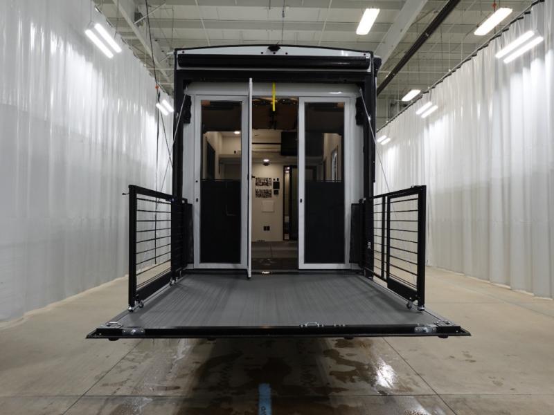 Prepare to be amazed by all the features packed into this toy hauler! There are triple slides that will provide your crew with more space, a 16' separate garage flex area that can sleep five with the loft included, plus a bath and a half for added convenience. The chef in your group will love the middle kitchen with a waterfall island that converts to a counter peninsula, a pull-out pantry, a GE Energy Star 19 cu. ft. refrigerator with ice and filtered water, and much more. In the combined kitchen and living area you'll find a spacious sofa with heat and massage, a fireplace, a TV, plus convenient dog bowls and shoe storage. After your toys are unloaded from the garage, you can relax on the independent dual couches with a Fold-N-Stow table in between. You will find the front private bedroom with a king bed slide out will provide a great night's rest, and you'll also find a walk-in closet, under-bed storage, and a sliding dresser top with hidden storage for special belongings.