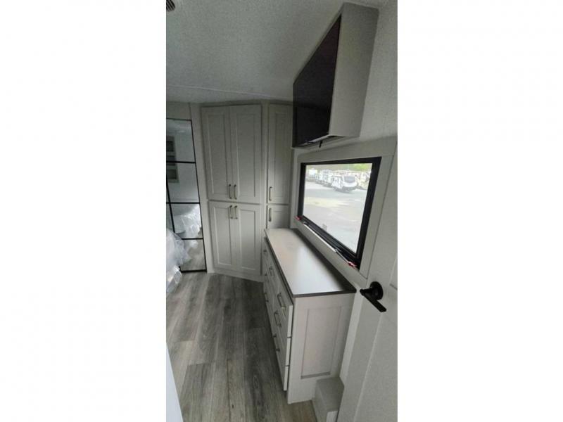 Prepare to be amazed by all the features packed into this toy hauler! There are triple slides that will provide your crew with more space, a 16' separate garage flex area that can sleep five with the loft included, plus a bath and a half for added convenience. The chef in your group will love the middle kitchen with a waterfall island that converts to a counter peninsula, a pull-out pantry, a GE Energy Star 19 cu. ft. refrigerator with ice and filtered water, and much more. In the combined kitchen and living area you'll find a spacious sofa with heat and massage, a fireplace, a TV, plus convenient dog bowls and shoe storage. After your toys are unloaded from the garage, you can relax on the independent dual couches with a Fold-N-Stow table in between. You will find the front private bedroom with a king bed slide out will provide a great night's rest, and you'll also find a walk-in closet, under-bed storage, and a sliding dresser top with hidden storage for special belongings.