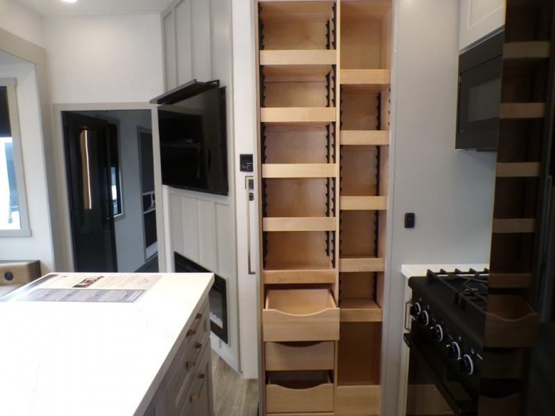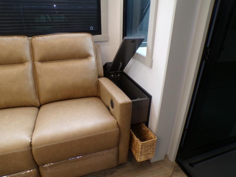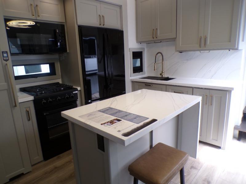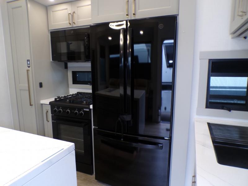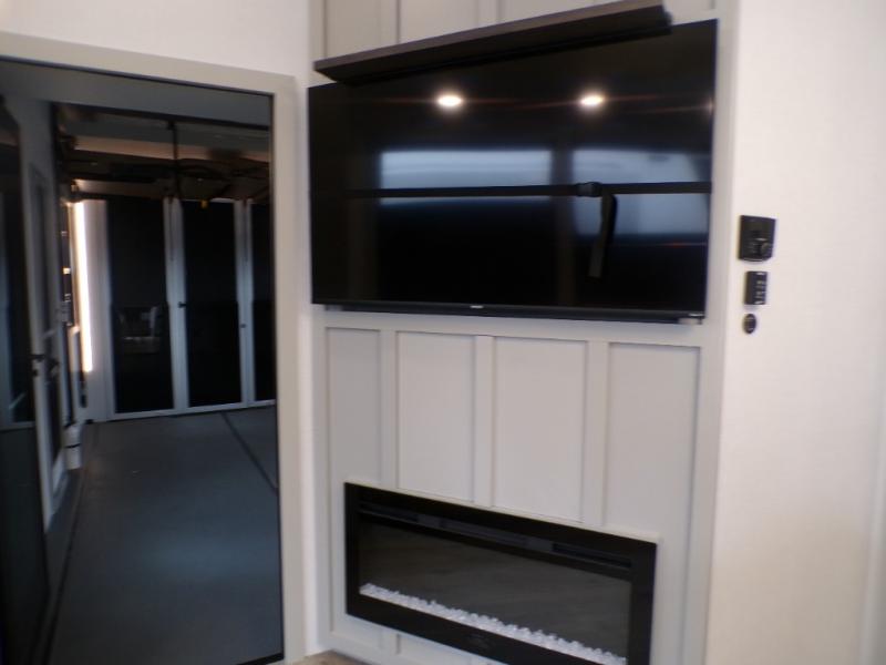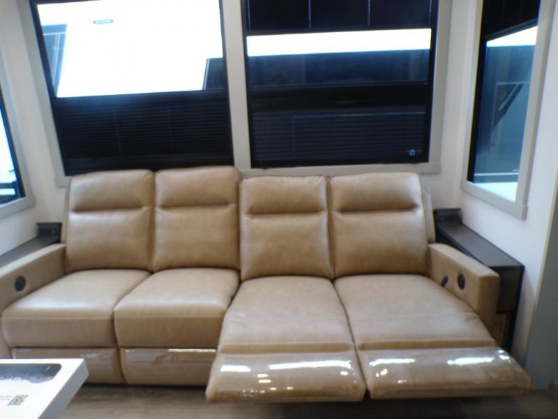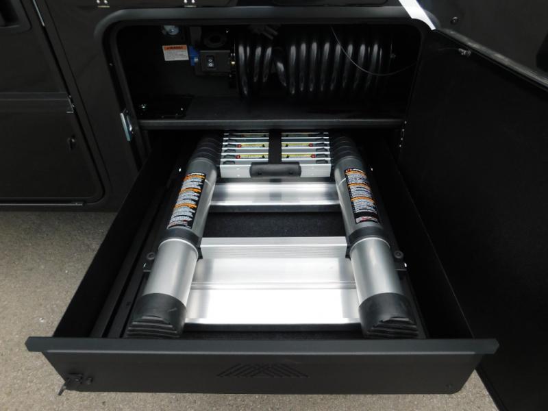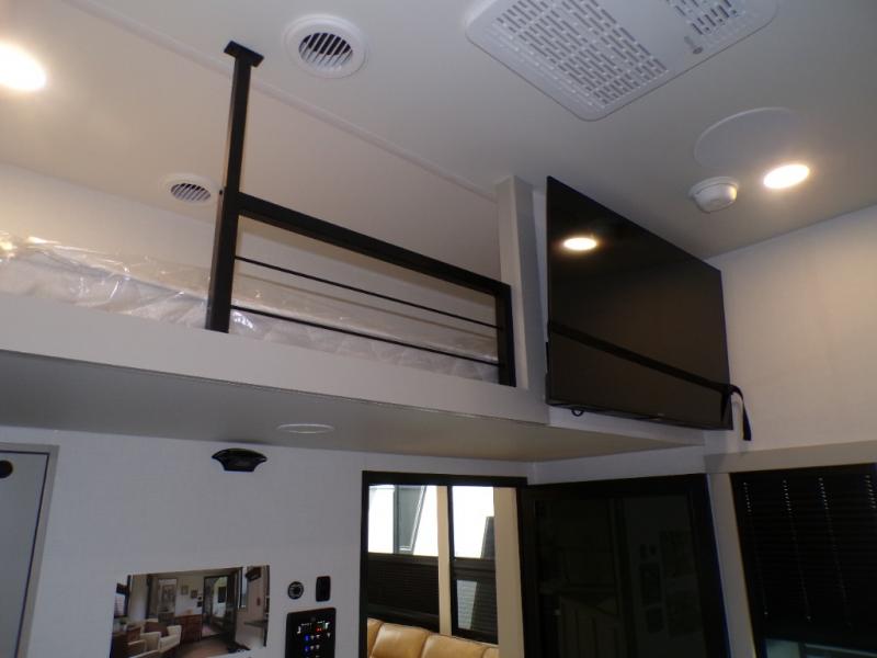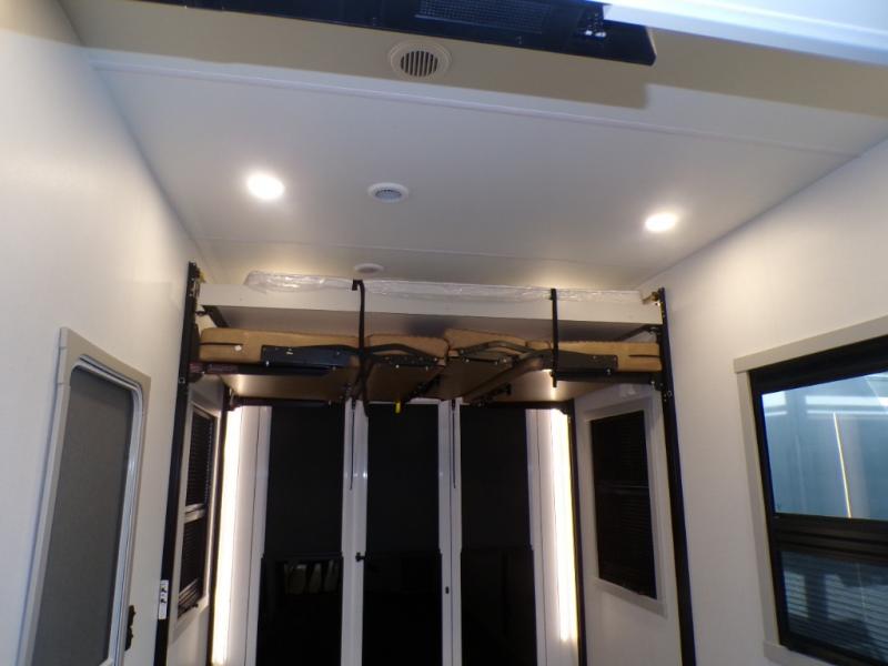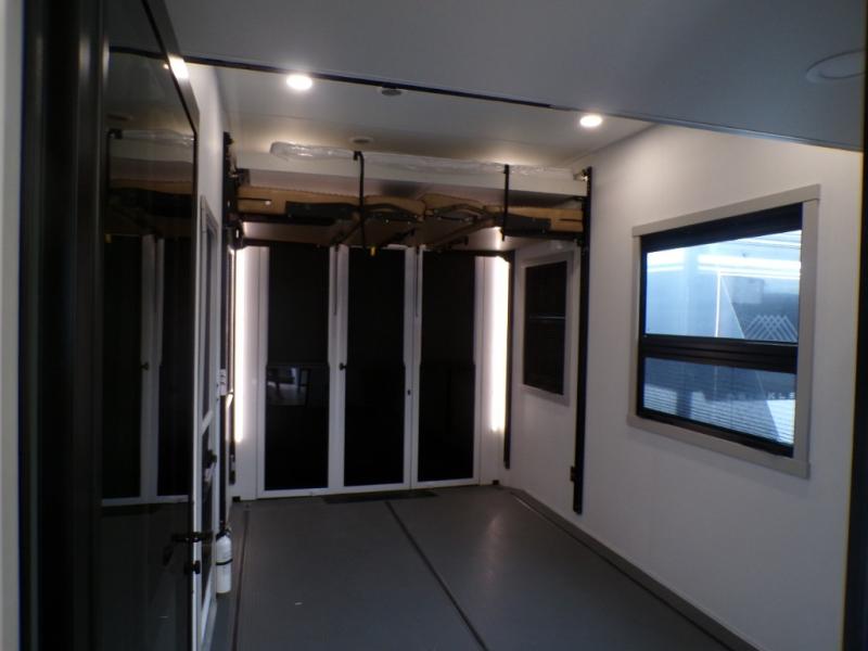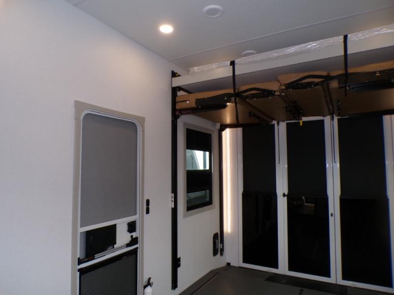 Prepare to be amazed by all the features packed into this toy hauler! There are triple slides that will provide your crew with more space, a 16' separate garage flex area that can sleep five with the loft included, plus a bath and a half for added convenience. The chef in your group will love the middle kitchen with a waterfall island that converts to a counter peninsula, a pull-out pantry, a GE Energy Star 19 cu. ft. refrigerator with ice and filtered water, and much more. In the combined kitchen and living area you'll find a spacious sofa with heat and massage, a fireplace, a TV, plus convenient dog bowls and shoe storage. After your toys are unloaded from the garage, you can relax on the independent dual couches with a Fold-N-Stow table in between. You will find the front private bedroom with a king bed slide out will provide a great night's rest, and you'll also find a walk-in closet, under-bed storage, and a sliding dresser top with hidden storage for special belongings.
