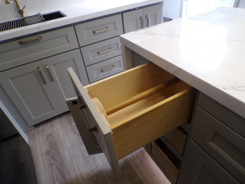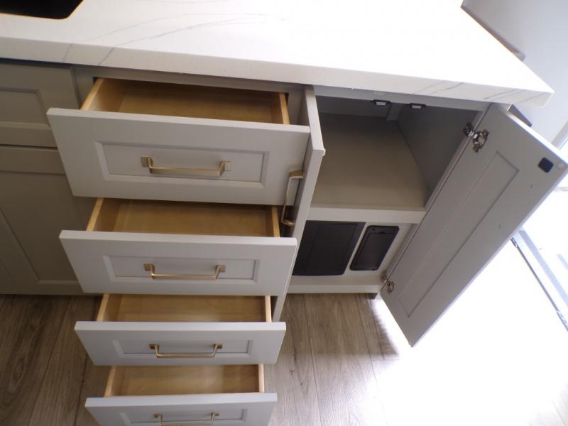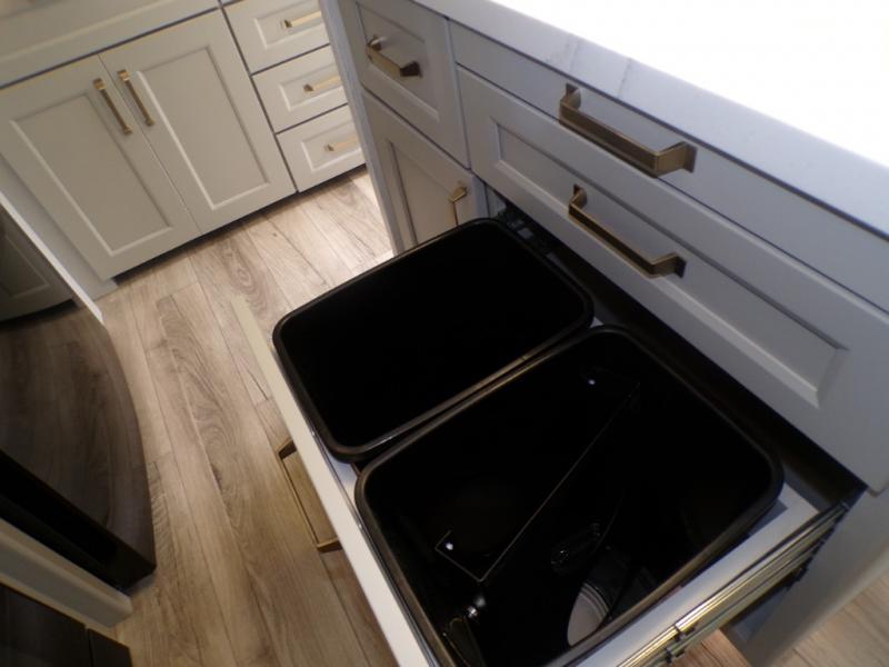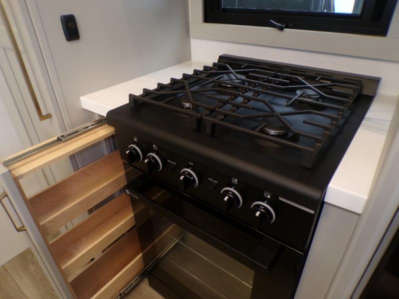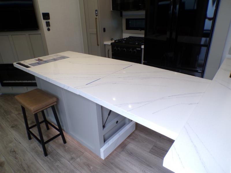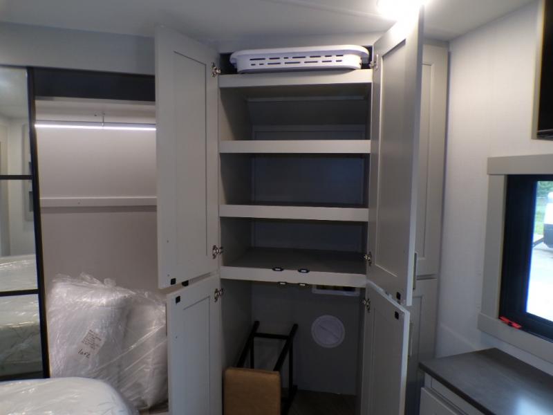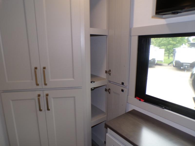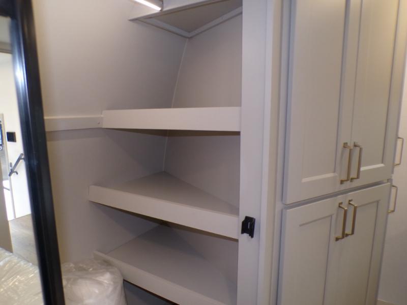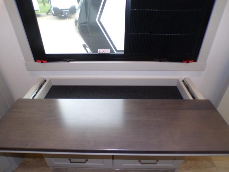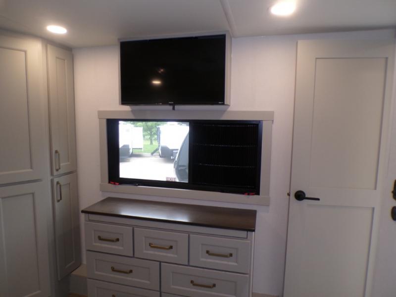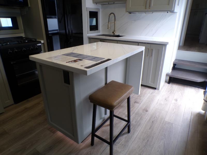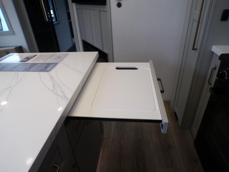 Prepare to be amazed by all the features packed into this toy hauler! There are triple slides that will provide your crew with more space, a 16' separate garage flex area that can sleep five with the loft included, plus a bath and a half for added convenience. The chef in your group will love the middle kitchen with a waterfall island that converts to a counter peninsula, a pull-out pantry, a GE Energy Star 19 cu. ft. refrigerator with ice and filtered water, and much more. In the combined kitchen and living area you'll find a spacious sofa with heat and massage, a fireplace, a TV, plus convenient dog bowls and shoe storage. After your toys are unloaded from the garage, you can relax on the independent dual couches with a Fold-N-Stow table in between. You will find the front private bedroom with a king bed slide out will provide a great night's rest, and you'll also find a walk-in closet, under-bed storage, and a sliding dresser top with hidden storage for special belongings.