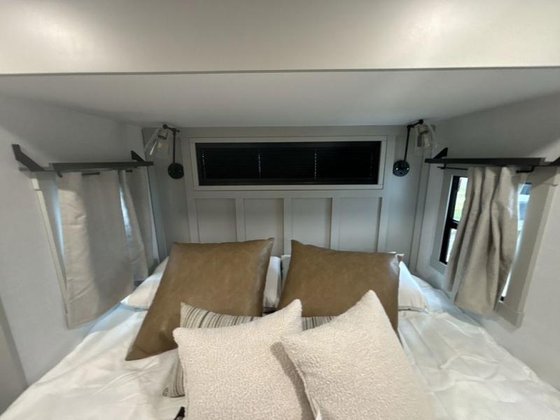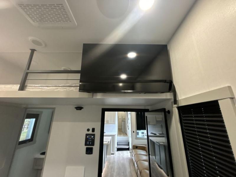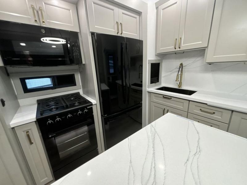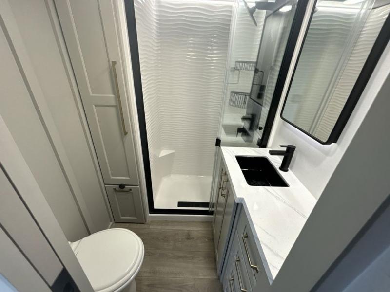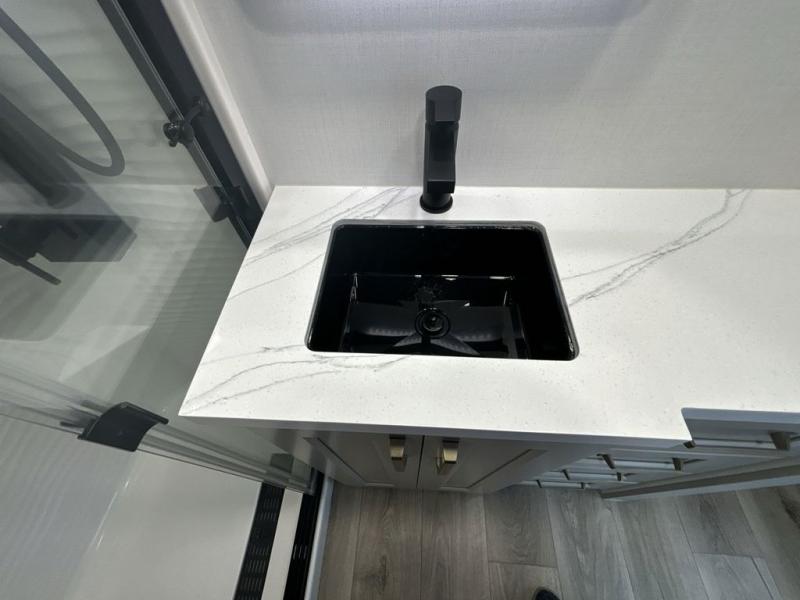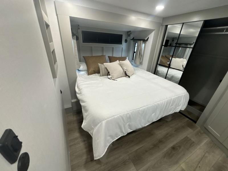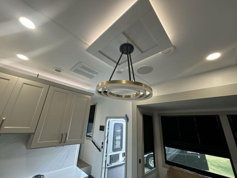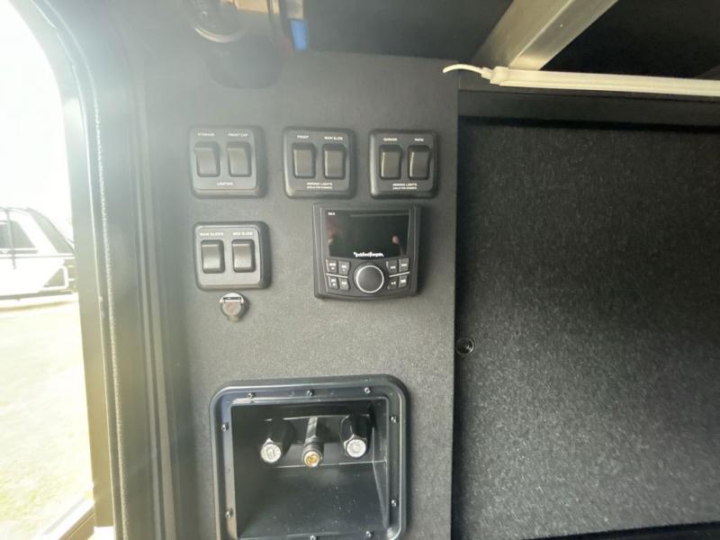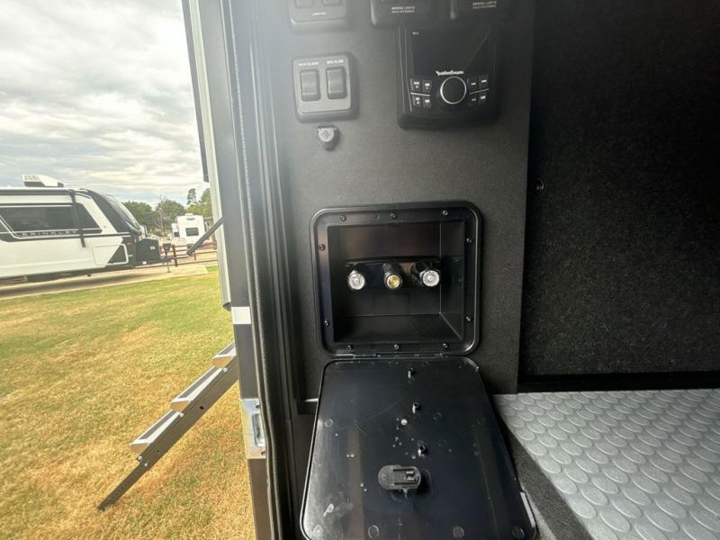 With any Model G toy hauler fifth wheel by Brinkley you will enjoy luxurious amenities, tons of storage space, and innovative features that have been developed and tested in the real world. Durable construction includes an industry leading PDI process, an industry best insulation package, and reinforced and walkable slide roofs. Some of the exterior features you'll find are a 3-way pass-through with a multi-functional flip-up bulkhead wall, under I-beam storage, a MAX-Vision reverse lighting system, and a low-maintenance roof to name a few. A Rockford Fosgate audio system comes standard, along with a OneControl app system that lets you control your fifth wheel's functions right from your mobile device. You will find the solar system with a designated storage area to be ultra convenient, plus there is a FlexPower 5500 with a dual fuel inverter generator for all your power needs. Head inside to find a residential interior with Brinkley's CraftSense wood trim construction, floating entrance steps, integrated window screens and insulated blackout blinds, and residential solid surface countertops plus backsplash. You will also enjoy the neon shower lighting and recessed medicine cabinets in the bath, plus motion activated LED bed lights and dual bedside outlets in the bedroom. Choose a Model G toy hauler fifth wheel to experience all the luxury it has to offer!
