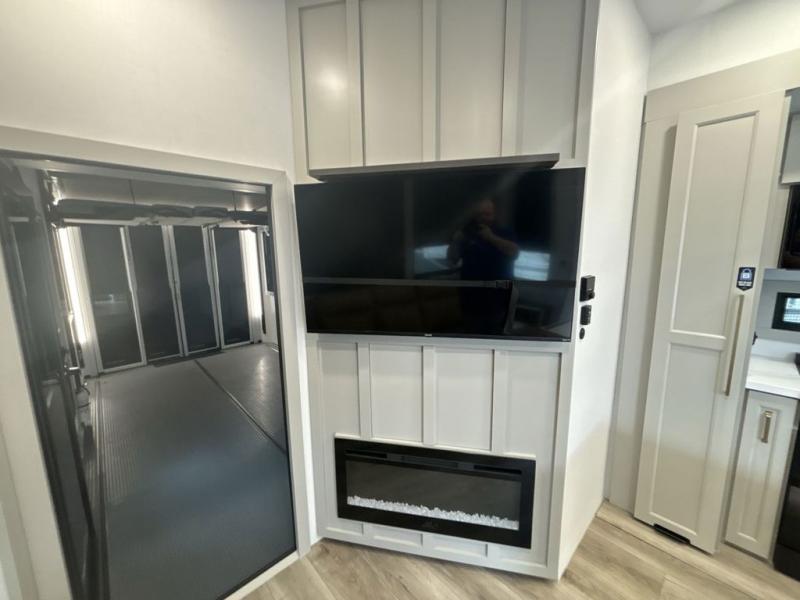 Prepare to be amazed by all the features packed into this toy hauler! There are triple slides that will provide your crew with more space, a 16' separate garage flex area that can sleep five with the loft included, plus a bath and a half for added convenience. The chef in your group will love the middle kitchen with a waterfall island that converts to a counter peninsula, a pull-out pantry, a GE Energy Star 19 cu. ft. refrigerator with ice and filtered water, and much more. In the combined kitchen and living area you'll find a spacious sofa with heat and massage, a fireplace, a TV, plus convenient dog bowls and shoe storage. After your toys are unloaded from the garage, you can relax on the independent dual couches with a Fold-N-Stow table in between, and your guests can sleep on the Happijac® Sofa and Bed Lift system. You will find the front private bedroom with a king bed slide out will provide a great night's rest, and you'll also find a walk-in closet, under-bed storage, and a sliding dresser top with hidden storage for special belongings.
