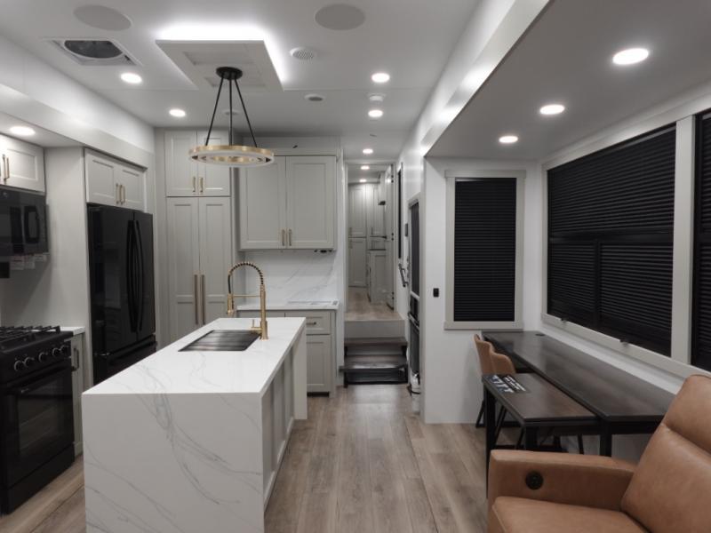 With any Model G toy hauler fifth wheel by Brinkley you will enjoy luxurious amenities, tons of storage space, and innovative features that have been developed and tested in the real world. Durable construction includes an industry leading PDI process, an industry best insulation package, and reinforced and walkable slide roofs. Some of the exterior features you'll find are a 3-way pass-through with a multi-functional flip-up bulkhead wall, under I-beam storage, a MAX-Vision reverse lighting system, and a low-maintenance roof to name a few. A Rockford Fosgate audio system comes standard, along with a OneControl app system that lets you control your fifth wheel's functions right from your mobile device. You will find the solar system with a designated storage area to be ultra convenient, plus there is a FlexPower 5500 with a dual fuel inverter generator for all your power needs. Head inside to find a residential interior with Brinkley's CraftSense wood trim construction, floating entrance steps, integrated window screens and insulated blackout blinds, and residential solid surface countertops plus backsplash. You will also enjoy the neon shower lighting and recessed medicine cabinets in the bath, plus motion activated LED bed lights and dual bedside outlets in the bedroom. Choose a Model G toy hauler fifth wheel to experience all the luxury it has to offer!