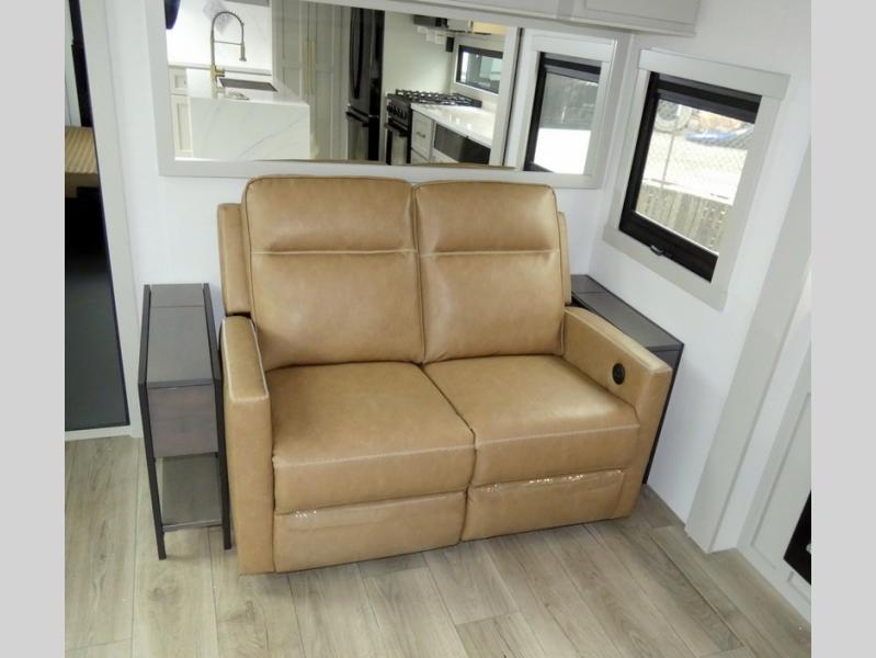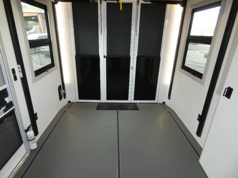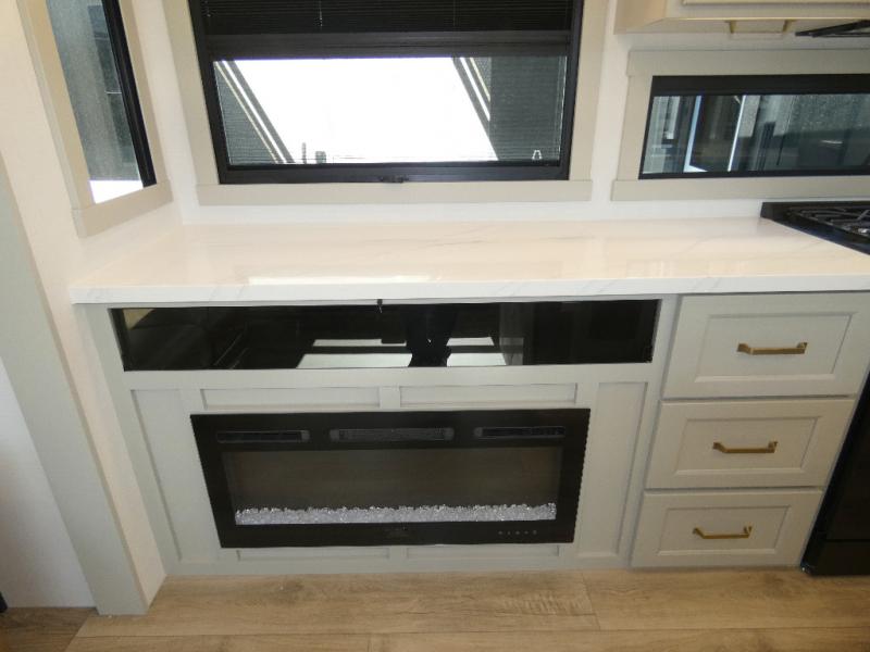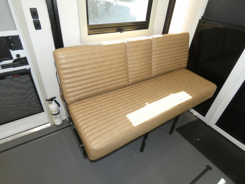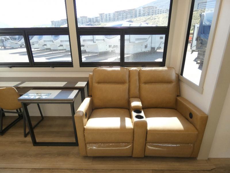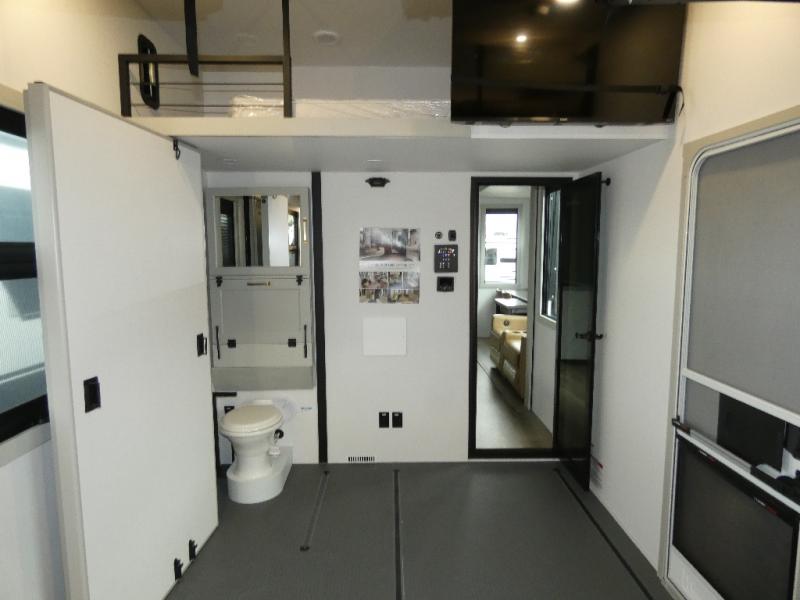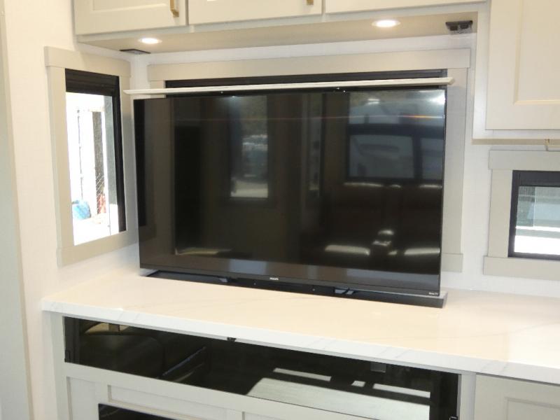 The front bedroom is a serene retreat, featuring a plush king bed, spacious walk-in closet, 32” smart TV, sliding dresser top, and hidden storage for better organization.The bathroom is a haven of convenience, boasting a full bathroom with pull-out linen and trash bin, and a spacious 30 x 42 shower. Perfect for freshening up after a long day of adventure! The kitchen has a pantry featuring adjustable shelving, a hutch, 19 cu. refrigerator, microwave, four-burner cooktop, kitchen island, and convertible dining table/L-desk. Plus, pet bowls for your furry friends! Gather with family and friends in the living room, which features a dual sofa with two recliners, each with heat and massage functions, a televator, and a cozy fireplace. It's the perfect spot to relax and unwind! The garage has a half bathroom, two sofas, and a 43” smart TV, ideal for game days, movie nights, or just relaxing with friends. Outside, enjoy the convenience of a fuel station, three-way pass-thru storage, and LP quick connect. Whether you're an adventure-seeker, or just love to travel in style, this toy hauler has everything you need and more!