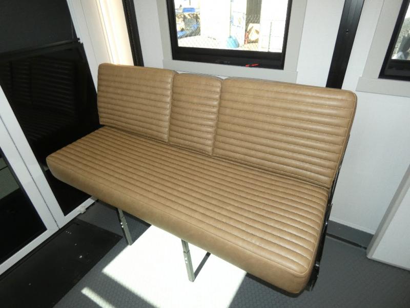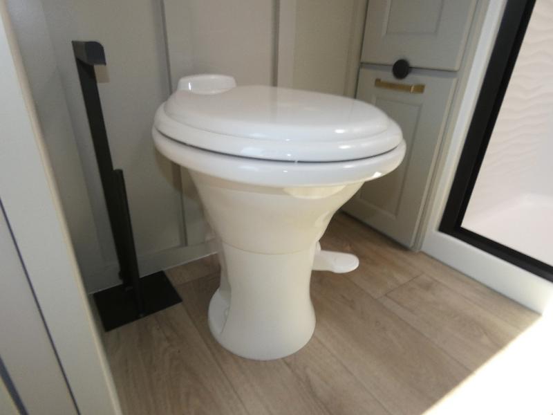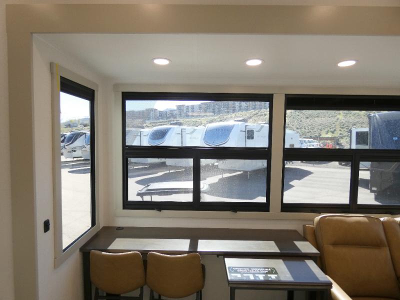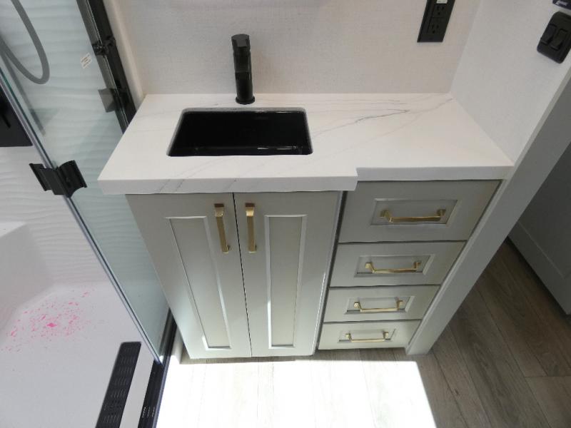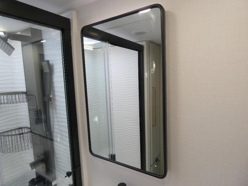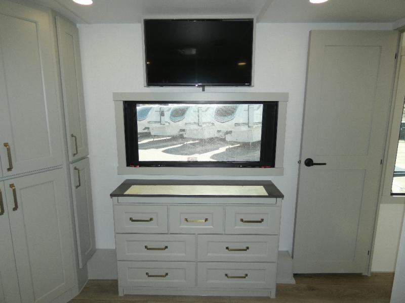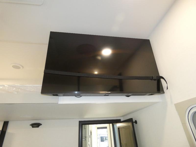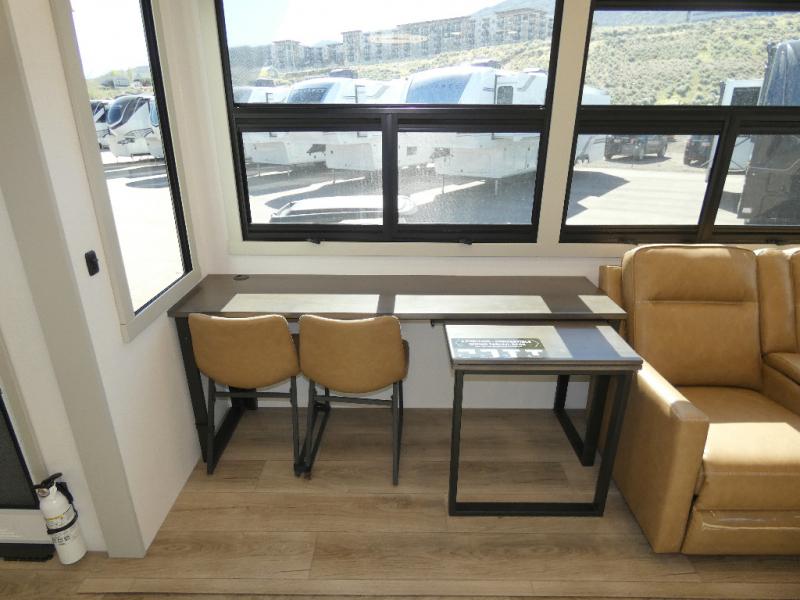 The front bedroom is a serene retreat, featuring a plush king bed, spacious walk-in closet, 32” smart TV, sliding dresser top, and hidden storage for better organization.The bathroom is a haven of convenience, boasting a full bathroom with pull-out linen and trash bin, and a spacious 30 x 42 shower. Perfect for freshening up after a long day of adventure! The kitchen has a pantry featuring adjustable shelving, a hutch, 19 cu. refrigerator, microwave, four-burner cooktop, kitchen island, and convertible dining table/L-desk. Plus, pet bowls for your furry friends! Gather with family and friends in the living room, which features a dual sofa with two recliners, each with heat and massage functions, a televator, and a cozy fireplace. It's the perfect spot to relax and unwind! The garage has a half bathroom, two sofas, and a 43” smart TV, ideal for game days, movie nights, or just relaxing with friends. Outside, enjoy the convenience of a fuel station, three-way pass-thru storage, and LP quick connect. Whether you're an adventure-seeker, or just love to travel in style, this toy hauler has everything you need and more!