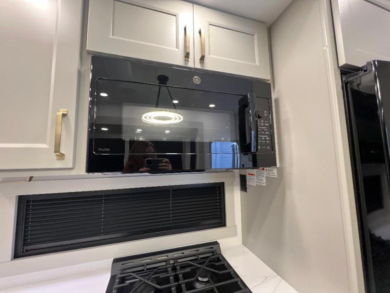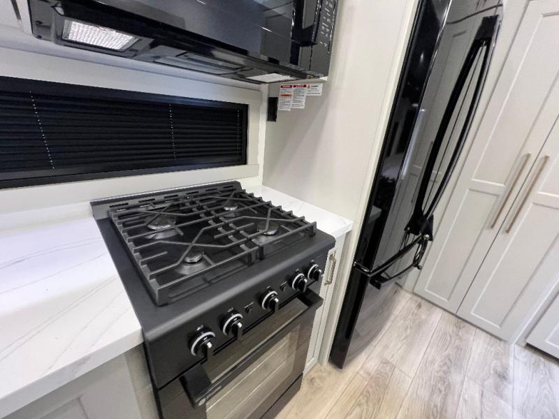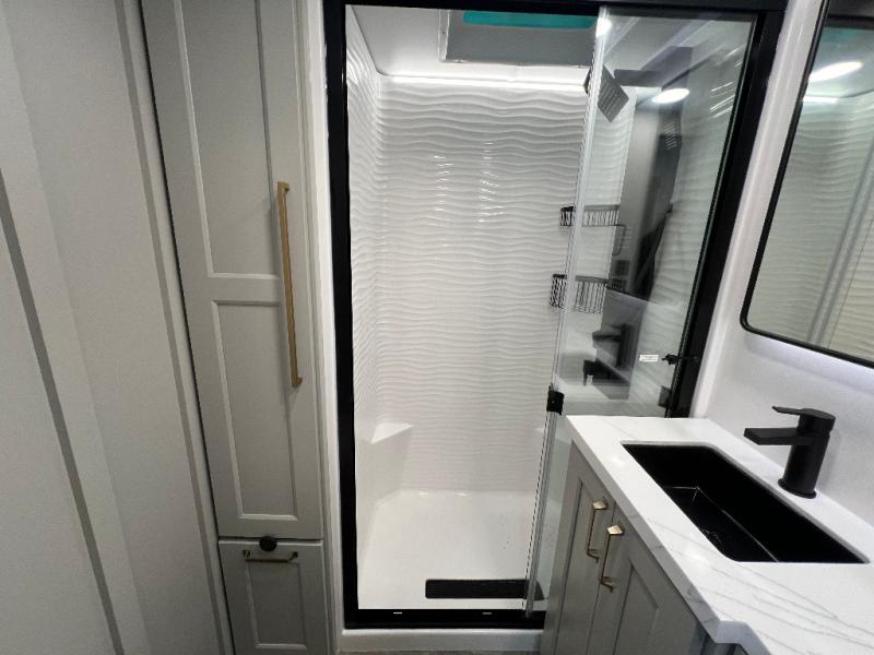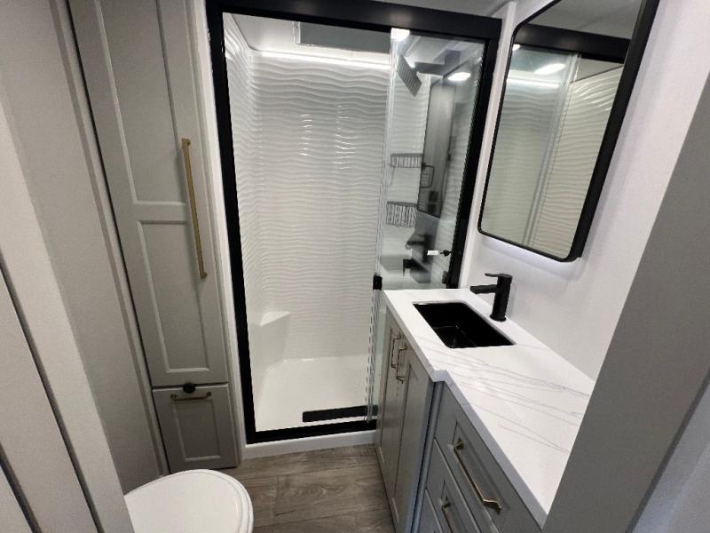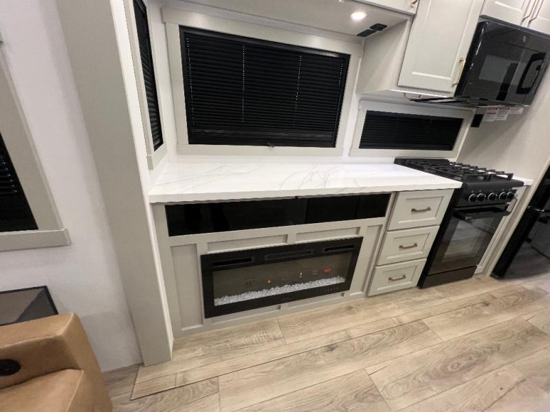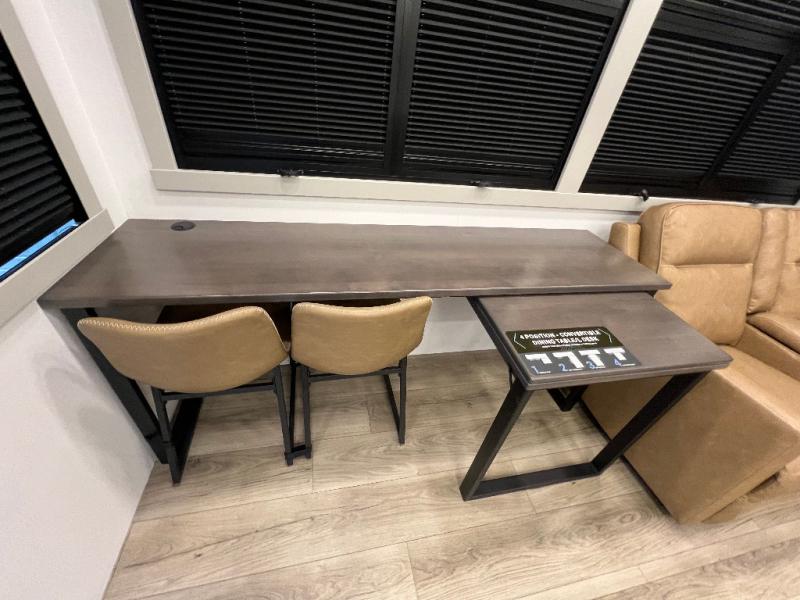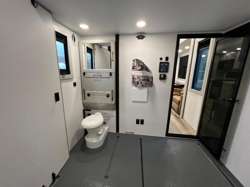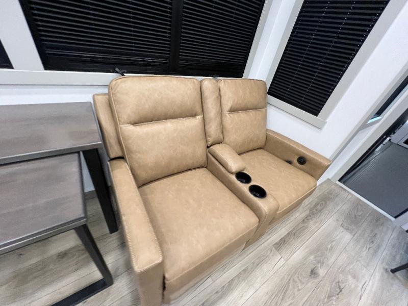 The front bedroom is a serene retreat, featuring a plush king bed, spacious walk-in closet, 32” smart TV, sliding dresser top, and hidden storage for better organization.The bathroom is a haven of convenience, boasting a full bathroom with pull-out linen and trash bin, and a spacious 30 x 42 shower. Perfect for freshening up after a long day of adventure! The kitchen has a pantry featuring adjustable shelving, a hutch, 19 cu. refrigerator, microwave, four-burner cooktop, kitchen island, and convertible dining table/L-desk. Plus, pet bowls for your furry friends! Gather with family and friends in the living room, which features a dual sofa with two recliners, each with heat and massage functions, a televator, and a cozy fireplace. It's the perfect spot to relax and unwind! The garage has a half bathroom, two sofas, and a 43” smart TV, ideal for game days, movie nights, or just relaxing with friends. Outside, enjoy the convenience of a fuel station, three-way pass-thru storage, and LP quick connect. Whether you're an adventure-seeker, or just love to travel in style, this toy hauler has everything you need and more!