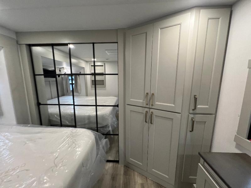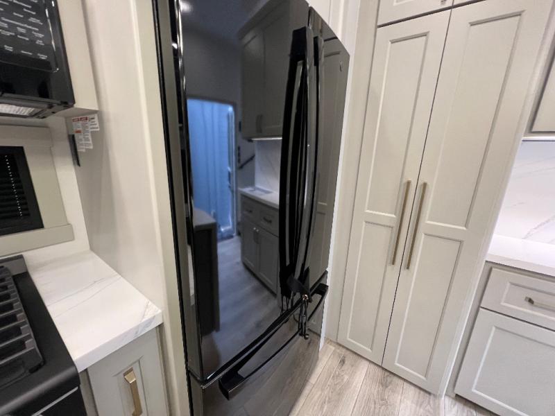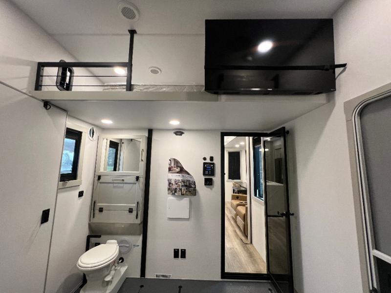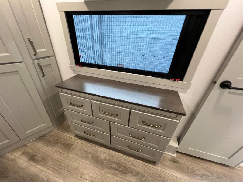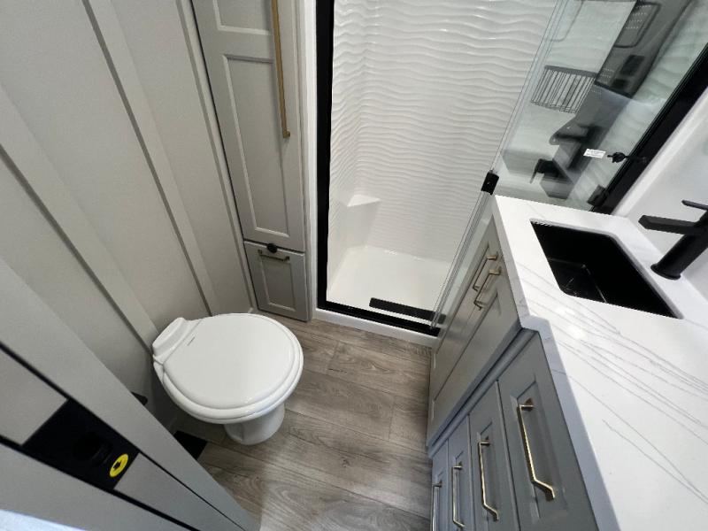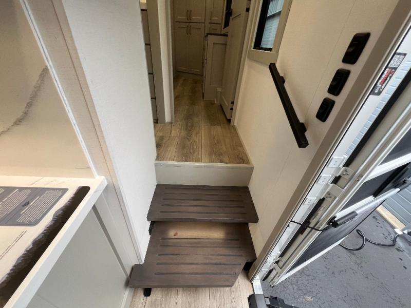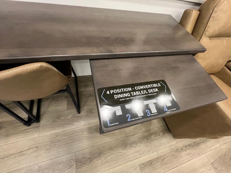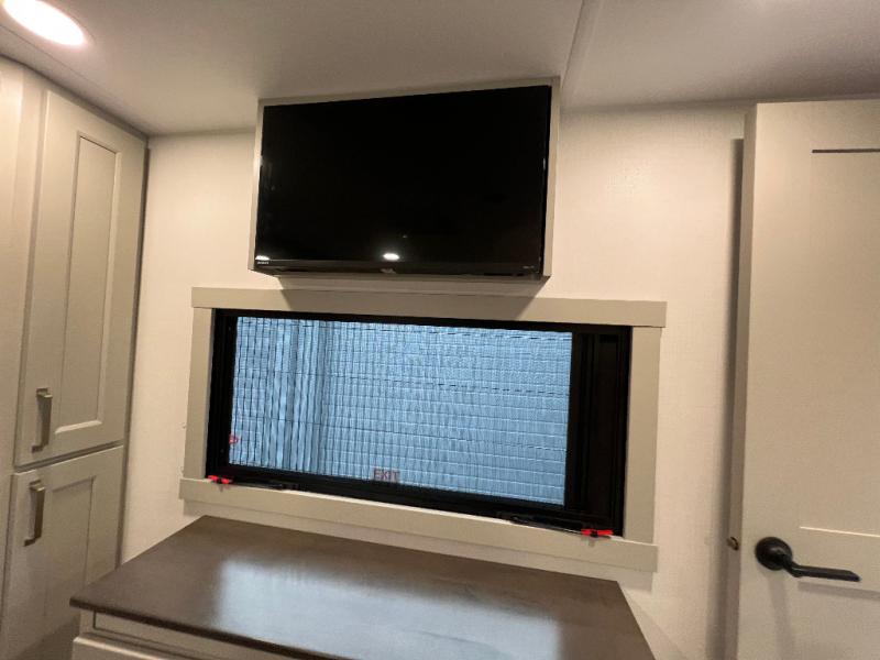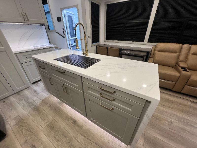 The front bedroom is a serene retreat, featuring a plush king bed, spacious walk-in closet, 32” smart TV, sliding dresser top, and hidden storage for better organization.The bathroom is a haven of convenience, boasting a full bathroom with pull-out linen and trash bin, and a spacious 30 x 42 shower. Perfect for freshening up after a long day of adventure! The kitchen has a pantry featuring adjustable shelving, a hutch, 19 cu. refrigerator, microwave, four-burner cooktop, kitchen island, and convertible dining table/L-desk. Plus, pet bowls for your furry friends! Gather with family and friends in the living room, which features a dual sofa with two recliners, each with heat and massage functions, a televator, and a cozy fireplace. It's the perfect spot to relax and unwind! The garage has a half bathroom, two sofas, and a 43” smart TV, ideal for game days, movie nights, or just relaxing with friends. Outside, enjoy the convenience of a fuel station, three-way pass-thru storage, and LP quick connect. Whether you're an adventure-seeker, or just love to travel in style, this toy hauler has everything you need and more!