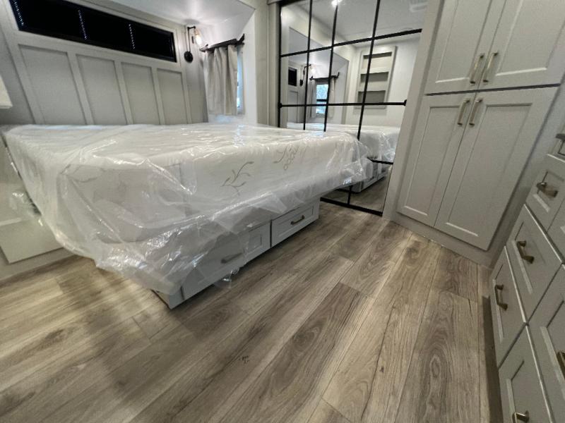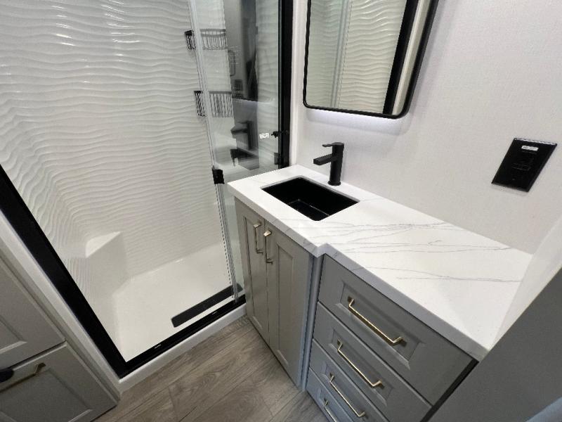 With any Model G toy hauler fifth wheel by Brinkley you will enjoy luxurious amenities, tons of storage space, and innovative features that have been developed and tested in the real world. Durable construction includes an industry leading PDI process, an industry best insulation package, and reinforced and walkable slide roofs. Some of the exterior features you'll find are a 3-way pass-through with a multi-functional flip-up bulkhead wall, under I-beam storage, a MAX-Vision reverse lighting system, and a low-maintenance roof to name a few. A Rockford Fosgate audio system comes standard, along with a OneControl app system that lets you control your fifth wheel's functions right from your mobile device. You will find the solar system with a designated storage area to be ultra convenient, plus there is a FlexPower 5500 with a dual fuel inverter generator for all your power needs. Head inside to find a residential interior with Brinkley's CraftSense wood trim construction, floating entrance steps, integrated window screens and insulated blackout blinds, and residential solid surface countertops plus backsplash. You will also enjoy the neon shower lighting and recessed medicine cabinets in the bath, plus motion activated LED bed lights and dual bedside outlets in the bedroom. Choose a Model G toy hauler fifth wheel to experience all the luxury it has to offer!
