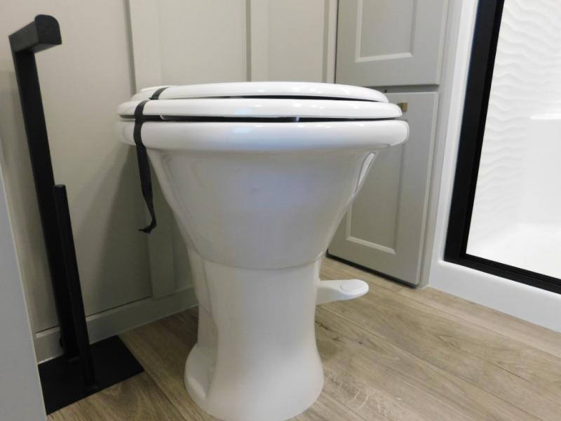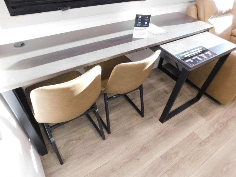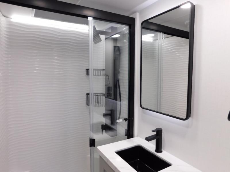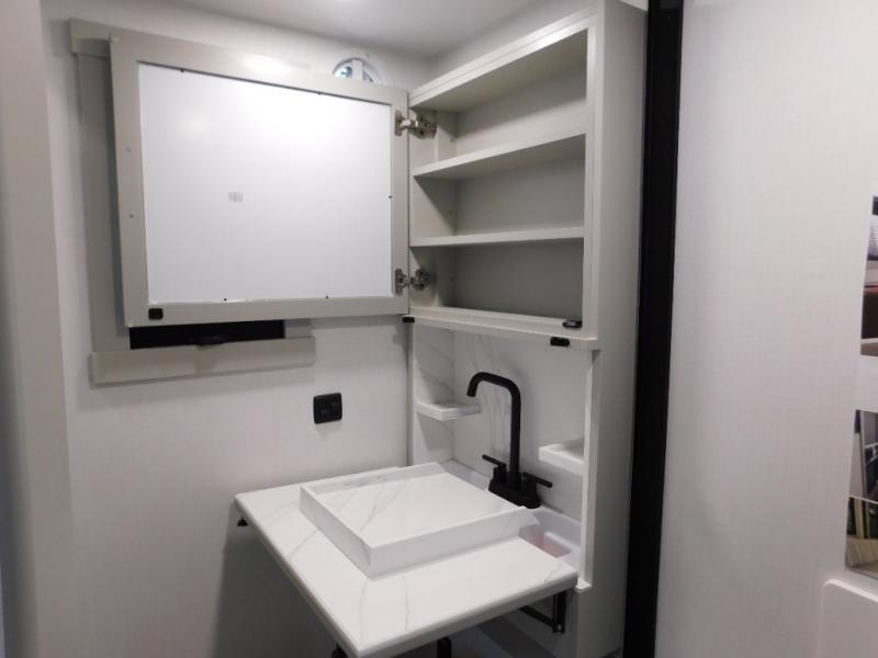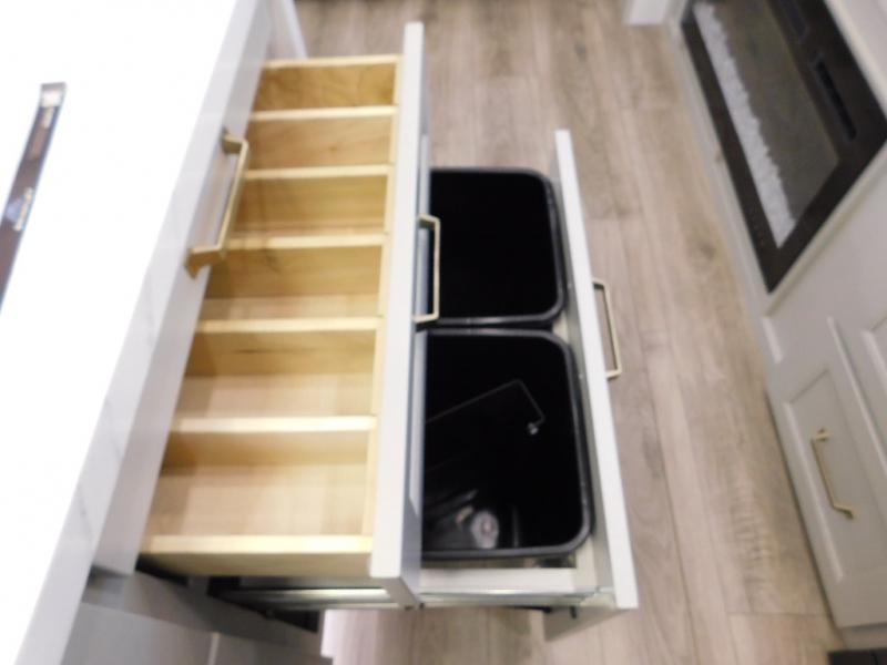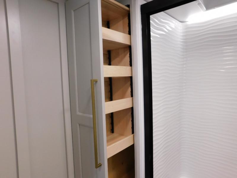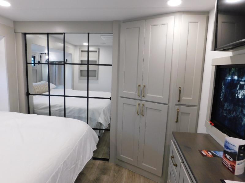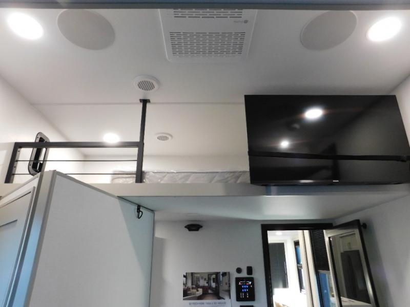 The front bedroom is a serene retreat, featuring a plush king bed, spacious walk-in closet, 32” smart TV, sliding dresser top, and hidden storage for better organization.The bathroom is a haven of convenience, boasting a full bathroom with pull-out linen and trash bin, and a spacious 30 x 42 shower. Perfect for freshening up after a long day of adventure! The kitchen has a pantry featuring adjustable shelving, a hutch, 19 cu. refrigerator, microwave, four-burner cooktop, kitchen island, and convertible dining table/L-desk. Plus, pet bowls for your furry friends! Gather with family and friends in the living room, which features a dual sofa with two recliners, each with heat and massage functions, a televator, and a cozy fireplace. It's the perfect spot to relax and unwind! The garage has a half bathroom, two sofas, and a 43” smart TV, ideal for game days, movie nights, or just relaxing with friends. Outside, enjoy the convenience of a fuel station, three-way pass-thru storage, and LP quick connect. Whether you're an adventure-seeker, or just love to travel in style, this toy hauler has everything you need and more!