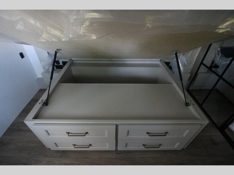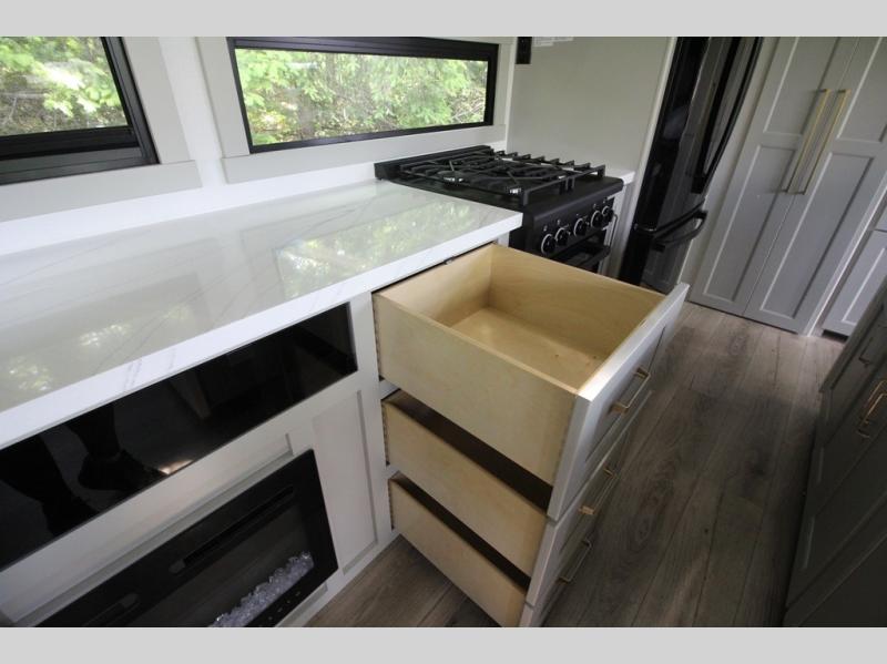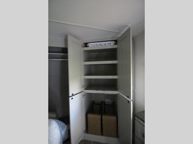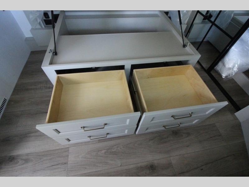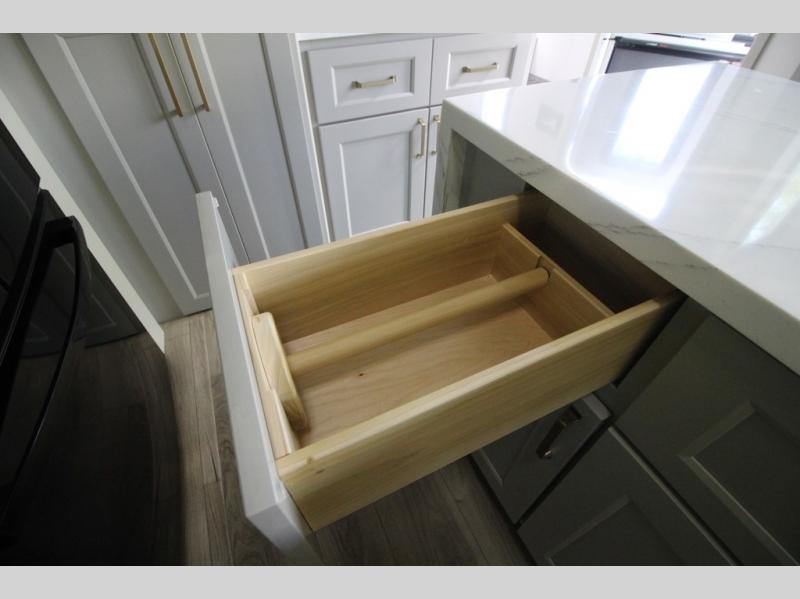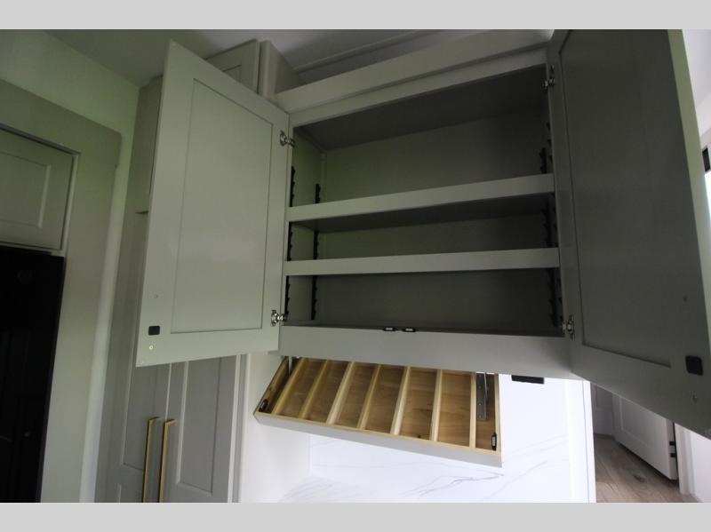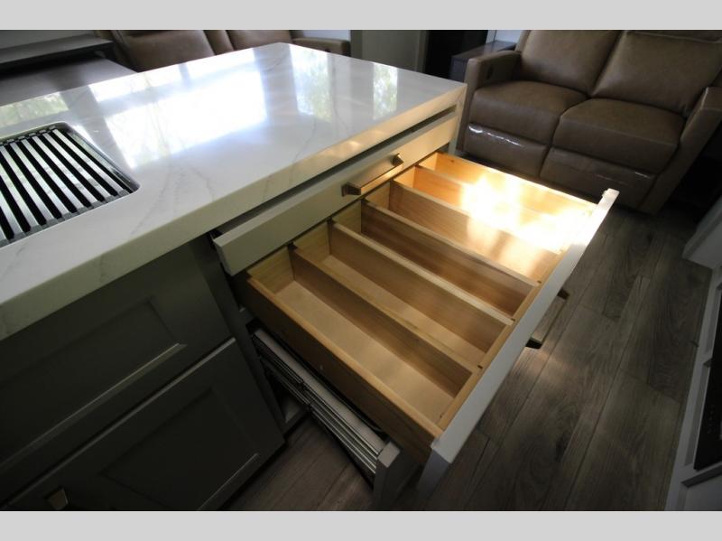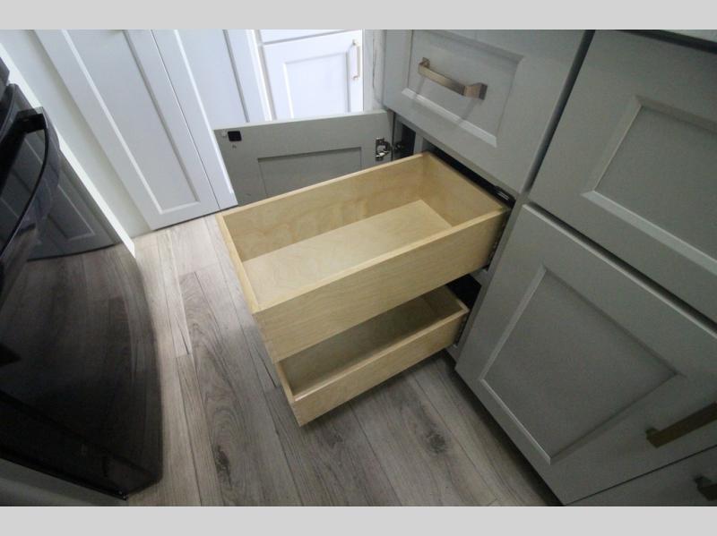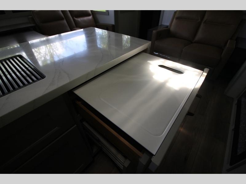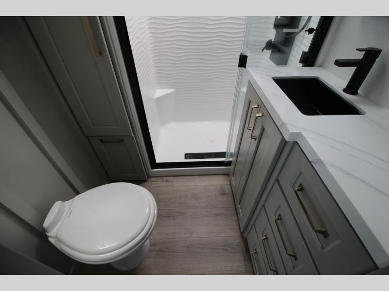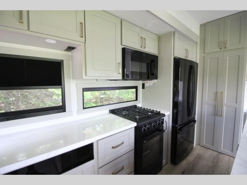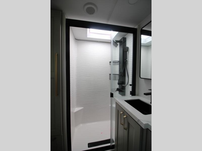 With any Model G toy hauler fifth wheel by Brinkley you will enjoy luxurious amenities, tons of storage space, and innovative features that have been developed and tested in the real world. Durable construction includes an industry leading PDI process, an industry best insulation package, and reinforced and walkable slide roofs. Some of the exterior features you'll find are a 3-way pass-through with a multi-functional flip-up bulkhead wall, under I-beam storage, a MAX-Vision reverse lighting system, and a low-maintenance roof to name a few. A Rockford Fosgate audio system comes standard, along with a OneControl app system that lets you control your fifth wheel's functions right from your mobile device. You will find the solar system with a designated storage area to be ultra convenient, plus there is a FlexPower 5500 with a dual fuel inverter generator for all your power needs. Head inside to find a residential interior with Brinkley's CraftSense wood trim construction, floating entrance steps, integrated window screens and insulated blackout blinds, and residential solid surface countertops plus backsplash. You will also enjoy the neon shower lighting and recessed medicine cabinets in the bath, plus motion activated LED bed lights and dual bedside outlets in the bedroom. Choose a Model G toy hauler fifth wheel to experience all the luxury it has to offer!