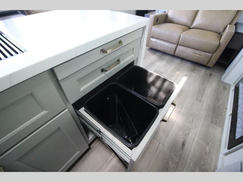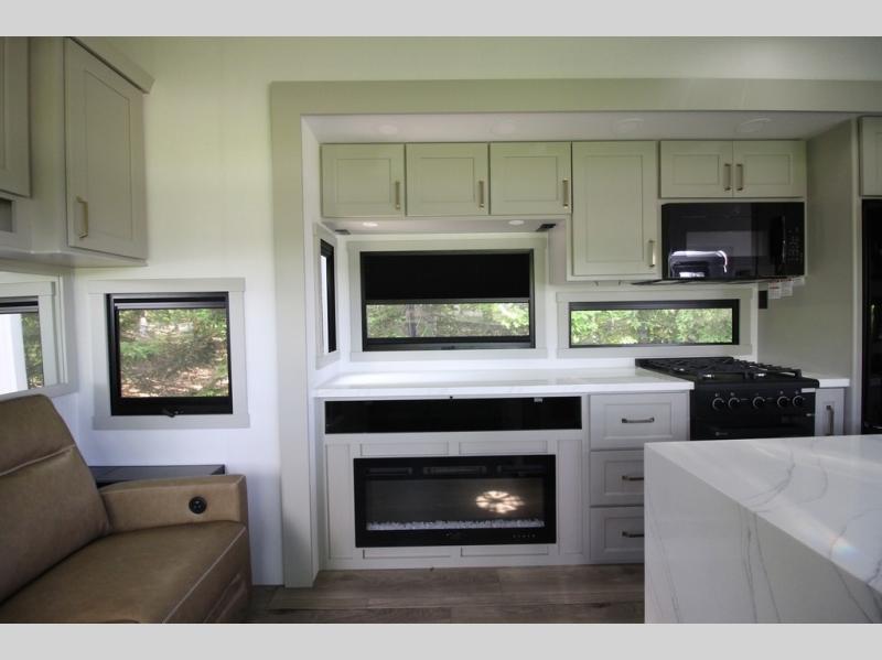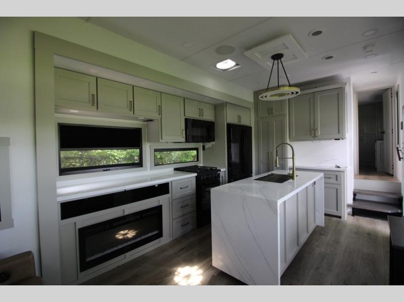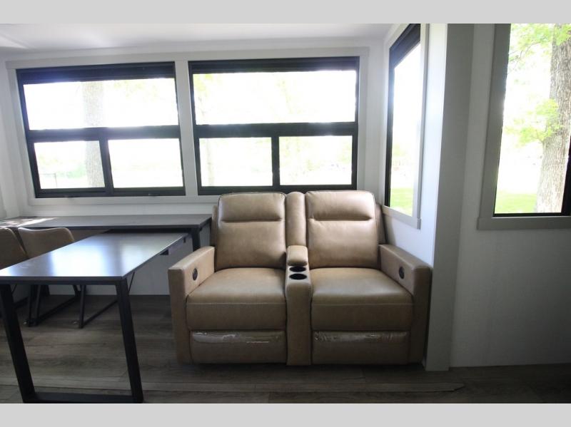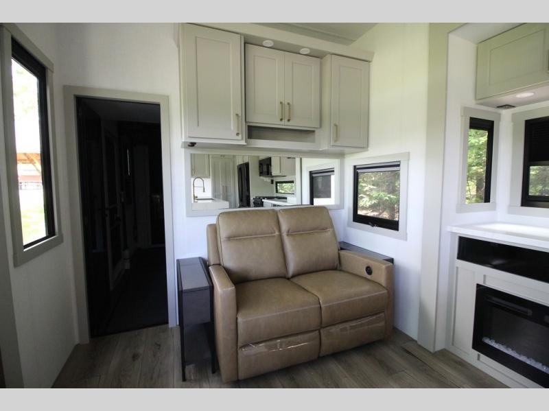 The front bedroom is a serene retreat, featuring a plush king bed, spacious walk-in closet, 32” smart TV, sliding dresser top, and hidden storage for better organization.The bathroom is a haven of convenience, boasting a full bathroom with pull-out linen and trash bin, and a spacious 30 x 42 shower. Perfect for freshening up after a long day of adventure! The kitchen has a pantry featuring adjustable shelving, a hutch, 19 cu. refrigerator, microwave, four-burner cooktop, kitchen island, and convertible dining table/L-desk. Plus, pet bowls for your furry friends! Gather with family and friends in the living room, which features a dual sofa with two recliners, each with heat and massage functions, a televator, and a cozy fireplace. It's the perfect spot to relax and unwind! The garage has a half bathroom, two sofas, and a 43” smart TV, ideal for game days, movie nights, or just relaxing with friends. Outside, enjoy the convenience of a fuel station, three-way pass-thru storage, and LP quick connect. Whether you're an adventure-seeker, or just love to travel in style, this toy hauler has everything you need and more!