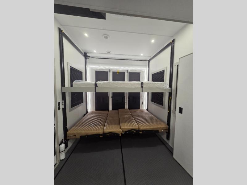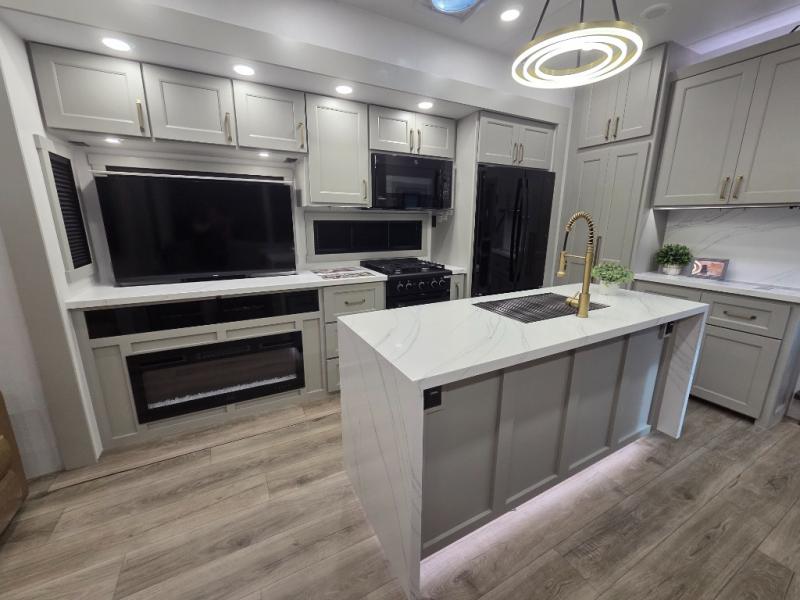 The front bedroom is a serene retreat, featuring a plush king bed, spacious walk-in closet, 32” smart TV, sliding dresser top, and hidden storage for better organization.The bathroom is a haven of convenience, boasting a full bathroom with pull-out linen and trash bin, and a spacious 30 x 42 shower. Perfect for freshening up after a long day of adventure! The kitchen has a pantry featuring adjustable shelving, a hutch, 19 cu. refrigerator, microwave, four-burner cooktop, kitchen island, and convertible dining table/L-desk. Plus, pet bowls for your furry friends! Gather with family and friends in the living room, which features a dual sofa with two recliners, each with heat and massage functions, a televator, and a cozy fireplace. It's the perfect spot to relax and unwind! The garage has a half bathroom, two sofas, and a 43” smart TV, ideal for game days, movie nights, or just relaxing with friends. Outside, enjoy the convenience of a fuel station, three-way pass-thru storage, and LP quick connect. Whether you're an adventure-seeker, or just love to travel in style, this toy hauler has everything you need and more!