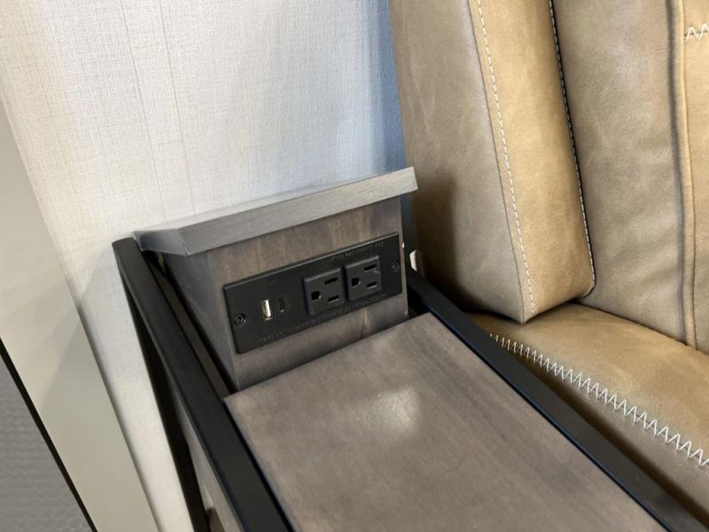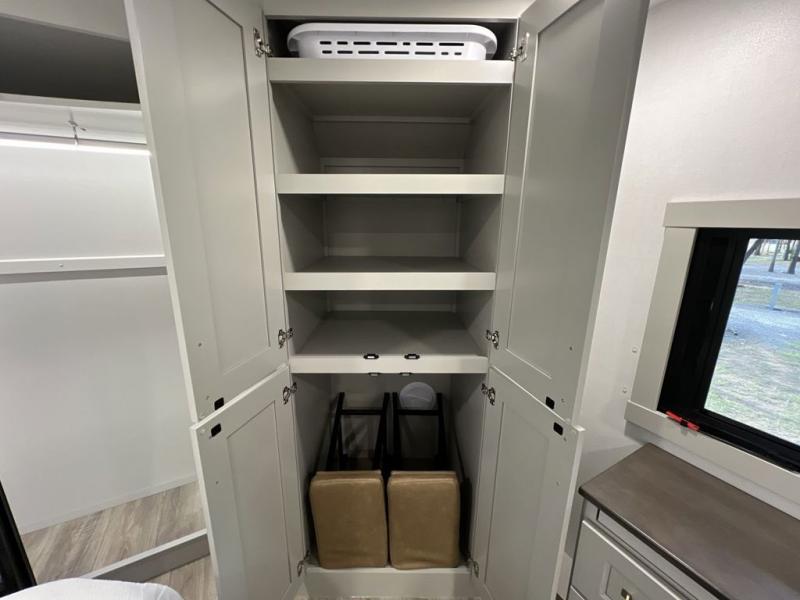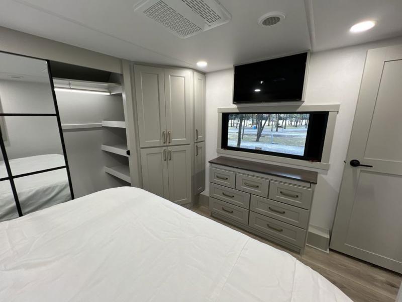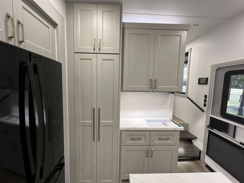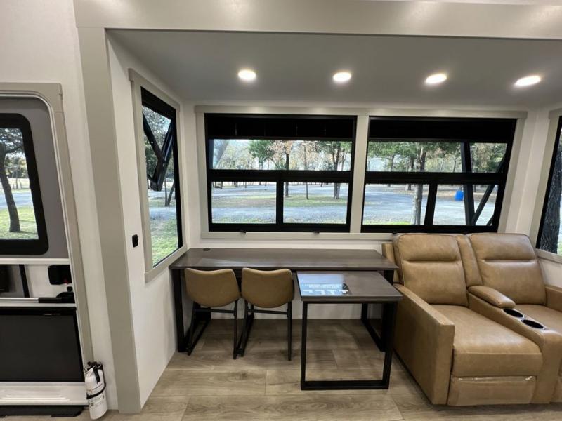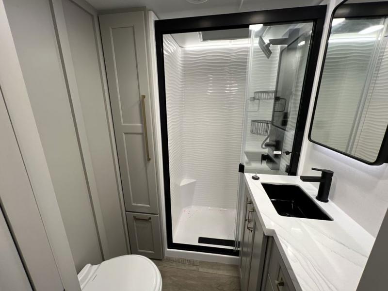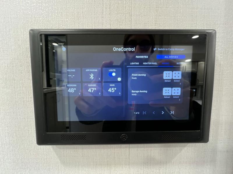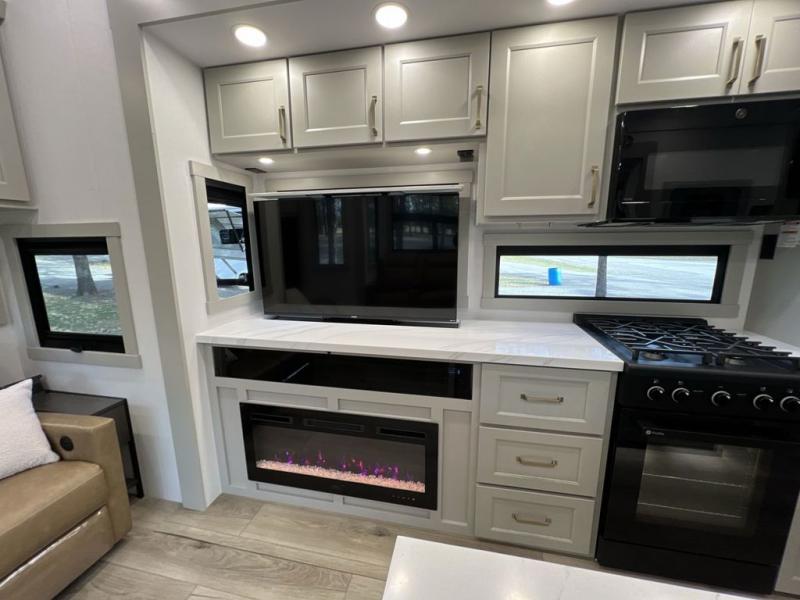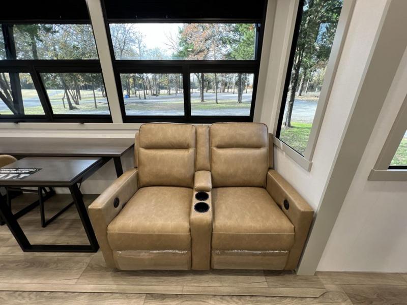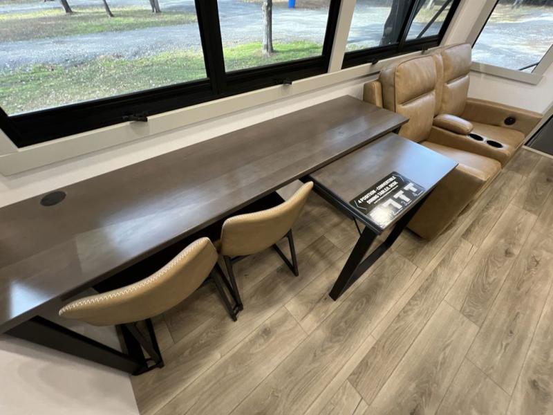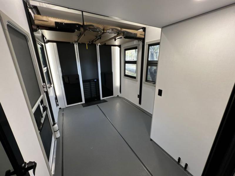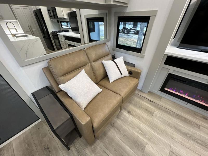 The front bedroom is a serene retreat, featuring a plush king bed, spacious walk-in closet, 32” smart TV, sliding dresser top, and hidden storage for better organization.The bathroom is a haven of convenience, boasting a full bathroom with pull-out linen and trash bin, and a spacious 30 x 42 shower. Perfect for freshening up after a long day of adventure! The kitchen has a pantry featuring adjustable shelving, a hutch, 19 cu. refrigerator, microwave, four-burner cooktop, kitchen island, and convertible dining table/L-desk. Plus, pet bowls for your furry friends! Gather with family and friends in the living room, which features a dual sofa with two recliners, each with heat and massage functions, a televator, and a cozy fireplace. It's the perfect spot to relax and unwind! The garage has a half bathroom, two sofas, and a 43” smart TV, ideal for game days, movie nights, or just relaxing with friends. Outside, enjoy the convenience of a fuel station, three-way pass-thru storage, and LP quick connect. Whether you're an adventure-seeker, or just love to travel in style, this toy hauler has everything you need and more!