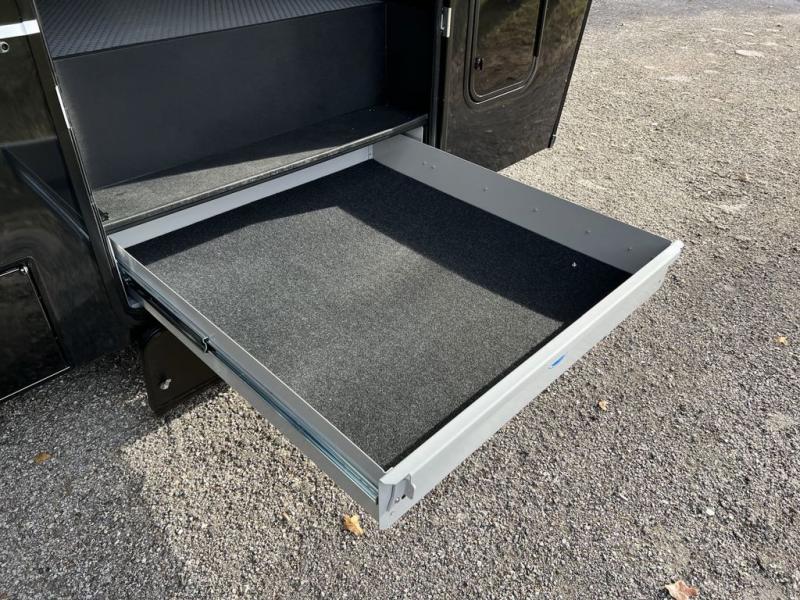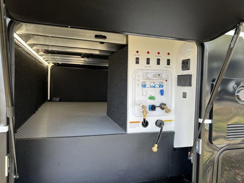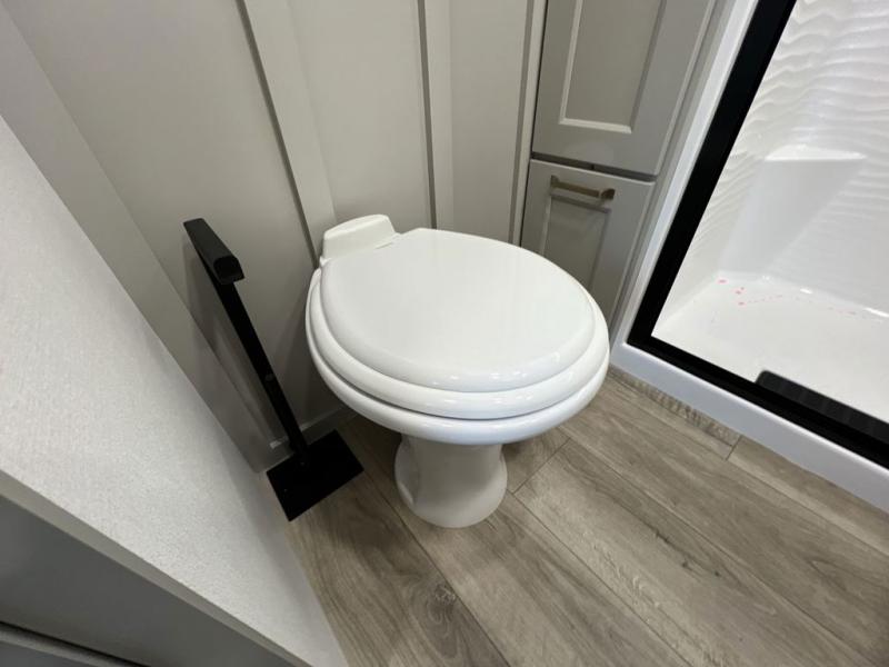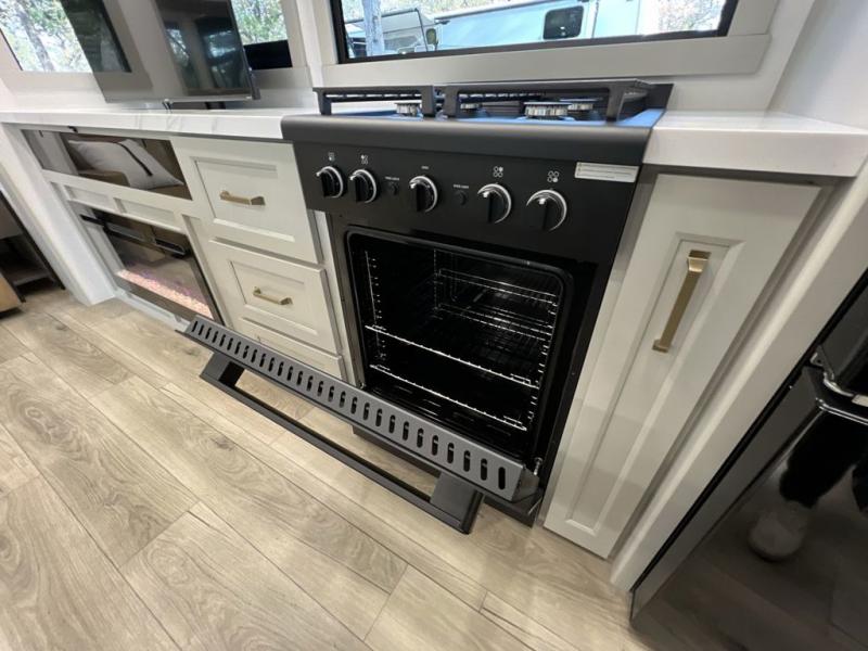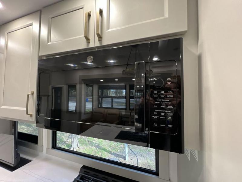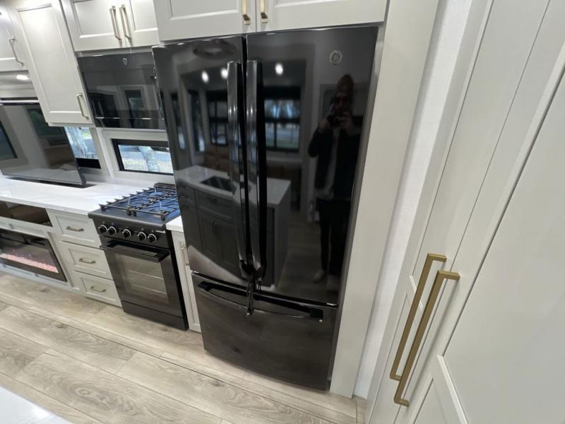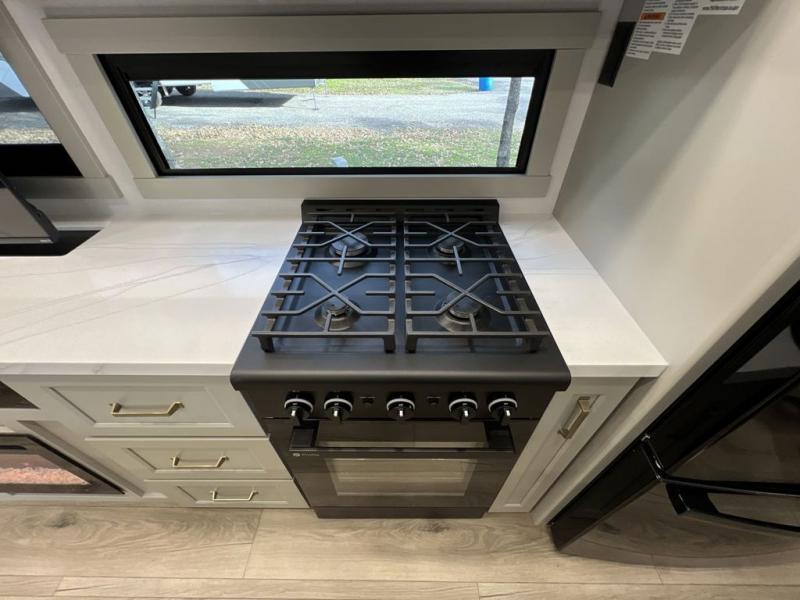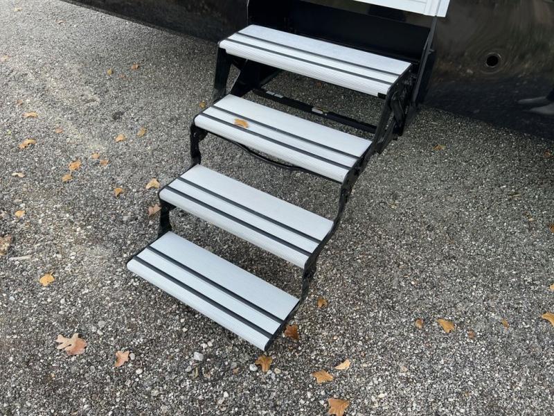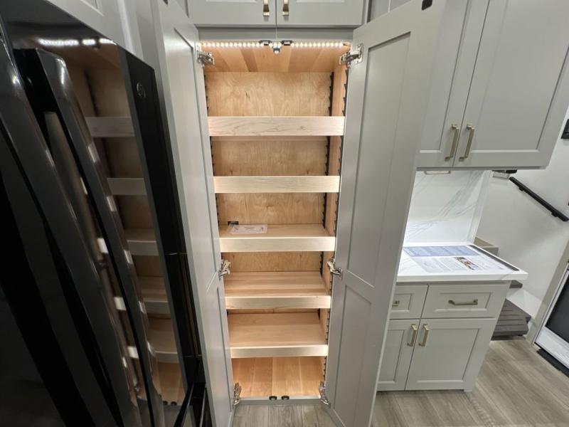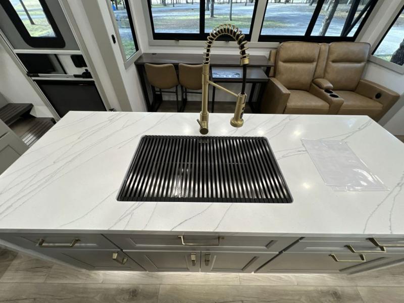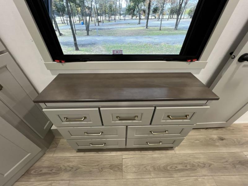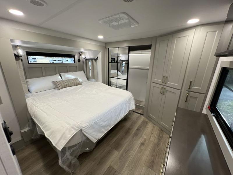The front bedroom is a serene retreat, featuring a plush king bed, spacious walk-in closet, 32” smart TV, sliding dresser top, and hidden storage for better organization.The bathroom is a haven of convenience, boasting a full bathroom with pull-out linen and trash bin, and a spacious 30 x 42 shower. Perfect for freshening up after a long day of adventure! The kitchen has a pantry featuring adjustable shelving, a hutch, 19 cu. refrigerator, microwave, four-burner cooktop, kitchen island, and convertible dining table/L-desk. Plus, pet bowls for your furry friends! Gather with family and friends in the living room, which features a dual sofa with two recliners, each with heat and massage functions, a televator, and a cozy fireplace. It's the perfect spot to relax and unwind! The garage has a half bathroom, two sofas, and a 43” smart TV, ideal for game days, movie nights, or just relaxing with friends. Outside, enjoy the convenience of a fuel station, three-way pass-thru storage, and LP quick connect. Whether you're an adventure-seeker, or just love to travel in style, this toy hauler has everything you need and more!