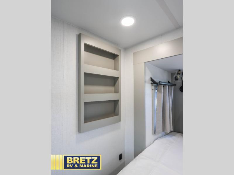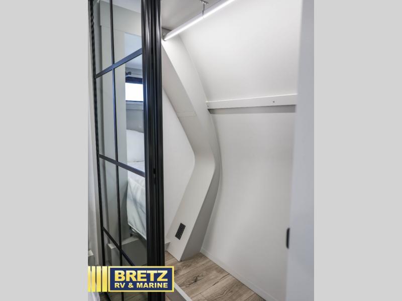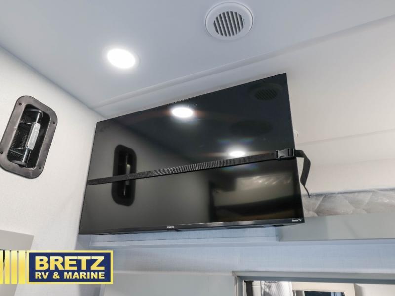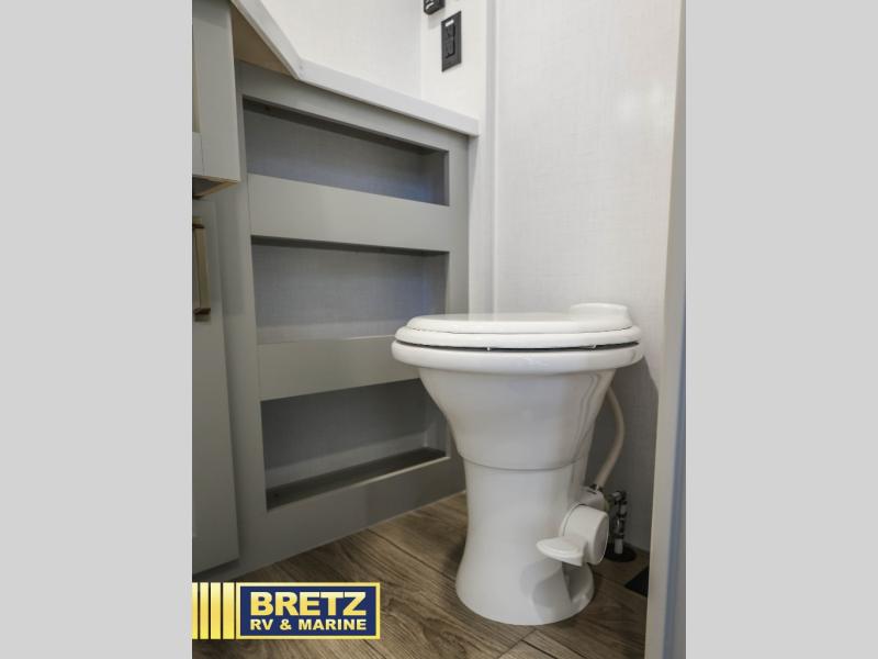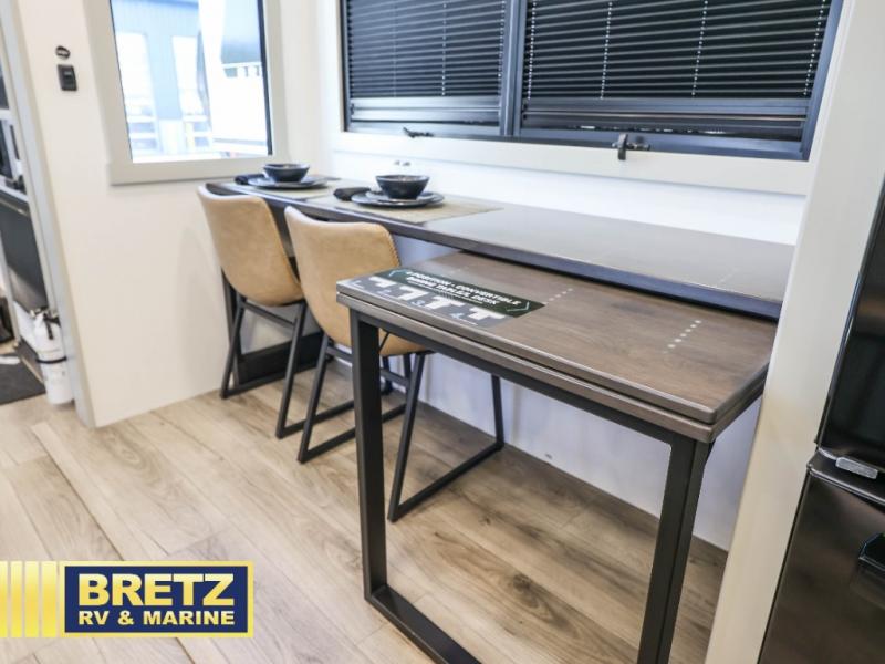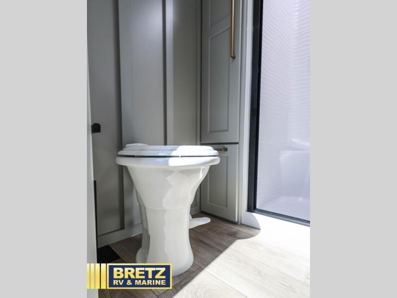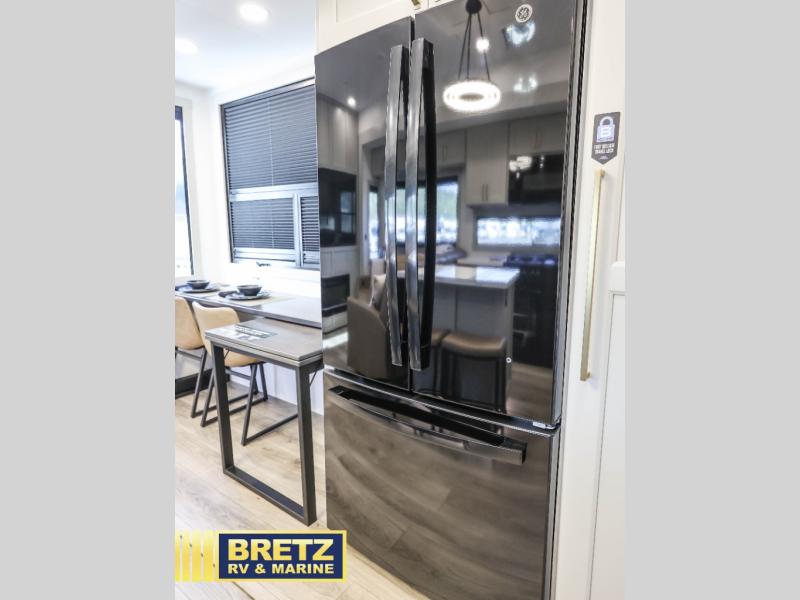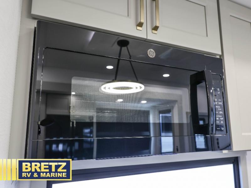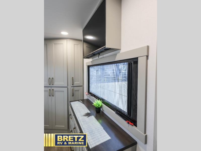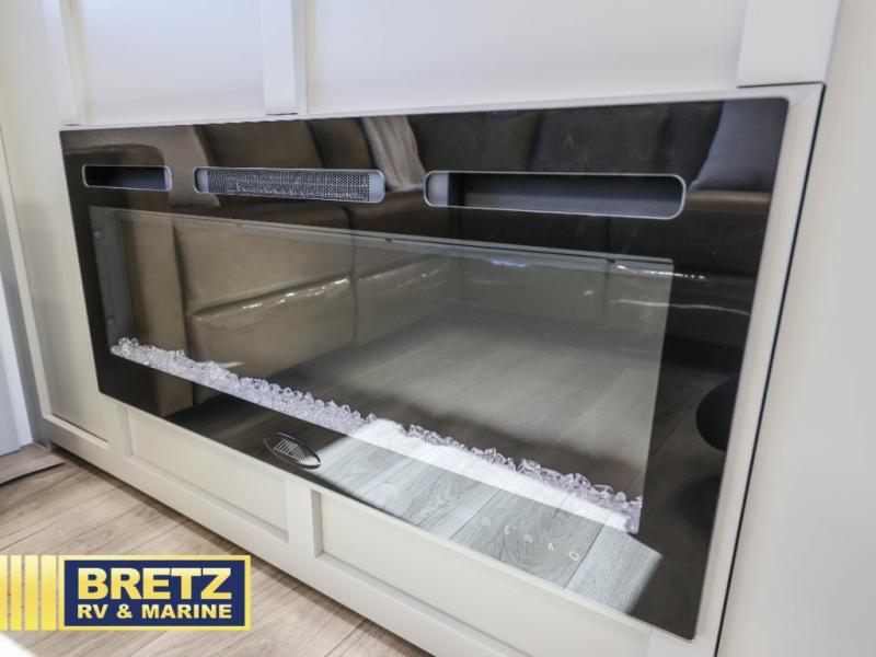 Whether you use this toy hauler to haul your favorite ride-on toys or as a mobile office, you're sure to love every inch of it! The 14' separate garage includes a Fold-N-Stow table and independent dual sofas, along with a full bath and a loft/storage with a twin bed for more sleeping space. The middle kitchen is every chef's dream with its GE appliances, kitchen island, and convenient features, such as pull-out trash bins and a cutting board, a pull-down knife rack and utensil tray, and a pull-out pantry/utility closet! Right next to the kitchen is the living room with a L-sofa with four modes, a 65" Phillips Smart TV and a fireplace, plus a convertible dining table/L-desk where you can dine or get some work done. You'll love the second full bath up front close to the private bedroom, and here, you'll find a king bed slide out, under-bed storage drawers and motion lights, a walk-in closet with cordless vacuum prep, and a sliding dresser top with hidden storage for valuables. There is also washer and dryer prep in the bedroom and garage, making this toy hauler full-time capable!