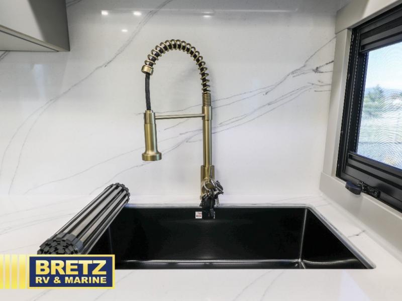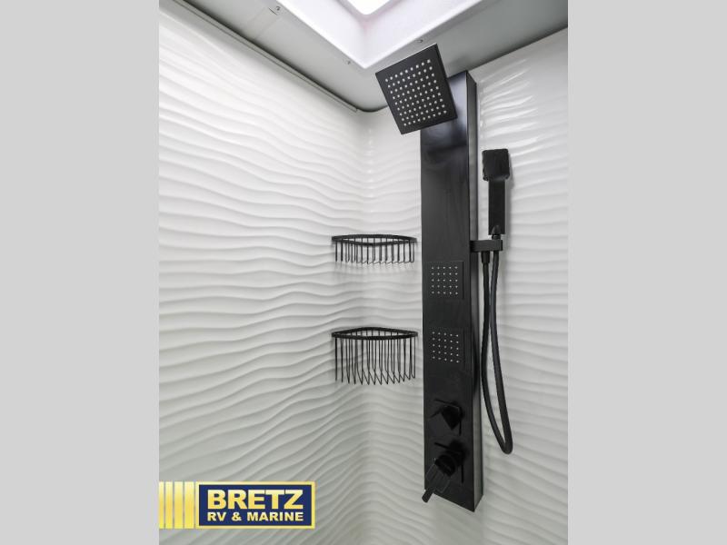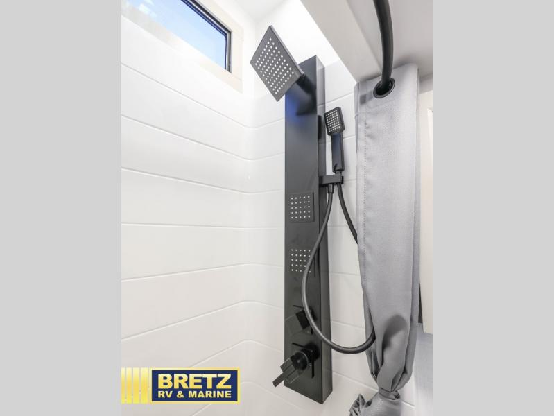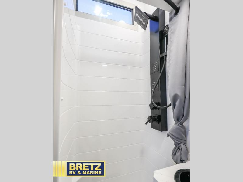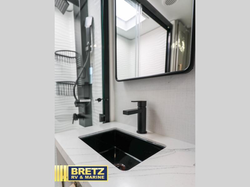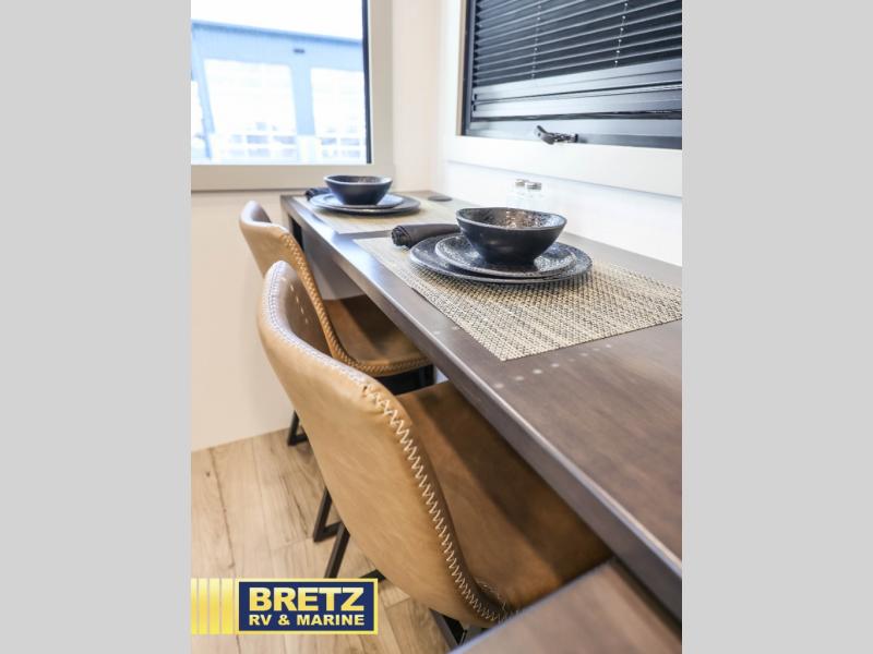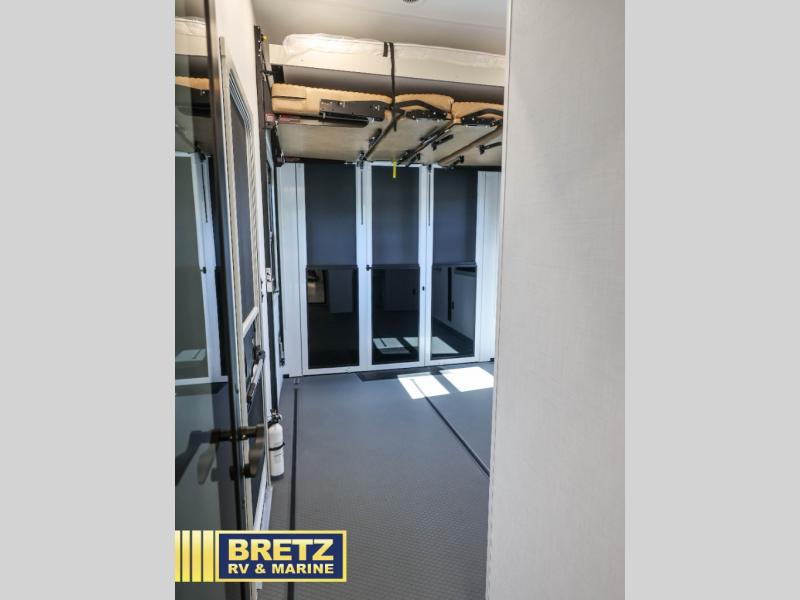 With any Model G toy hauler fifth wheel by Brinkley you will enjoy luxurious amenities, tons of storage space, and innovative features that have been developed and tested in the real world. Durable construction includes an industry leading PDI process, an industry best insulation package, and reinforced and walkable slide roofs. Some of the exterior features you'll find are a 3-way pass-through with a multi-functional flip-up bulkhead wall, under I-beam storage, a MAX-Vision reverse lighting system, and a low-maintenance roof to name a few. A Rockford Fosgate audio system comes standard, along with a OneControl app system that lets you control your fifth wheel's functions right from your mobile device. You will find the solar system with a designated storage area to be ultra convenient, plus there is a FlexPower 5500 with a dual fuel inverter generator for all your power needs. Head inside to find a residential interior with Brinkley's CraftSense wood trim construction, floating entrance steps, integrated window screens and insulated blackout blinds, and residential solid surface countertops plus backsplash. You will also enjoy the neon shower lighting and recessed medicine cabinets in the bath, plus motion activated LED bed lights and dual bedside outlets in the bedroom. Choose a Model G toy hauler fifth wheel to experience all the luxury it has to offer!