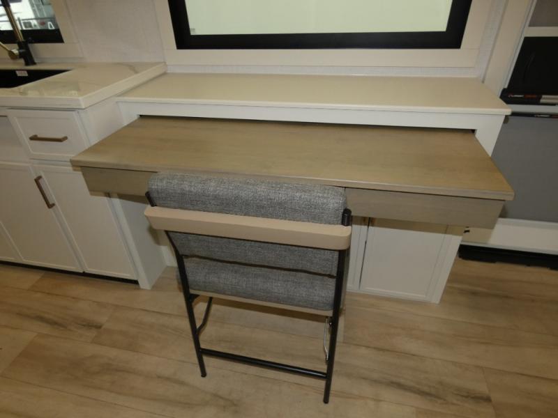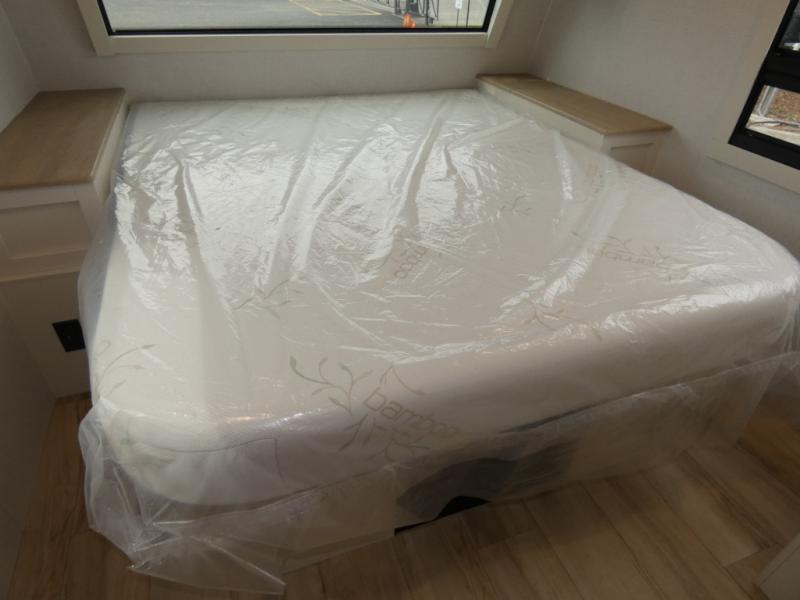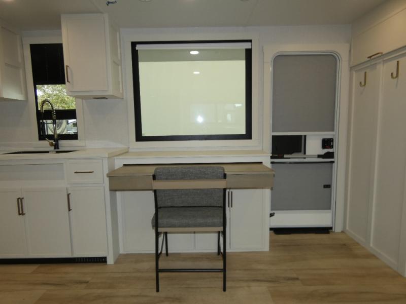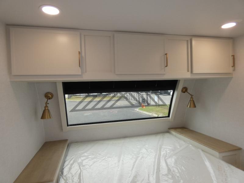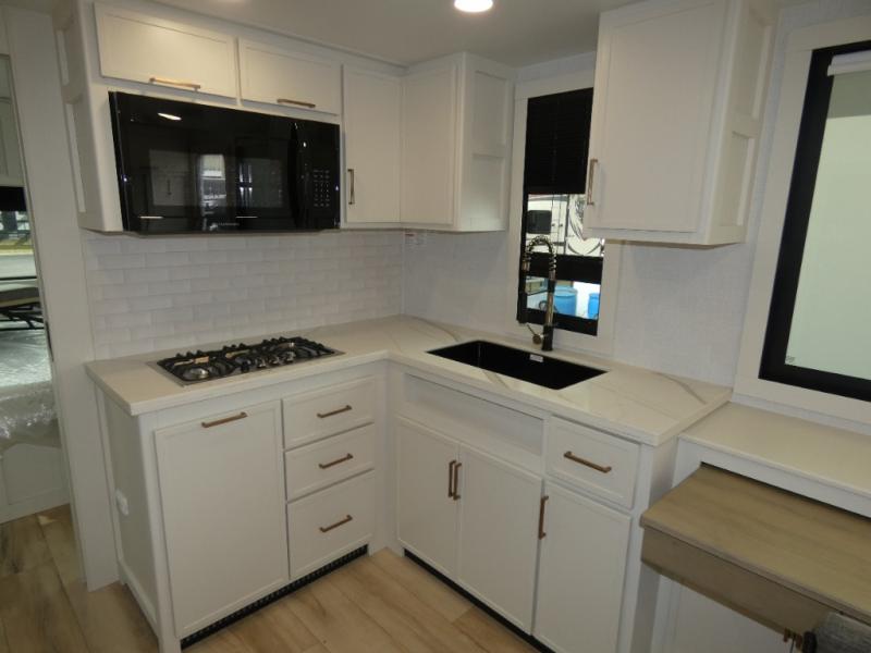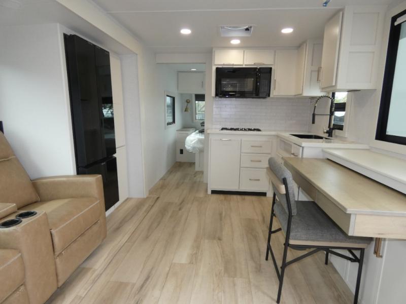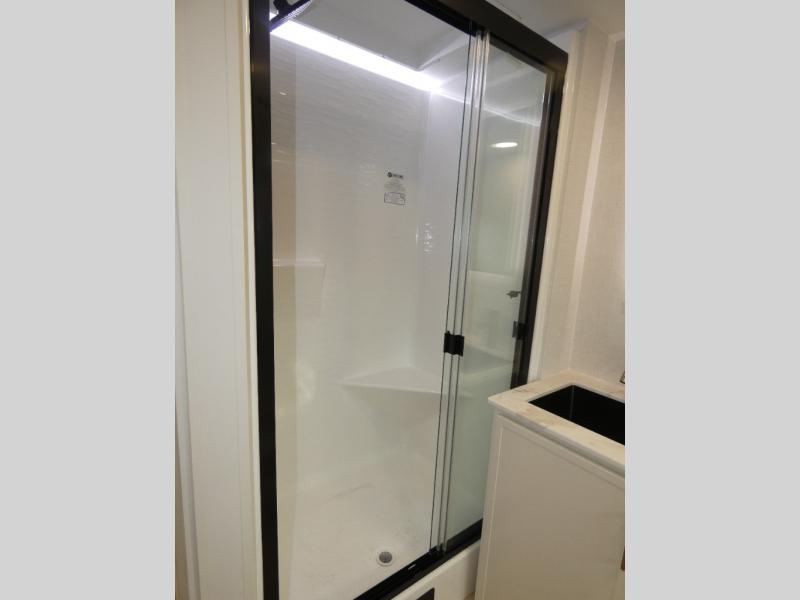 One look at this travel trailer and you'll be sold! The full rear bath features a spacious 30" x 42" shower with a glass shower door, built-in seat, and Maxxair fan to name a few comforts. The front private bedroom features a 66" x 80" king bed with a MaxSpace split-level wardrobe underneath to store shoes, clothes, and more! A slide out in the combined living area and kitchen makes your space more open, and you'll enjoy relaxing on the theater seating here in the evenings. There is also a 48" x 40" smart window with a screen that will allow you to view your indoor/outdoor projector screen for movies! The full kitchen includes a three burner stovetop, residential 30" convection microwave, 12 cu. ft. 12V refrigerator, plus a trash bin and Stow N' Go paper towel holder for added convenience. You can choose to eat outdoors under the 19' electric awning with LED lights or stay inside to dine at the pull-out dining table with a drawer for added storage!