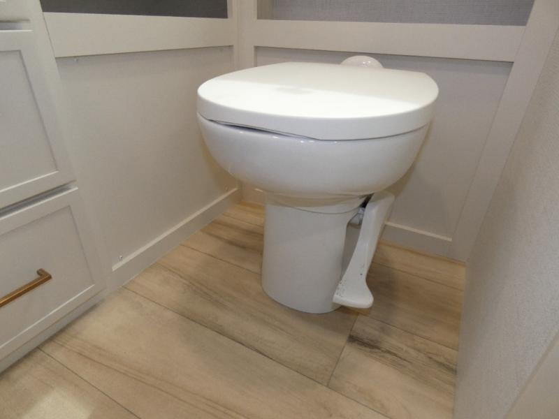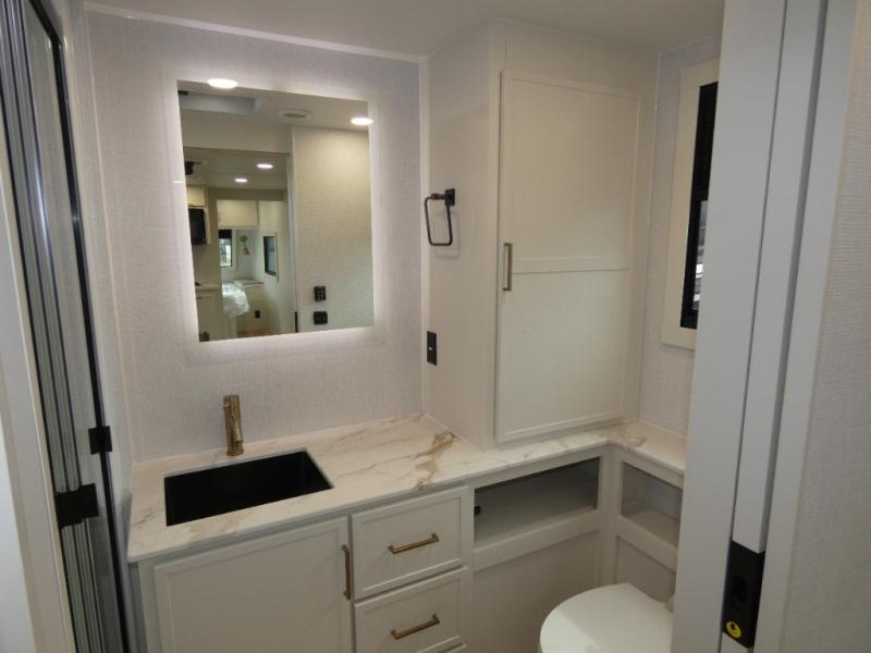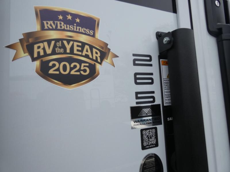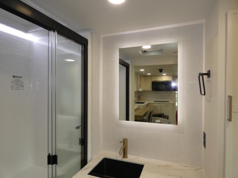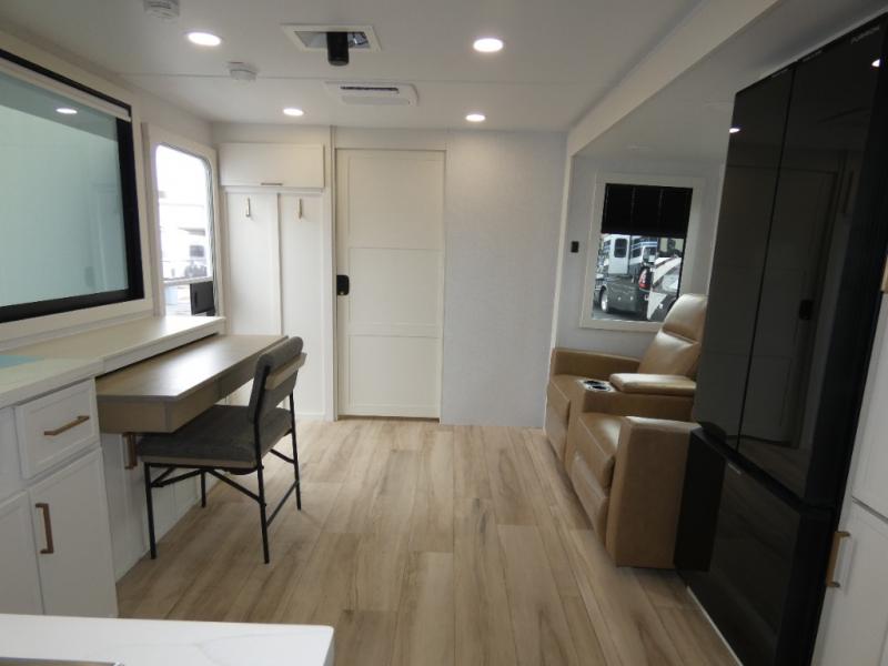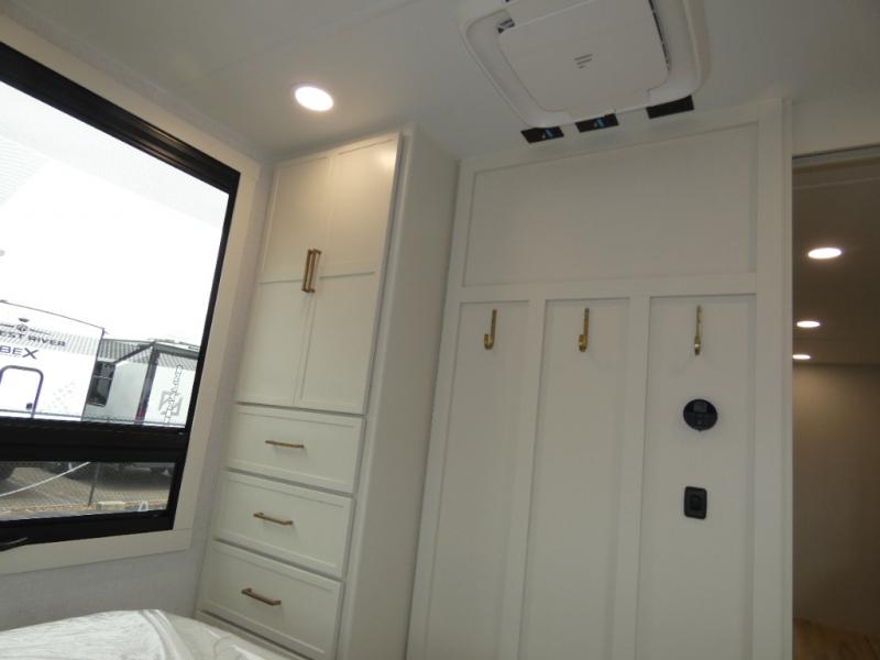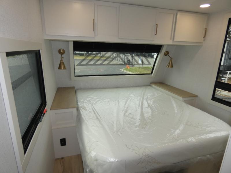 One look at this travel trailer and you'll be sold! The full rear bath features a spacious 30" x 42" shower with a glass shower door, built-in seat, and Maxxair fan to name a few comforts. The front private bedroom features a 66" x 80" king bed with a MaxSpace split-level wardrobe underneath to store shoes, clothes, and more! A slide out in the combined living area and kitchen makes your space more open, and you'll enjoy relaxing on the theater seating here in the evenings. There is also a 48" x 40" smart window with a screen that will allow you to view your indoor/outdoor projector screen for movies! The full kitchen includes a three burner stovetop, residential 30" convection microwave, 12 cu. ft. 12V refrigerator, plus a trash bin and Stow N' Go paper towel holder for added convenience. You can choose to eat outdoors under the 19' electric awning with LED lights or stay inside to dine at the pull-out dining table with a drawer for added storage!