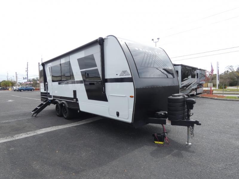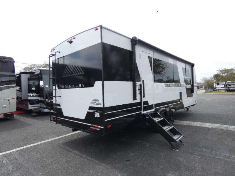 The lightweight Model I travel trailer by Brinkley is the perfect choice for those looking for an easy tow and at-home comforts! There is a drop-frame chassis, high-performance Road Armor suspension equalizer system, and Demco EZ Latch trailer coupler that automatically latches when dropped onto a hitch ball without the need of a safety pin. Additional exterior features include square Euro frameless windows, automotive-grade paint, full-width LED strip lighting in the pass-thru, and a pet & property security campside tie-down to keep your gear and furry friends safe. Inside, you'll be wowed by Brinkley's CraftSense wood trim construction, residential solid surface kitchen countertops, dimmable bedroom lights, and marine-grade neon LED shower lighting to name a few stand-out features!