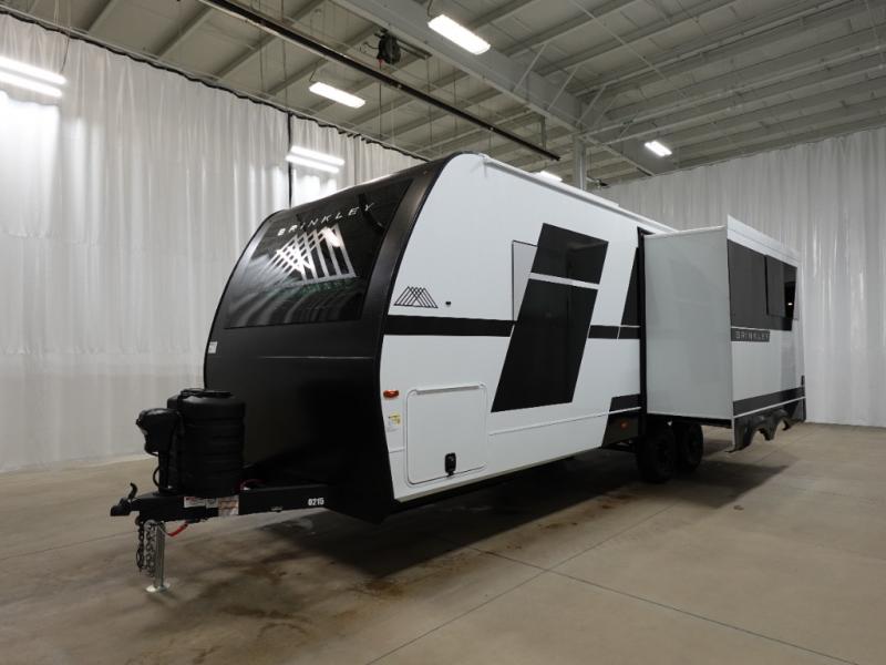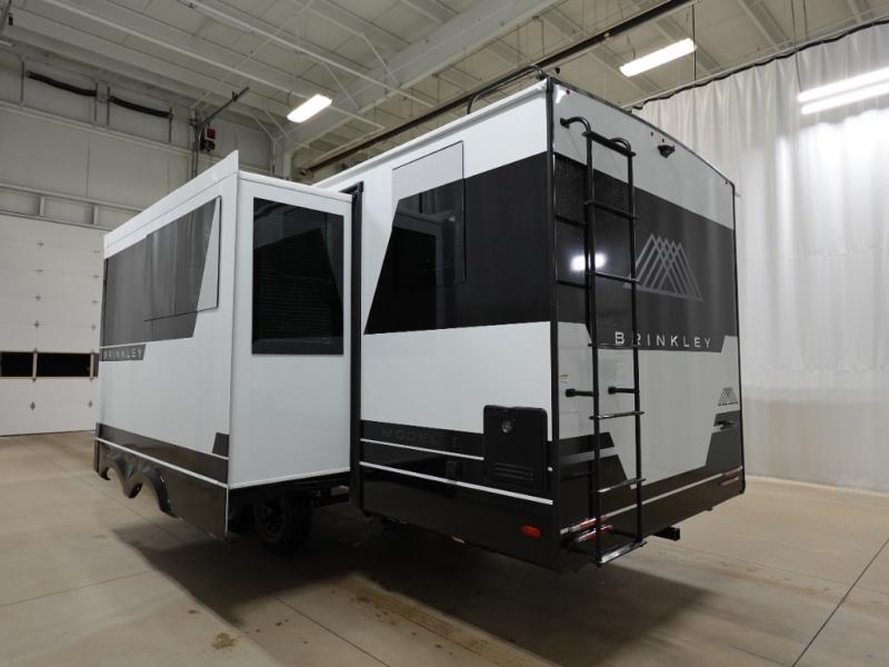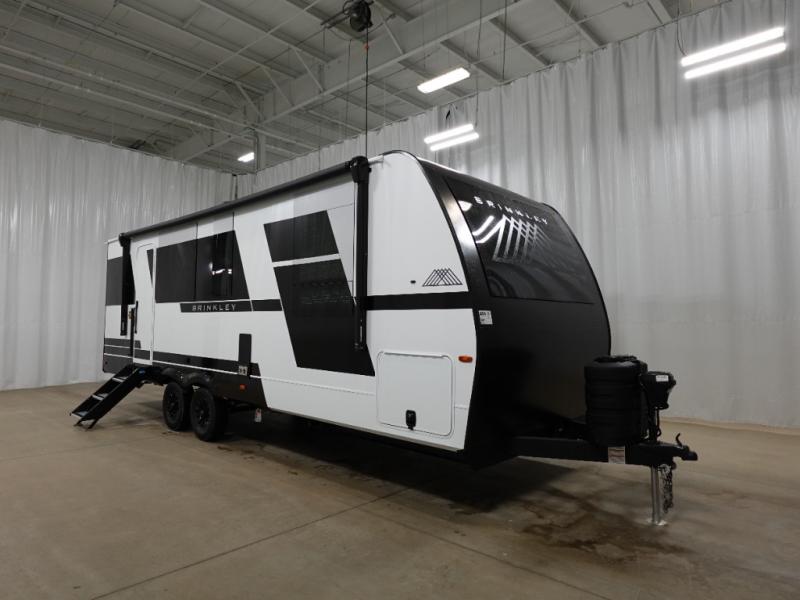 The lightweight Model I travel trailer by Brinkley is the perfect choice for those looking for an easy tow and at-home comforts! There is a drop-frame chassis, high-performance Road Armor suspension equalizer system, and Demco EZ Latch trailer coupler that automatically latches when dropped onto a hitch ball without the need of a safety pin. Additional exterior features include square Euro frameless windows, automotive-grade paint, full-width LED strip lighting in the pass-thru, and a pet & property security campside tie-down to keep your gear and furry friends safe. Inside, you'll be wowed by Brinkley's CraftSense wood trim construction, residential solid surface kitchen countertops, dimmable bedroom lights, and marine-grade neon LED shower lighting to name a few stand-out features!