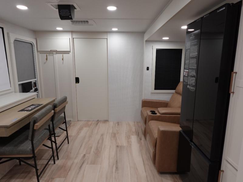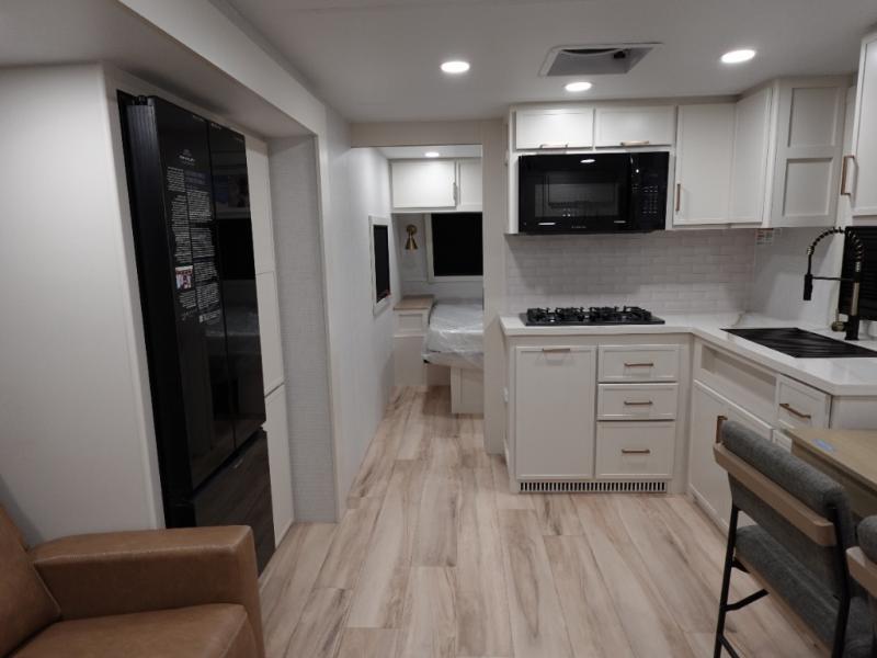 One look at this travel trailer and you'll be sold! The full rear bath features a spacious 42" x 30" shower with a built-in seat and Maxxair fan to name a few comforts. The front private bedroom features a 66" x 80" king bed with a MaxSpace Split-Level Wardrobe underneath to store shoes, clothes, and more! A slide out in the combined living area and kitchen makes your space more open, and you'll enjoy relaxing on the theater seating here in the evenings. The full kitchen includes a three burner stovetop, residential 30" convection microwave, 12 cu. ft. 12V refrigerator, plus a trash bin and Stow N' Go paper towel holder for added convenience. You can choose to eat outdoors under the 19' electric awning with LED lights or stay inside to dine at the pull-out dining table with a drawer for added storage!