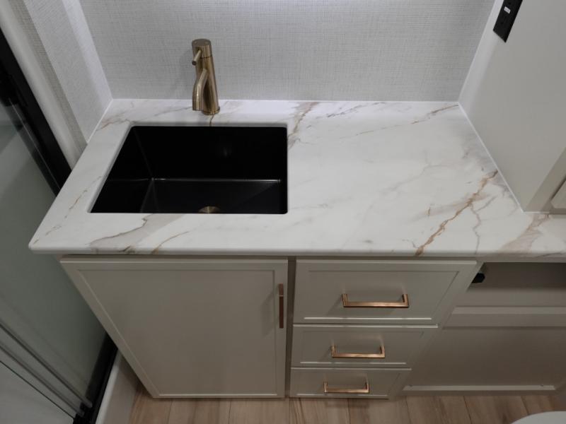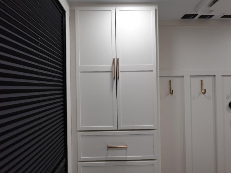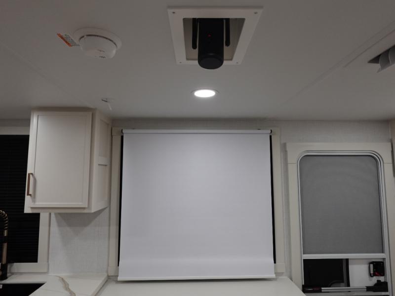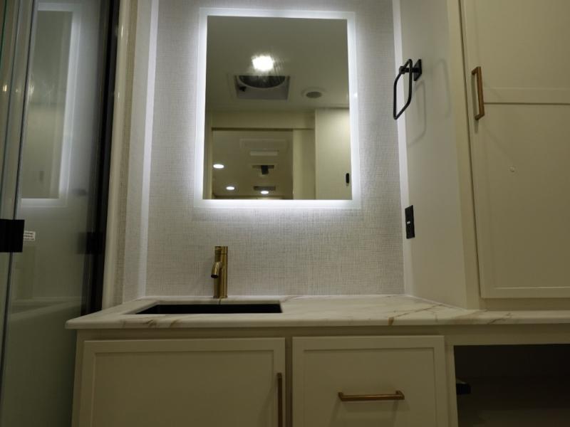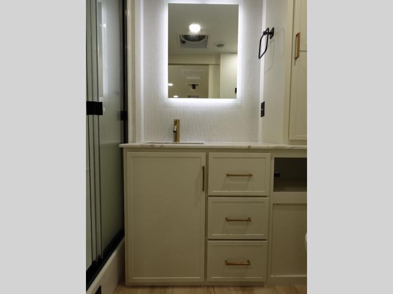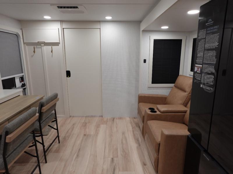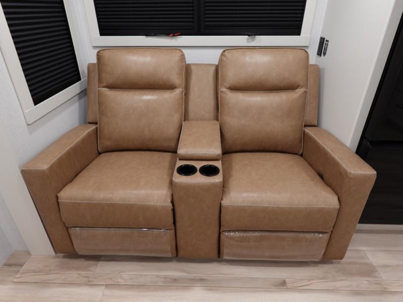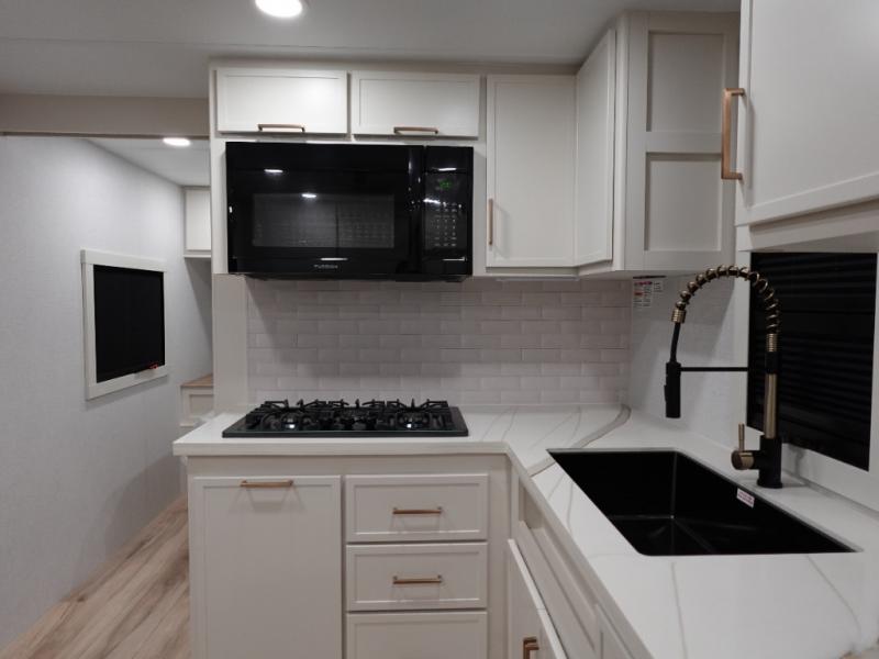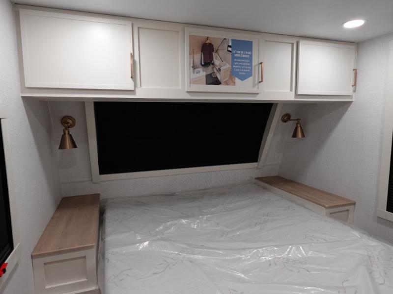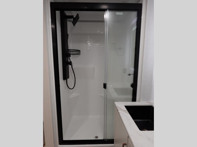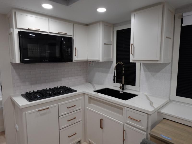 One look at this travel trailer and you'll be sold! The full rear bath features a spacious 42" x 30" shower with a built-in seat and Maxxair fan to name a few comforts. The front private bedroom features a 66" x 80" king bed with a MaxSpace Split-Level Wardrobe underneath to store shoes, clothes, and more! A slide out in the combined living area and kitchen makes your space more open, and you'll enjoy relaxing on the theater seating here in the evenings. The full kitchen includes a three burner stovetop, residential 30" convection microwave, 12 cu. ft. 12V refrigerator, plus a trash bin and Stow N' Go paper towel holder for added convenience. You can choose to eat outdoors under the 19' electric awning with LED lights or stay inside to dine at the pull-out dining table with a drawer for added storage!