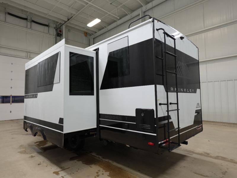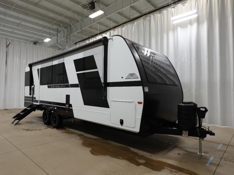 The lightweight Model I travel trailer by Brinkley is the perfect choice for those looking for an easy tow and at-home comforts! There is a drop-frame chassis, high-performance Road Armor suspension equalizer system, and Demco EZ Latch trailer coupler that automatically latches when dropped onto a hitch ball without the need of a safety pin. Additional exterior features include square Euro frameless windows, automotive-grade paint, full-width LED strip lighting in the pass-thru, and a pet & property security campside tie-down to keep your gear and furry friends safe. Inside, you'll be wowed by Brinkley's CraftSense wood trim construction, residential solid surface kitchen countertops, dimmable bedroom lights, and marine-grade neon LED shower lighting to name a few stand-out features!