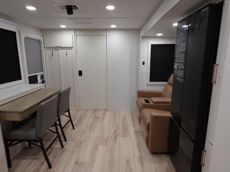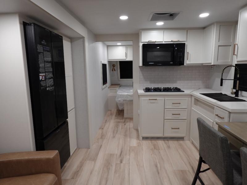 One look at this travel trailer and you'll be sold! The full rear bath features a spacious 42" x 30" shower with a built-in seat and Maxxair fan to name a few comforts. The front private bedroom features a 66" x 80" king bed with a MaxSpace Split-Level Wardrobe underneath to store shoes, clothes, and more! A slide out in the combined living area and kitchen makes your space more open, and you'll enjoy relaxing on the theater seating here in the evenings. The full kitchen includes a three burner stovetop, residential 30" convection microwave, 12 cu. ft. 12V refrigerator, plus a trash bin and Stow N' Go paper towel holder for added convenience. You can choose to eat outdoors under the 19' electric awning with LED lights or stay inside to dine at the pull-out dining table with a drawer for added storage!