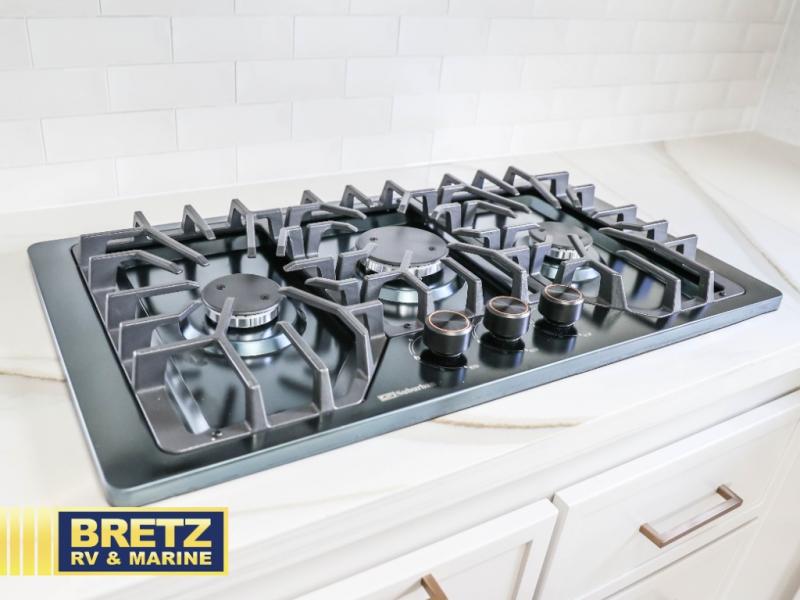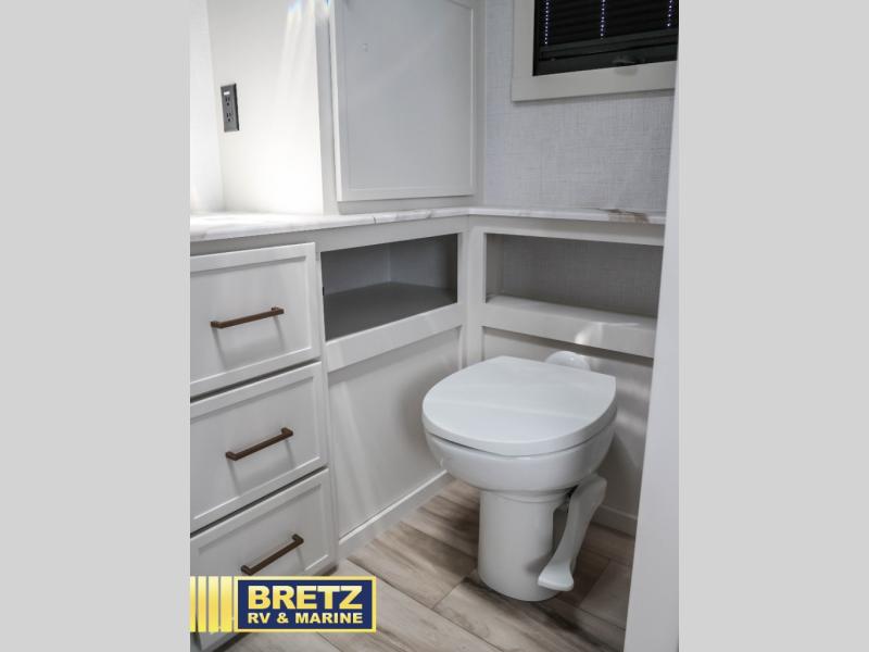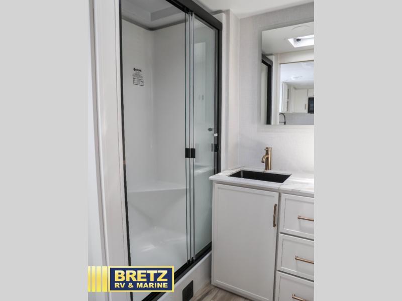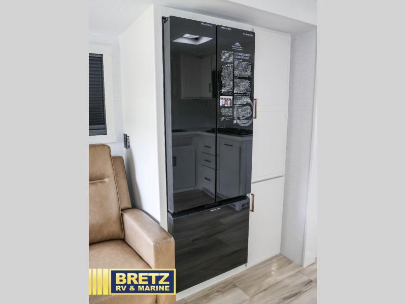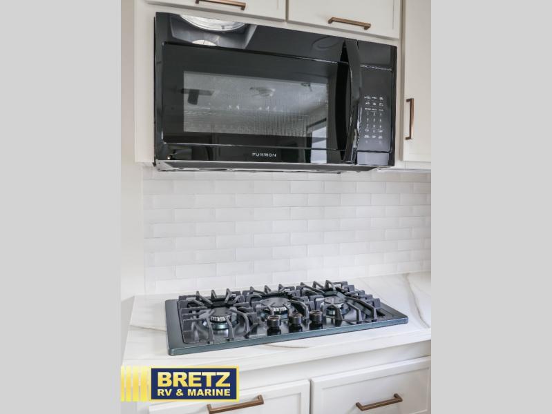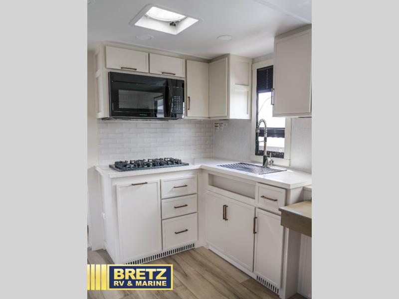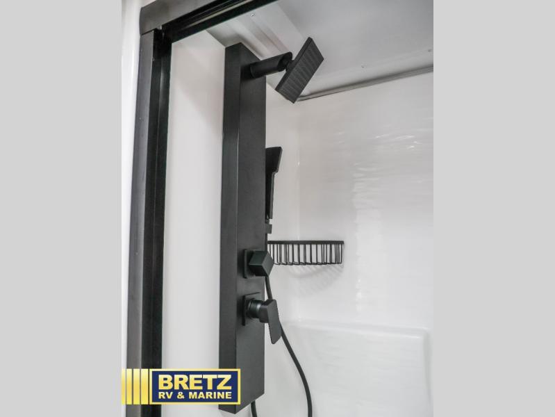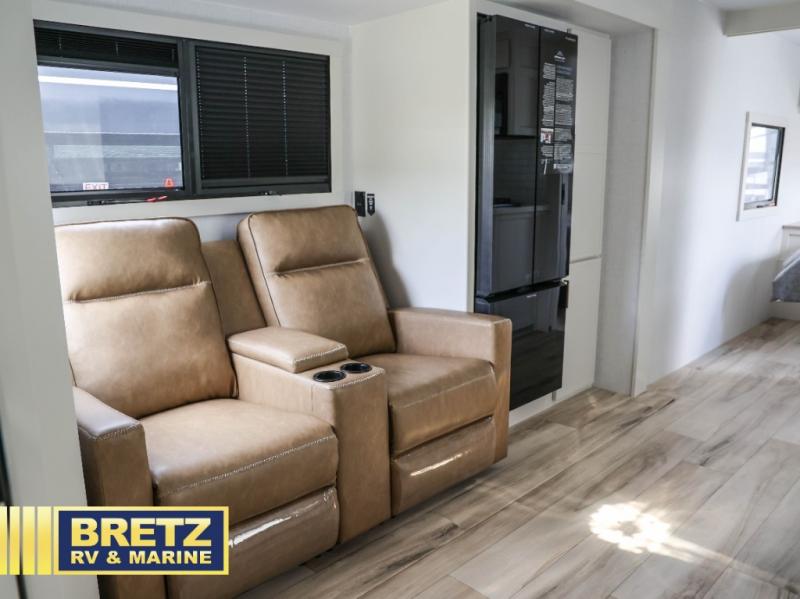 One look at this travel trailer and you'll be sold! The full rear bath features a spacious 42" x 30" shower with a built-in seat and Maxxair fan to name a few comforts. The front private bedroom features a 66" x 80" king bed with a MaxSpace Split-Level Wardrobe underneath to store shoes, clothes, and more! A slide out in the combined living area and kitchen makes your space more open, and you'll enjoy relaxing on the theater seating here in the evenings. The full kitchen includes a three burner stovetop, residential 30" convection microwave, 12 cu. ft. 12V refrigerator, plus a trash bin and Stow N' Go paper towel holder for added convenience. You can choose to eat outdoors under the 19' electric awning with LED lights or stay inside to dine at the pull-out dining table with a drawer for added storage! And if you're needing more sleeping space, just choose the optional tri-fold sofa in place of the theater seating!