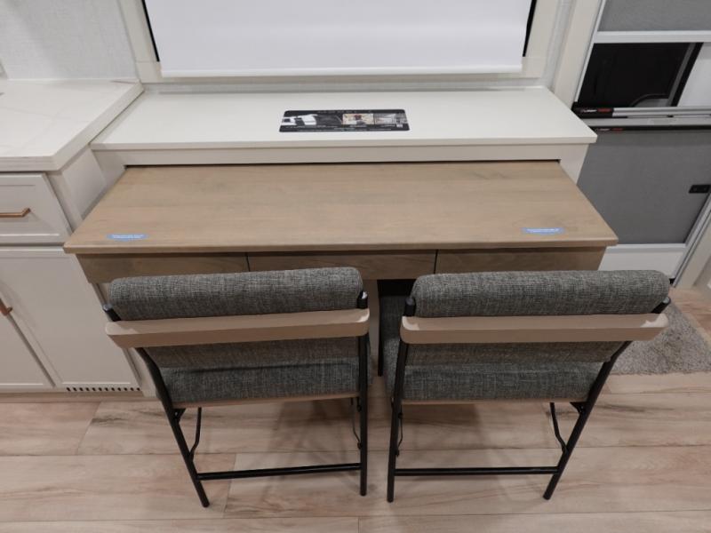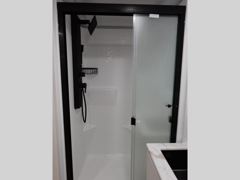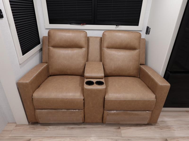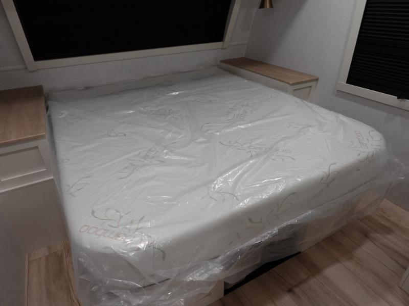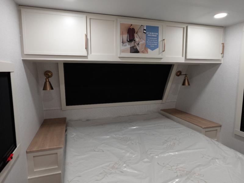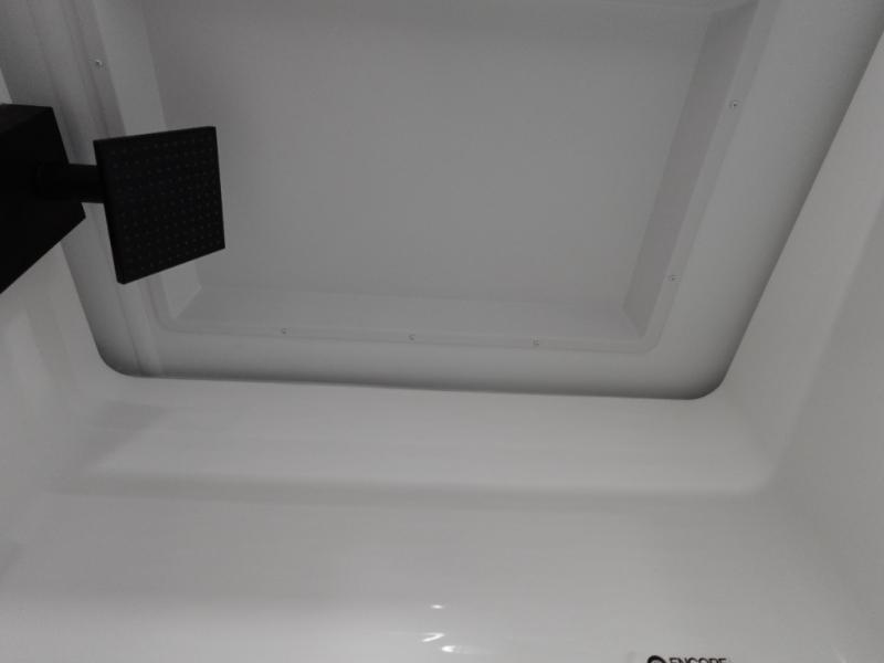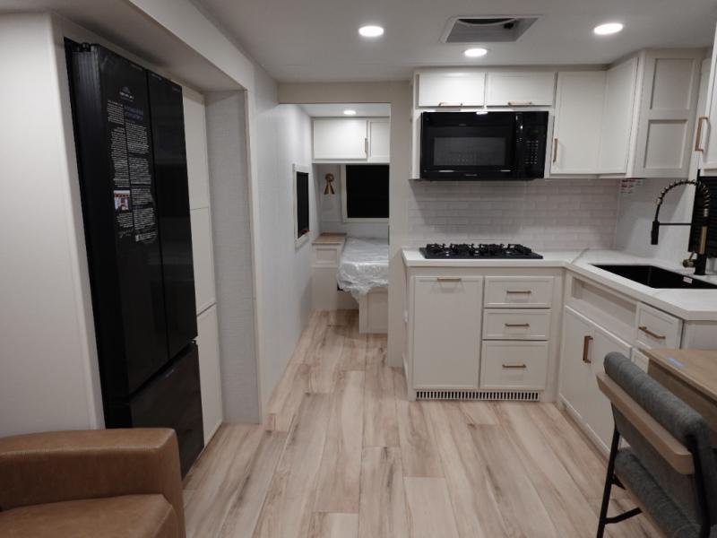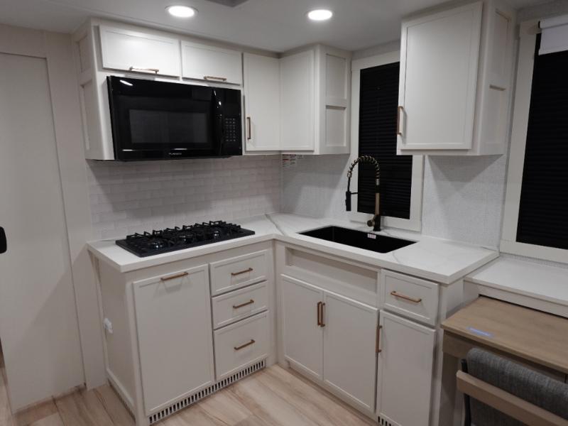 One look at this travel trailer and you'll be sold! The full rear bath features a spacious 42" x 30" shower with a built-in seat and Maxxair fan to name a few comforts. The front private bedroom features a 66" x 80" king bed with a MaxSpace Split-Level Wardrobe underneath to store shoes, clothes, and more! A slide out in the combined living area and kitchen makes your space more open, and you'll enjoy relaxing on the theater seating here in the evenings. The full kitchen includes a three burner stovetop, residential 30" convection microwave, 12 cu. ft. 12V refrigerator, plus a trash bin and Stow N' Go paper towel holder for added convenience. You can choose to eat outdoors under the 19' electric awning with LED lights or stay inside to dine at the pull-out dining table with a drawer for added storage!