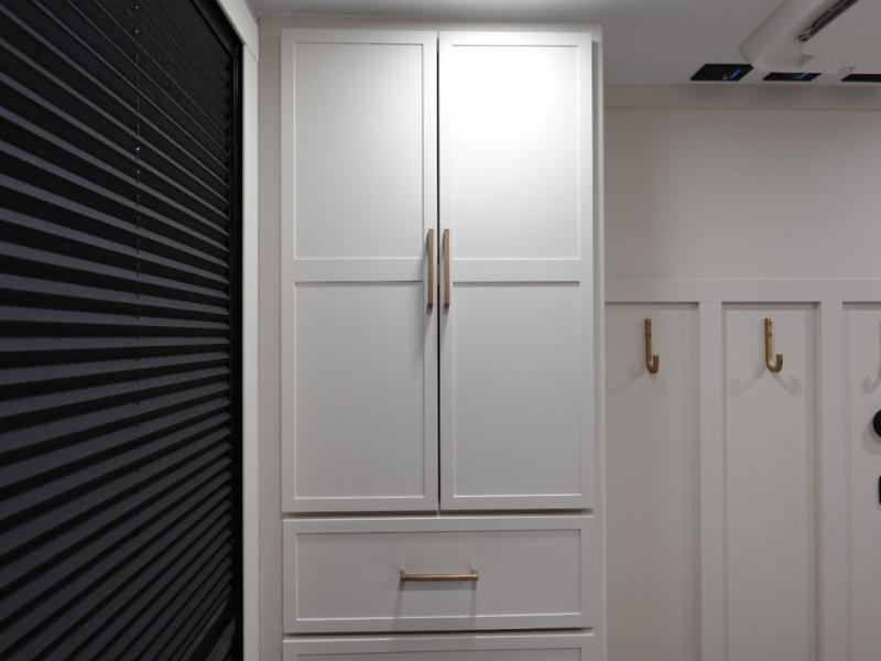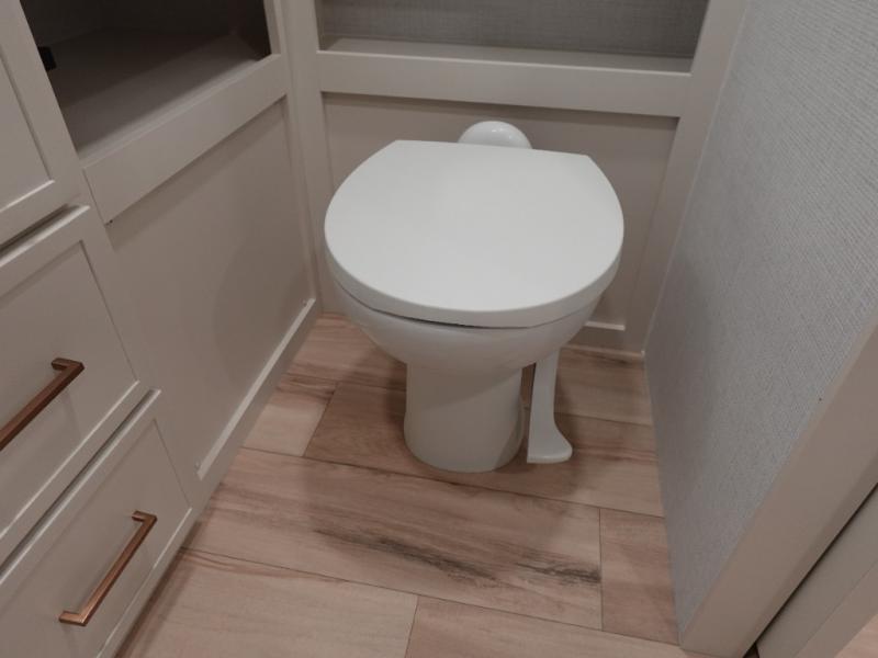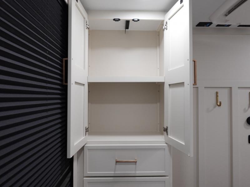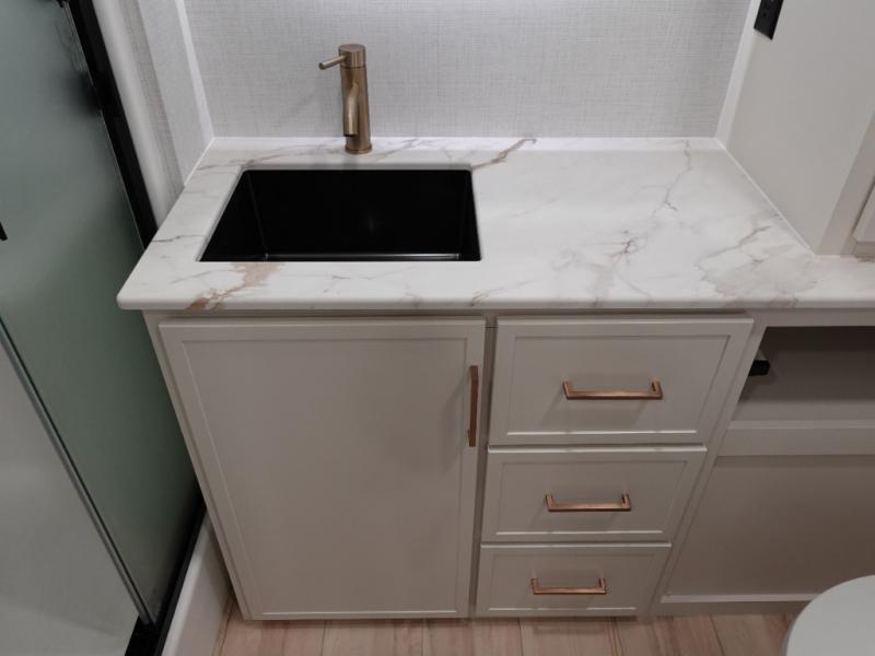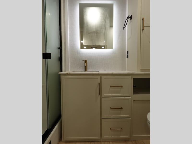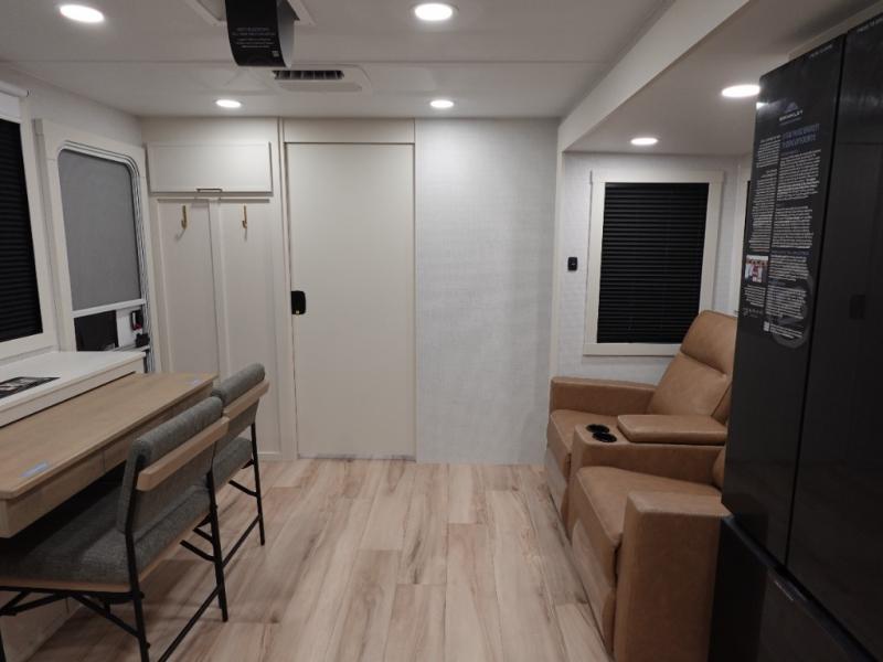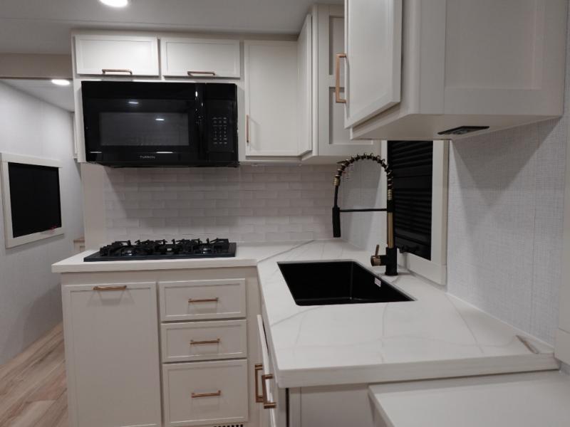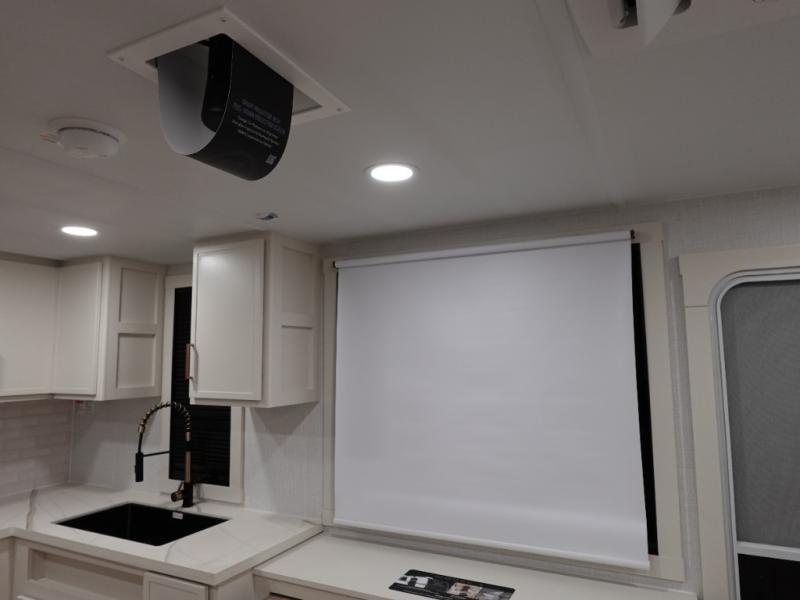 One look at this travel trailer and you'll be sold! The full rear bath features a spacious 42" x 30" shower with a built-in seat and Maxxair fan to name a few comforts. The front private bedroom features a 66" x 80" king bed with a MaxSpace Split-Level Wardrobe underneath to store shoes, clothes, and more! A slide out in the combined living area and kitchen makes your space more open, and you'll enjoy relaxing on the theater seating here in the evenings. The full kitchen includes a three burner stovetop, residential 30" convection microwave, 12 cu. ft. 12V refrigerator, plus a trash bin and Stow N' Go paper towel holder for added convenience. You can choose to eat outdoors under the 19' electric awning with LED lights or stay inside to dine at the pull-out dining table with a drawer for added storage!