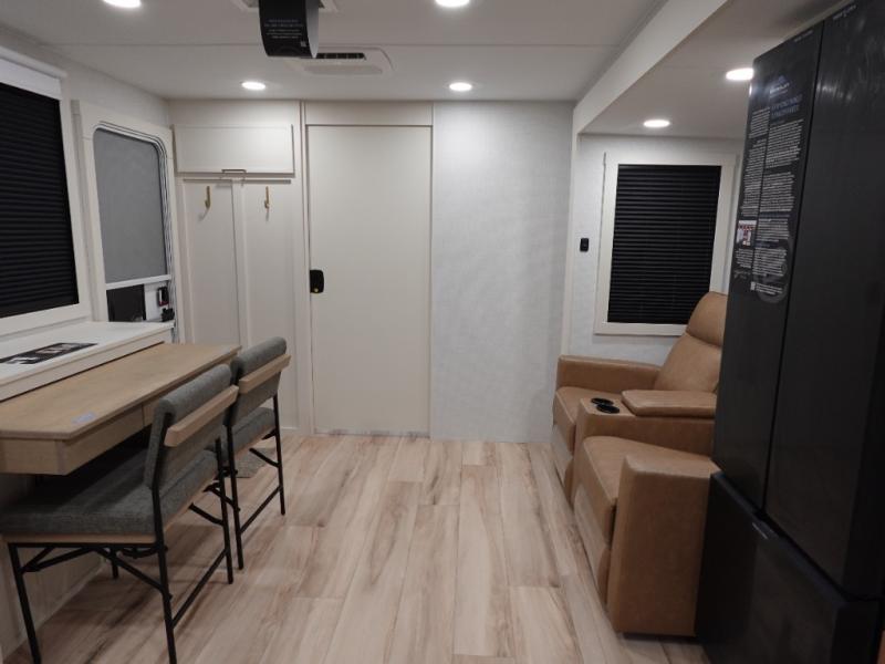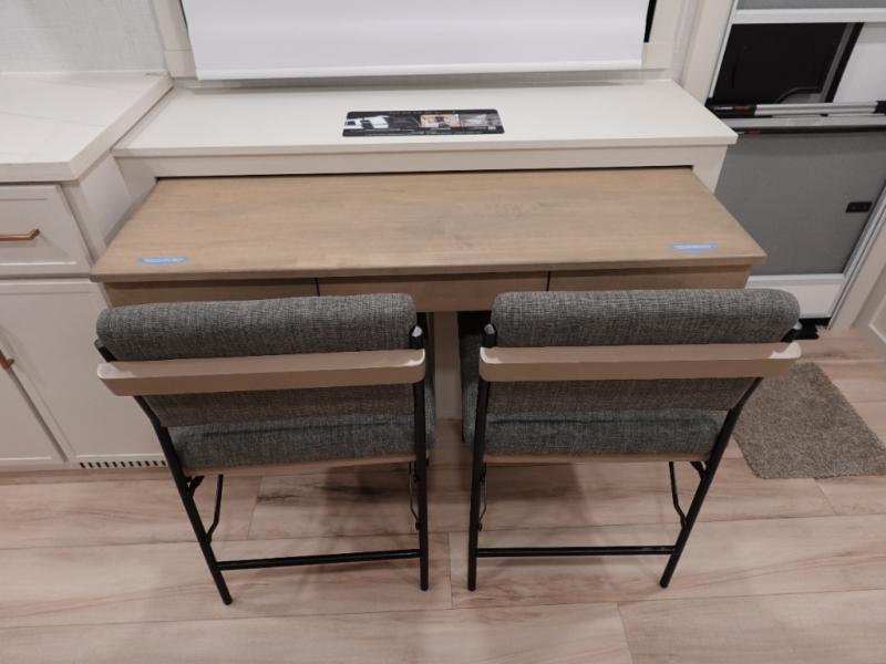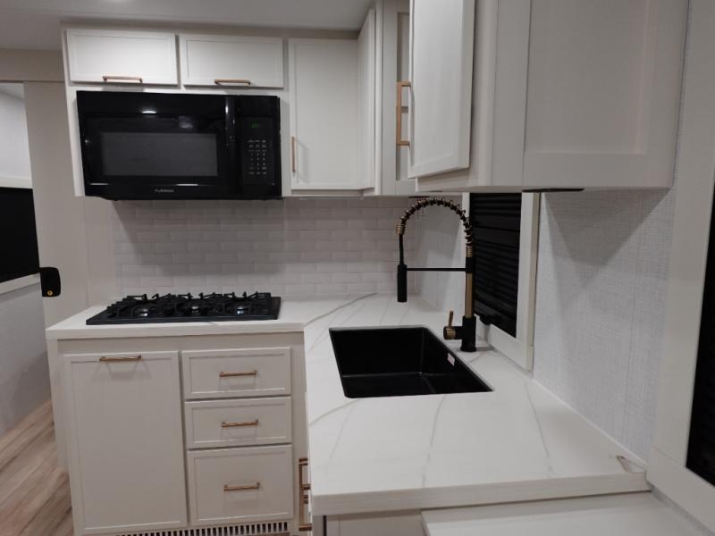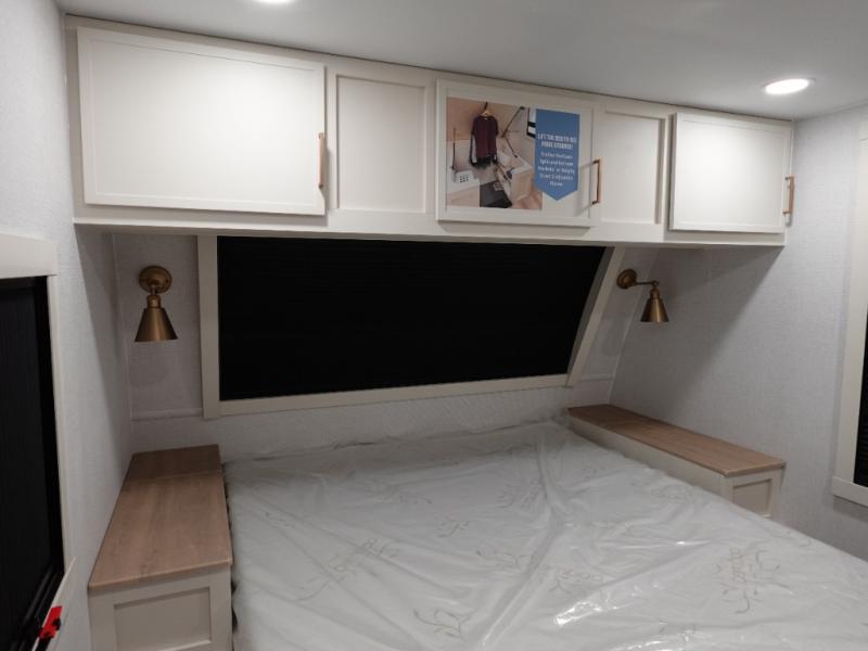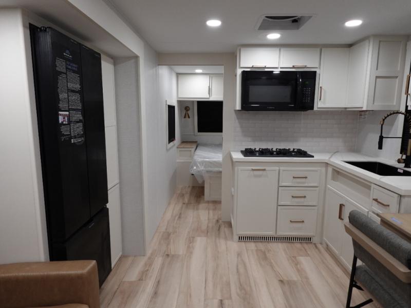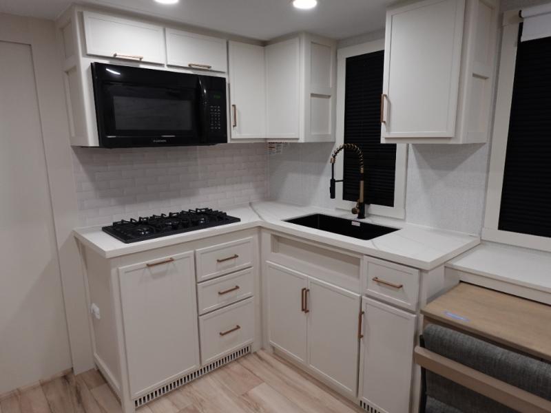 One look at this travel trailer and you'll be sold! The full rear bath features a spacious 42" x 30" shower with a built-in seat and Maxxair fan to name a few comforts. The front private bedroom features a 66" x 80" king bed with a MaxSpace Split-Level Wardrobe underneath to store shoes, clothes, and more! A slide out in the combined living area and kitchen makes your space more open, and you'll enjoy relaxing on the theater seating here in the evenings. The full kitchen includes a three burner stovetop, residential 30" convection microwave, 12 cu. ft. 12V refrigerator, plus a trash bin and Stow N' Go paper towel holder for added convenience. You can choose to eat outdoors under the 19' electric awning with LED lights or stay inside to dine at the pull-out dining table with a drawer for added storage!